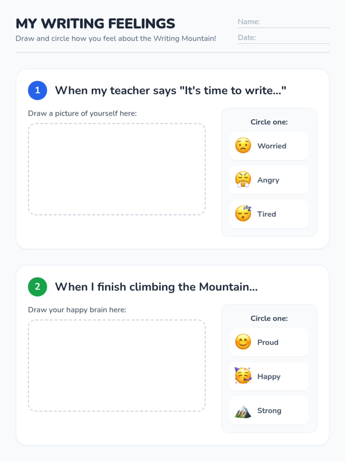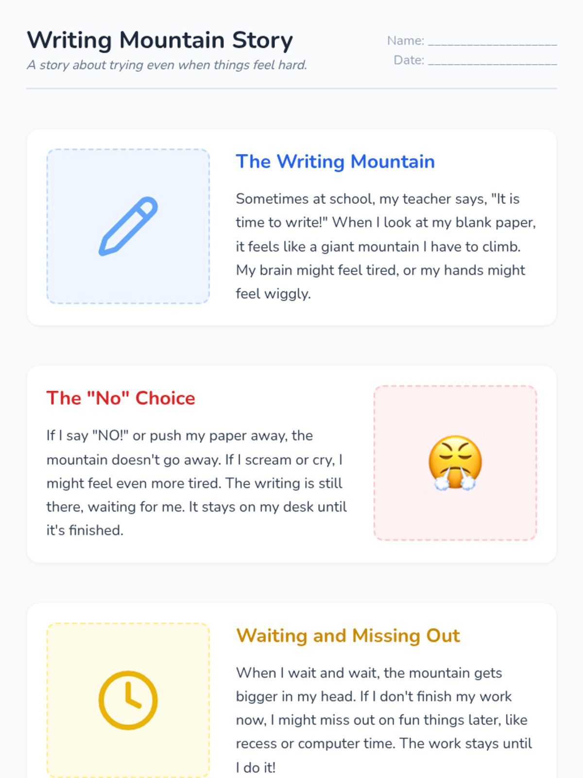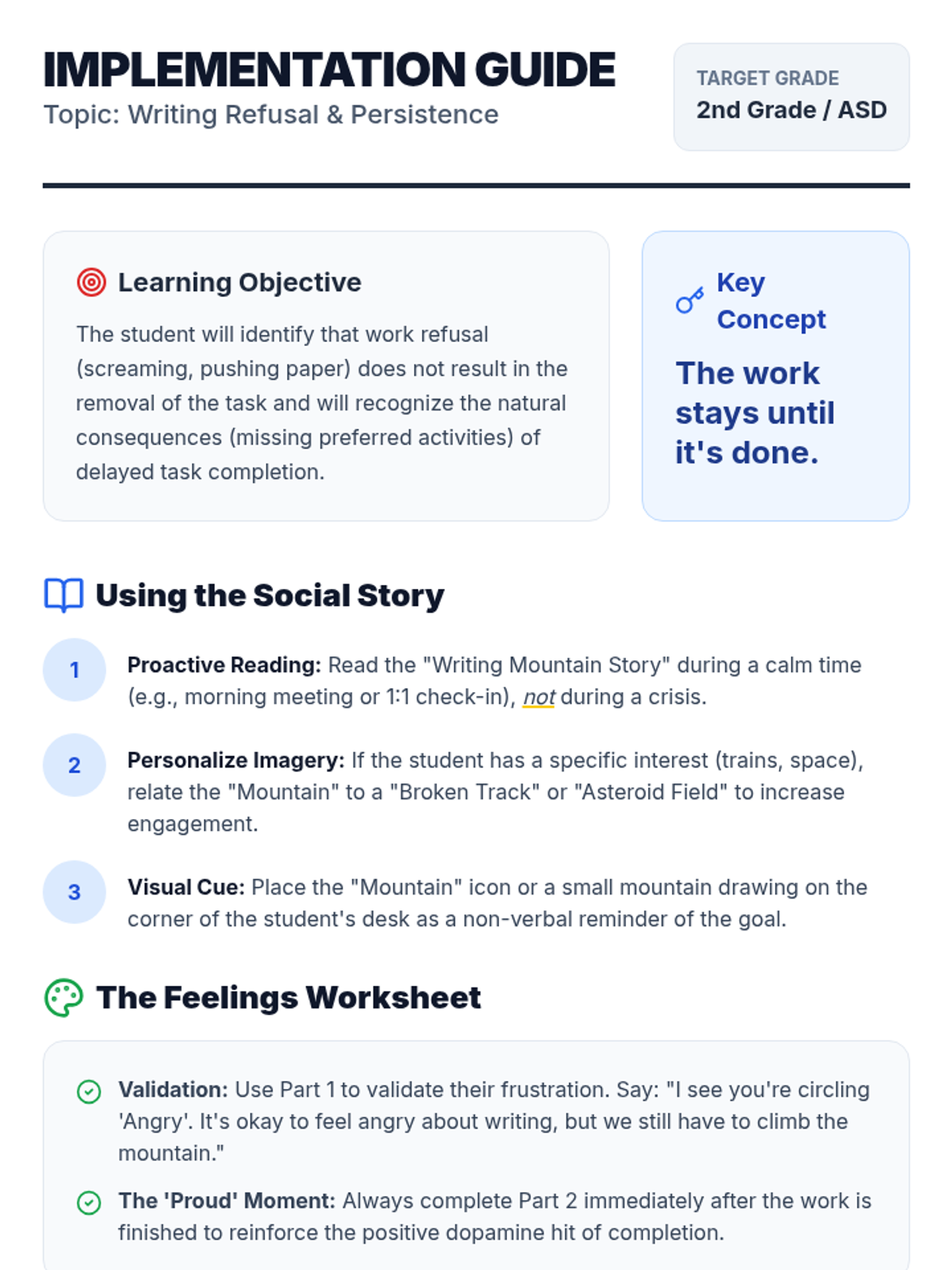 A social story and supporting materials designed for a 2nd-grade student with Autism to address writing refusal and the persistence of tasks. The lesson includes a narrative story, a visual feelings worksheet, and a teacher guide for implementation.