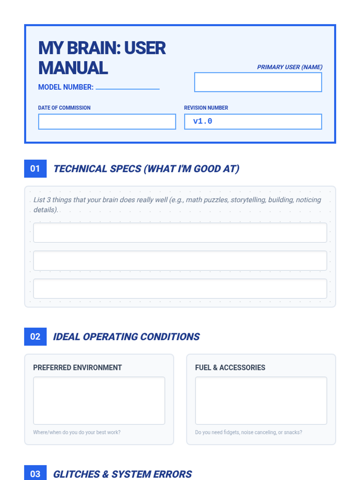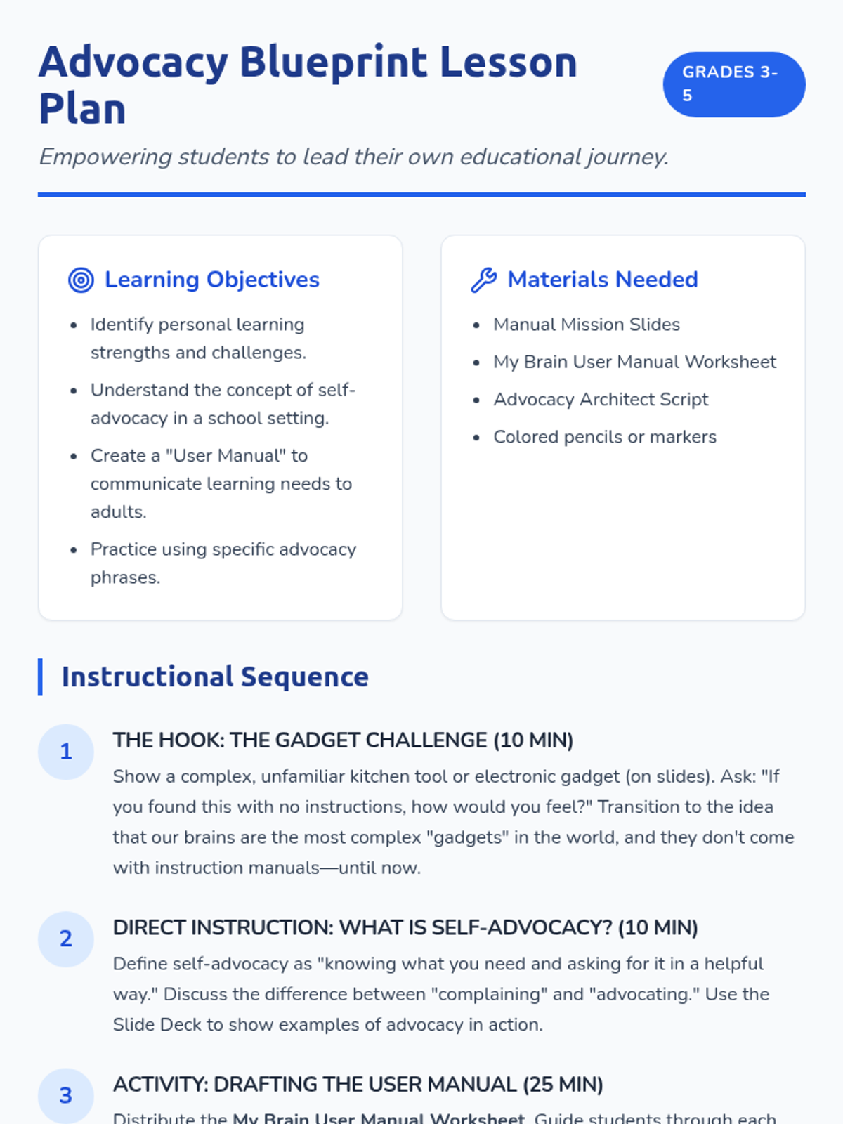 A lesson designed to empower students in grades 3-5 to understand their unique learning needs and advocate for themselves by creating a 'User Manual' for their brains.