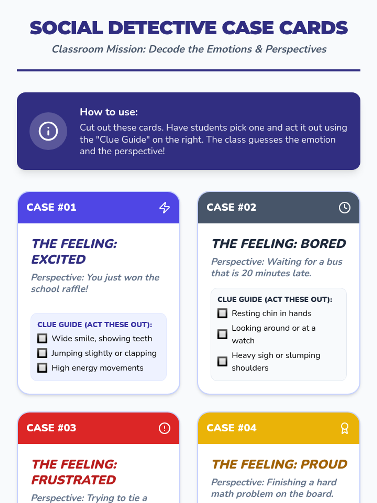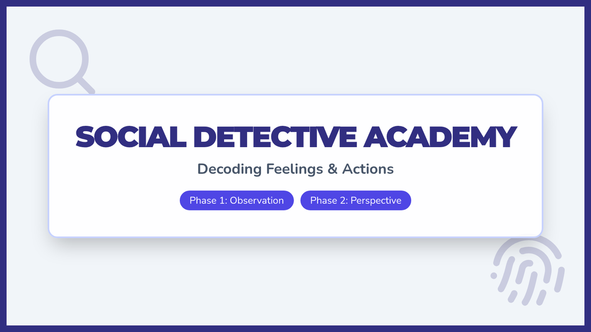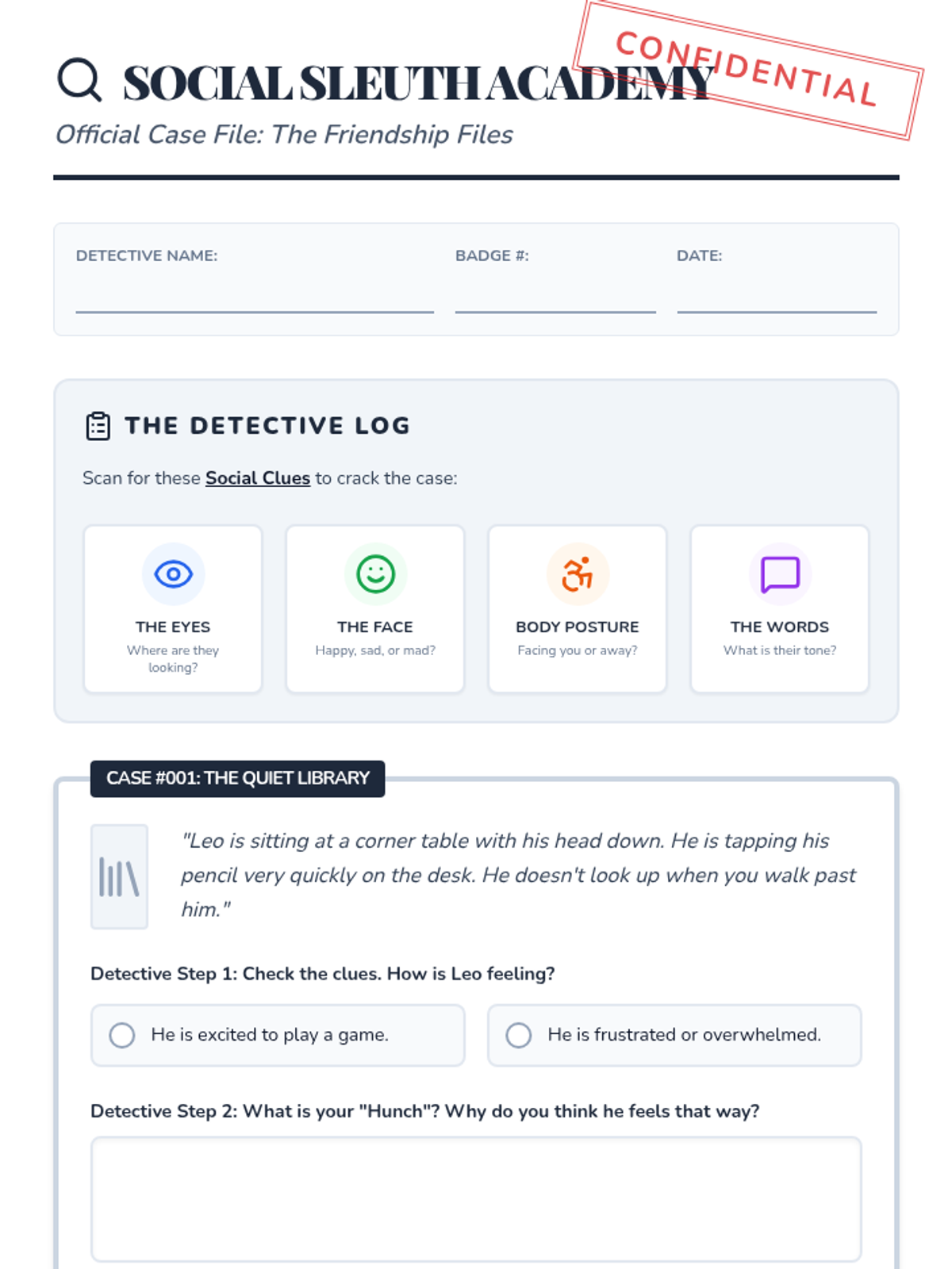 A detective-themed lesson designed to help students with social pragmatics delays practice perspective-taking, reading non-verbal cues, and conflict resolution through 'social cases'.
