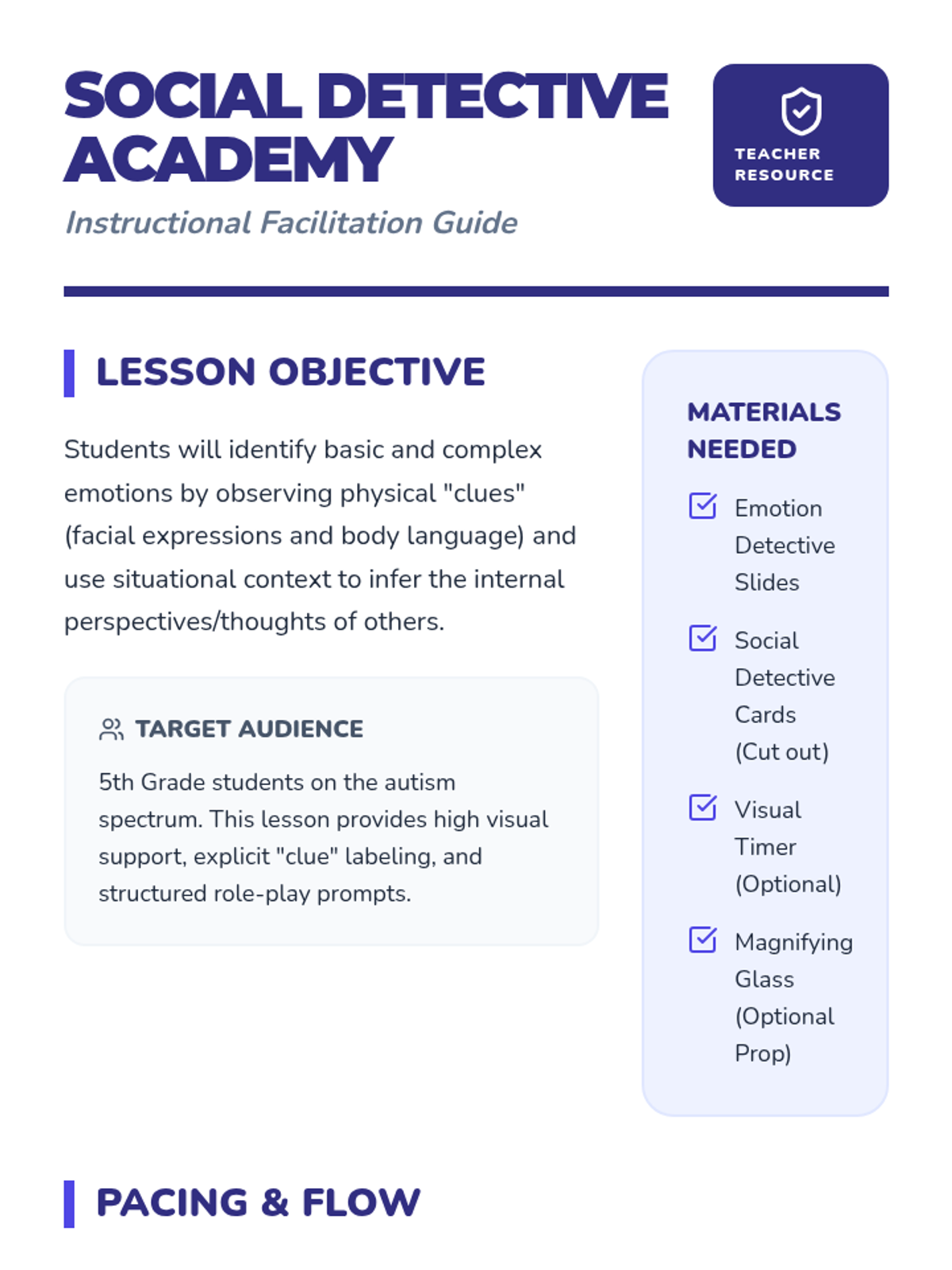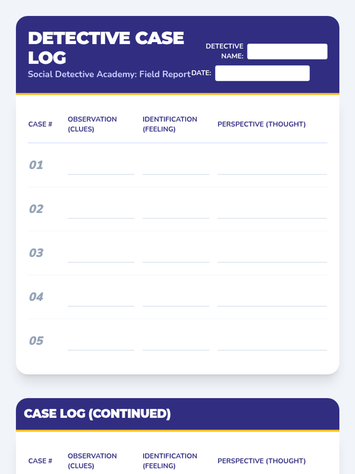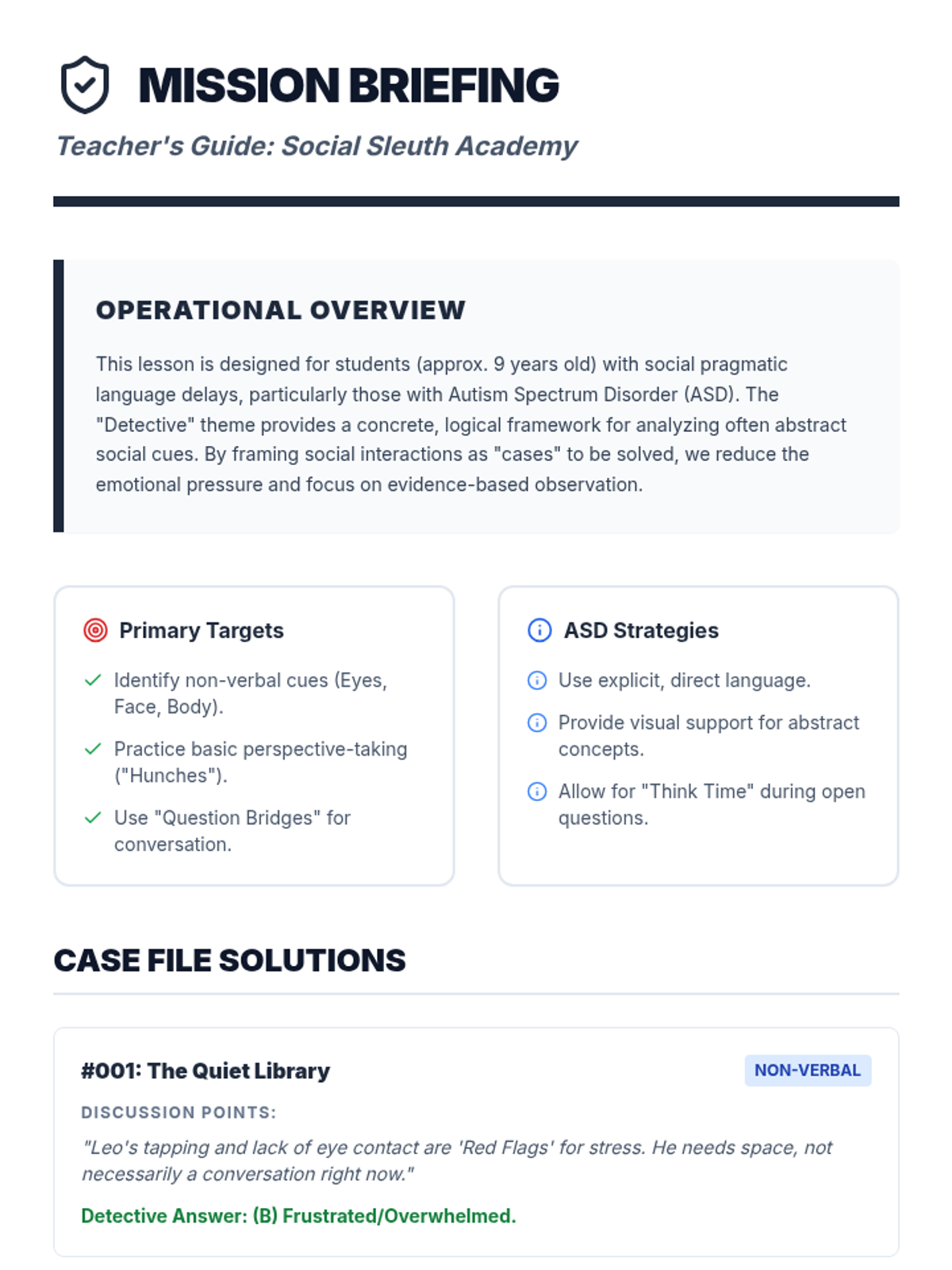 A detective-themed lesson designed to help students with social pragmatics delays practice perspective-taking, reading non-verbal cues, and conflict resolution through 'social cases'.