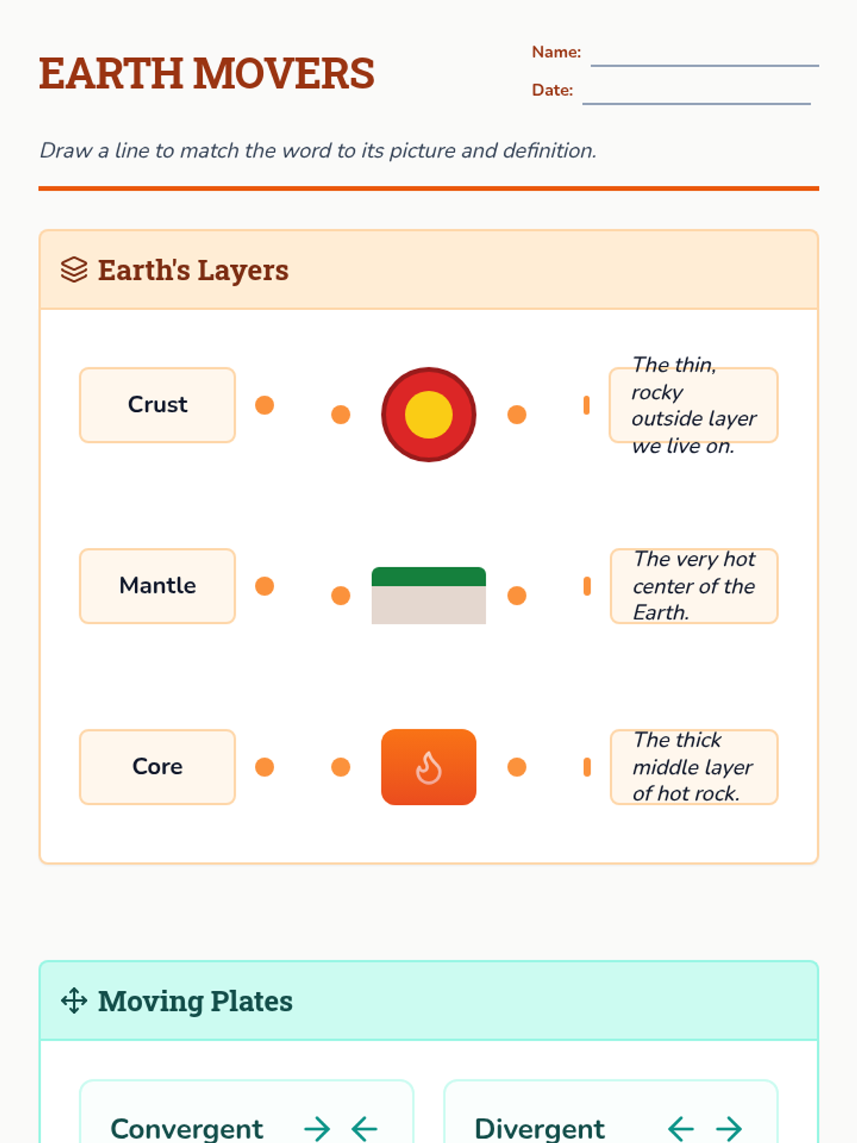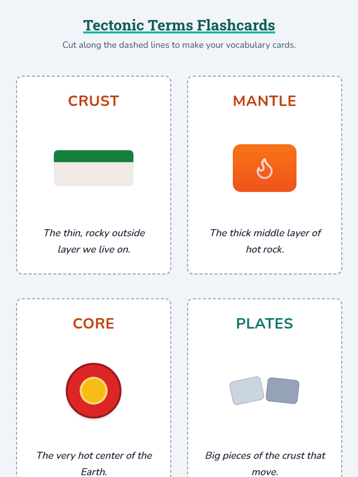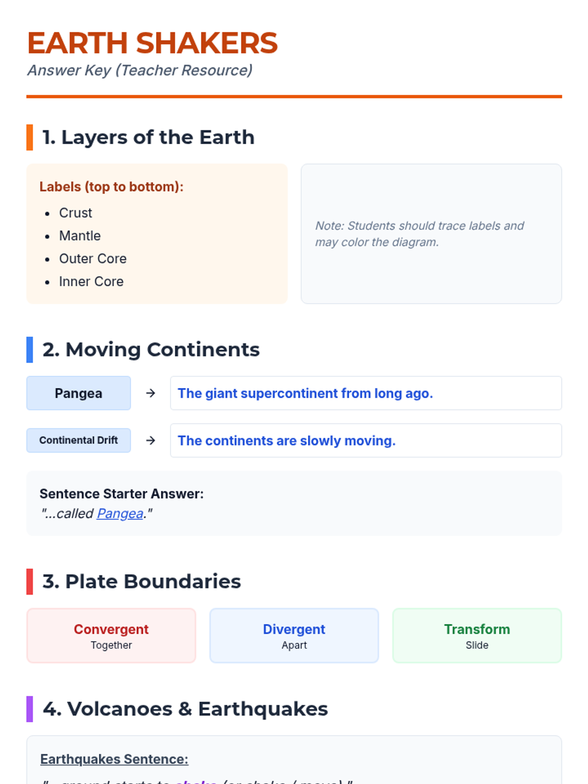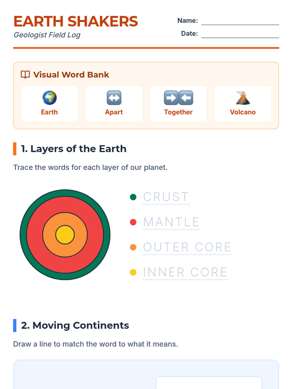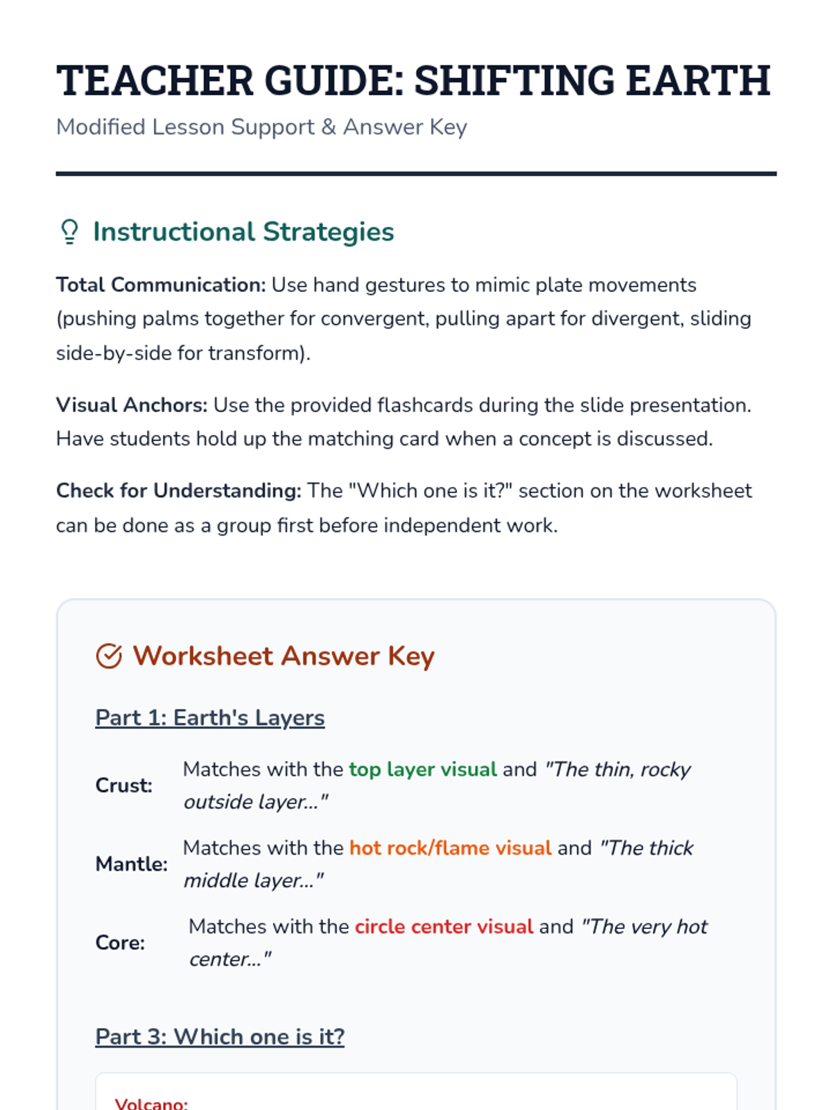 A modified lesson on plate tectonics featuring visual supports for understanding Earth's layers, plate boundaries, and continental drift. Ideal for students who benefit from pictorial cues and simplified vocabulary.