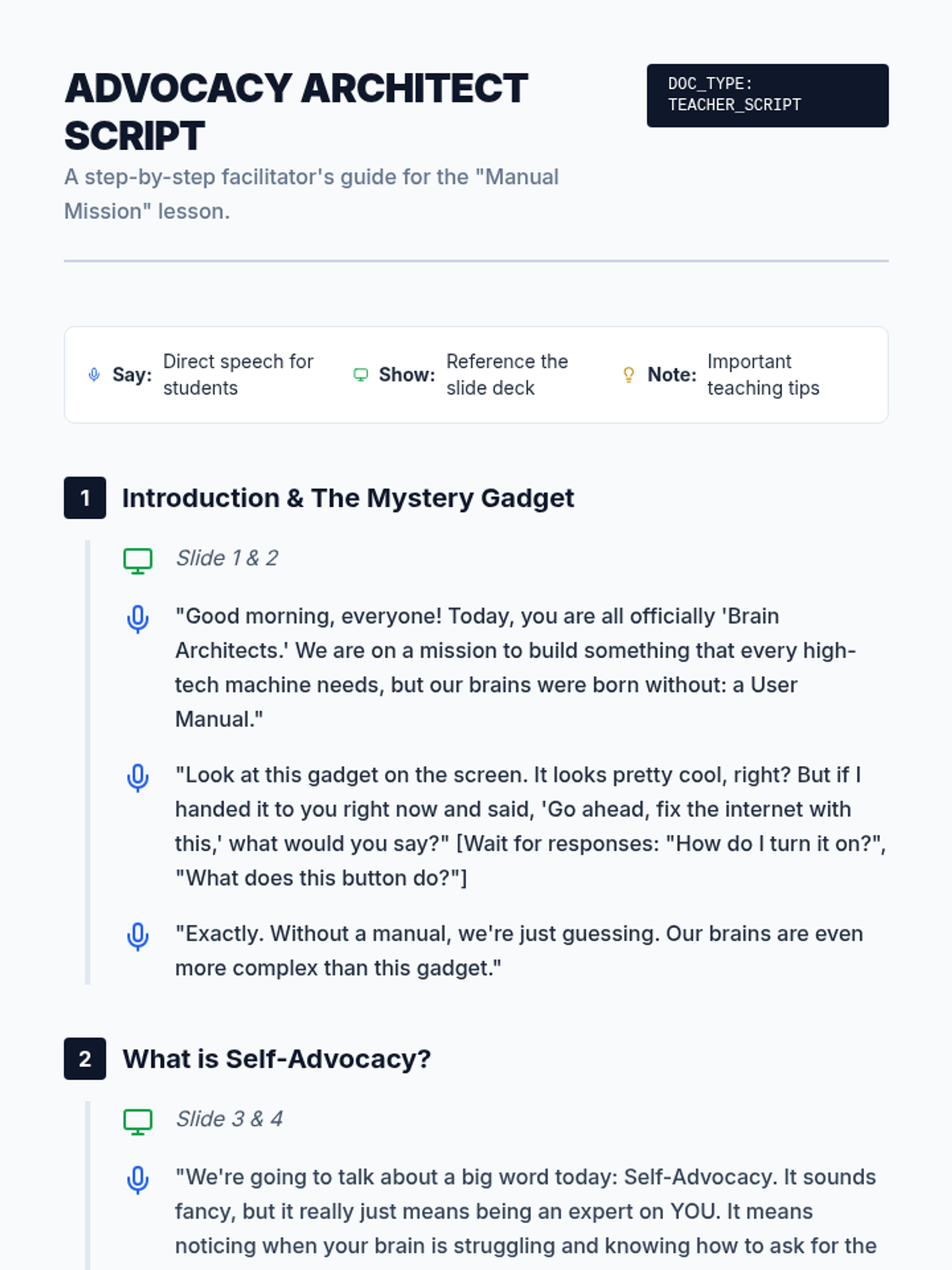 A comprehensive self-advocacy curriculum designed for young adults to navigate school, home, community, and the workplace with confidence. Focuses on personal identity (pronouns), legal rights (ADA/IDEA), and practical communication strategies.