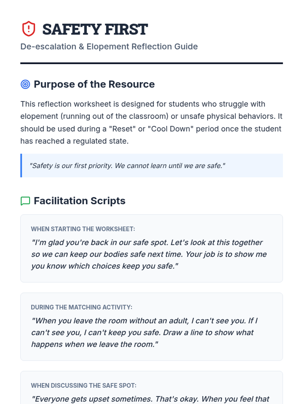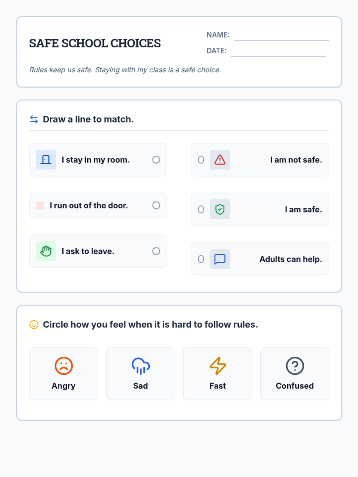 A focused lesson designed to help students understand the importance of staying in their designated classroom area and following safety protocols to prevent elopement.