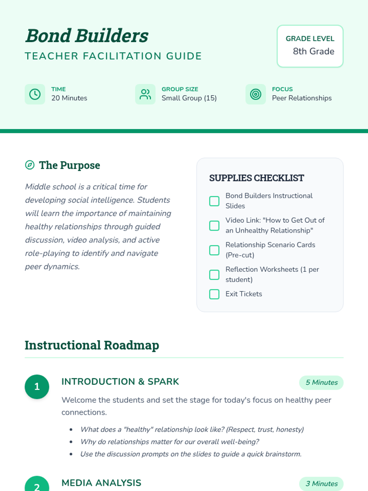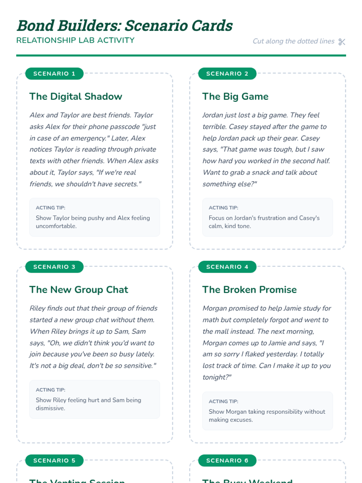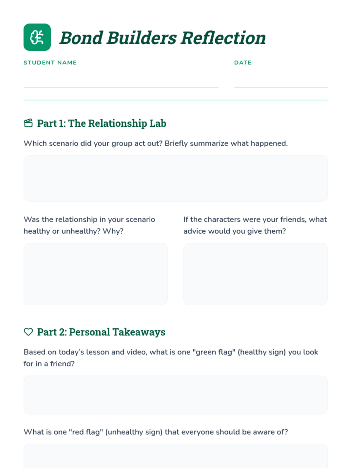 Students explore the dynamics of healthy vs. unhealthy relationships through discussion, a video analysis, and hands-on role-playing scenarios to build interpersonal confidence.