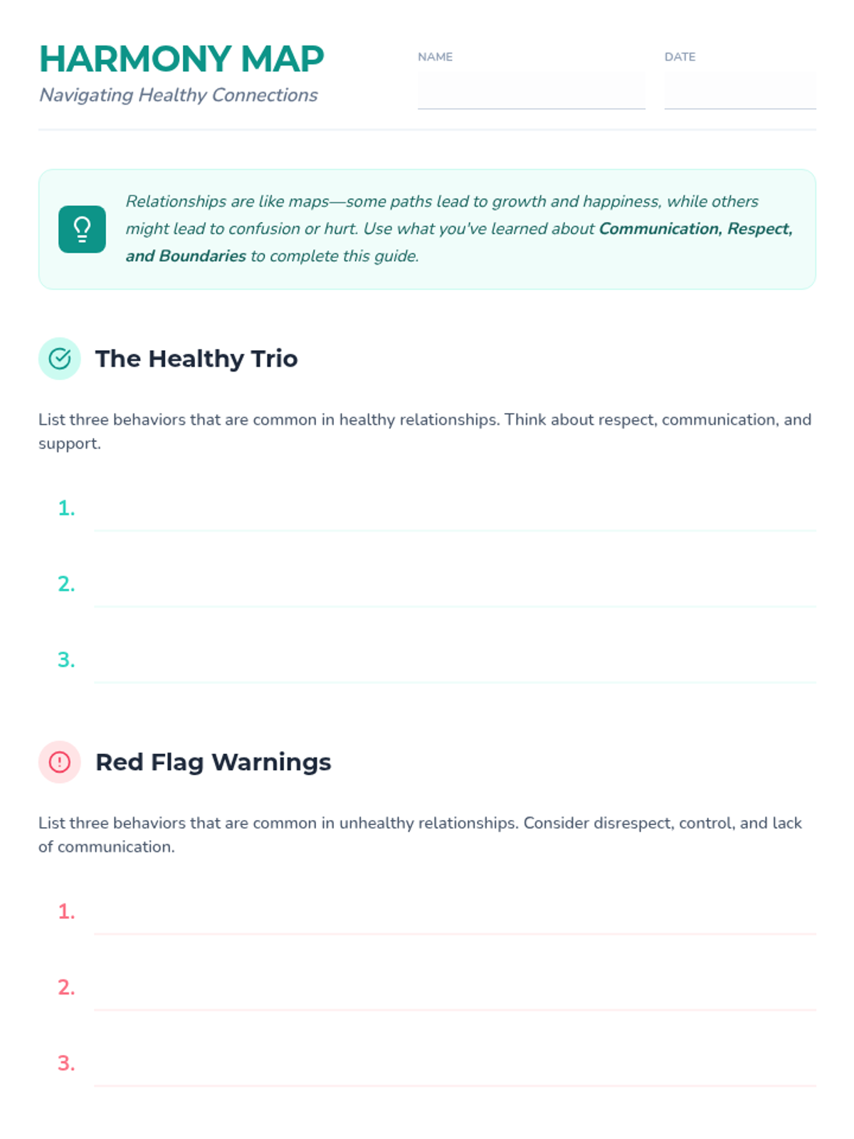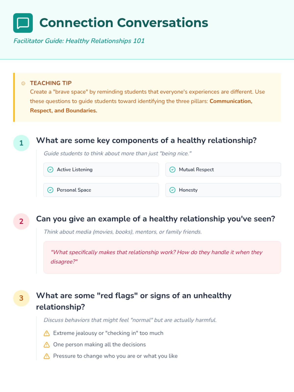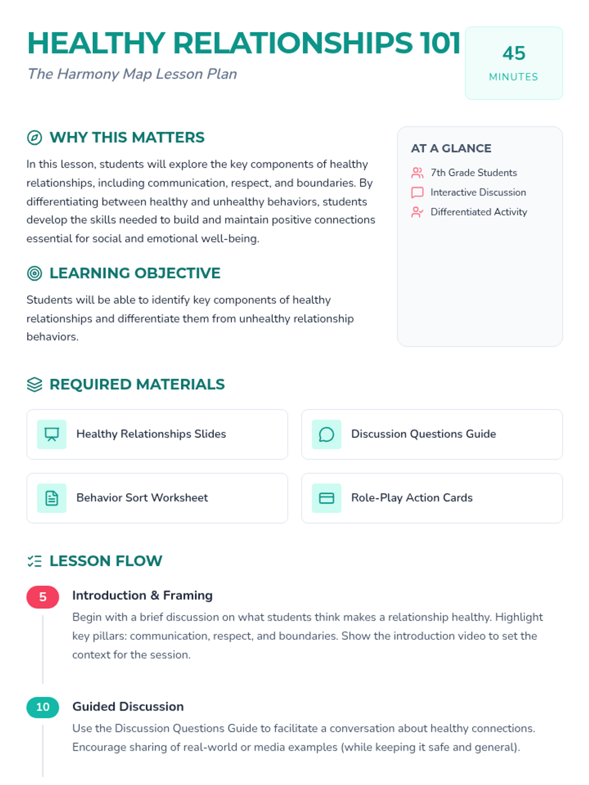A comprehensive lesson for 7th-grade students on identifying healthy relationship traits, setting boundaries, and practicing effective communication.