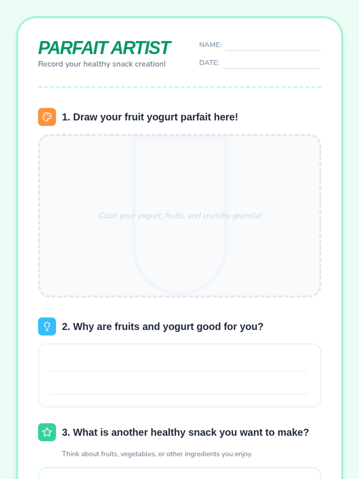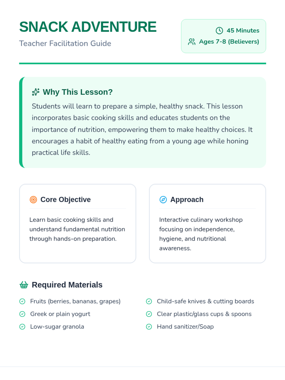 A fun, hands-on lesson where students aged 7-8 learn basic cooking skills by preparing a healthy fruit yogurt parfait while exploring the benefits of nutritious eating.