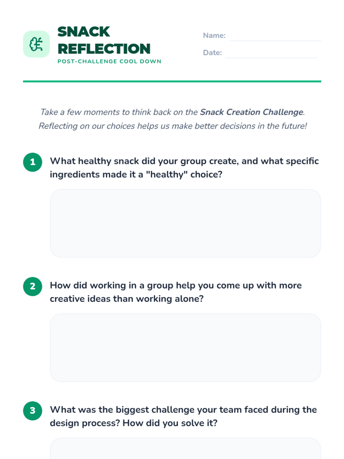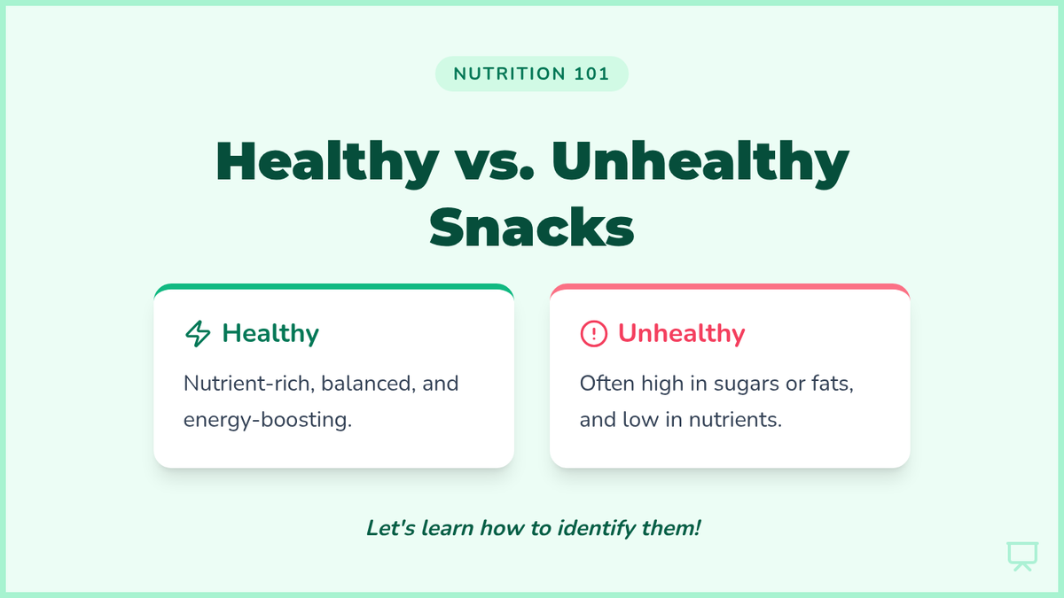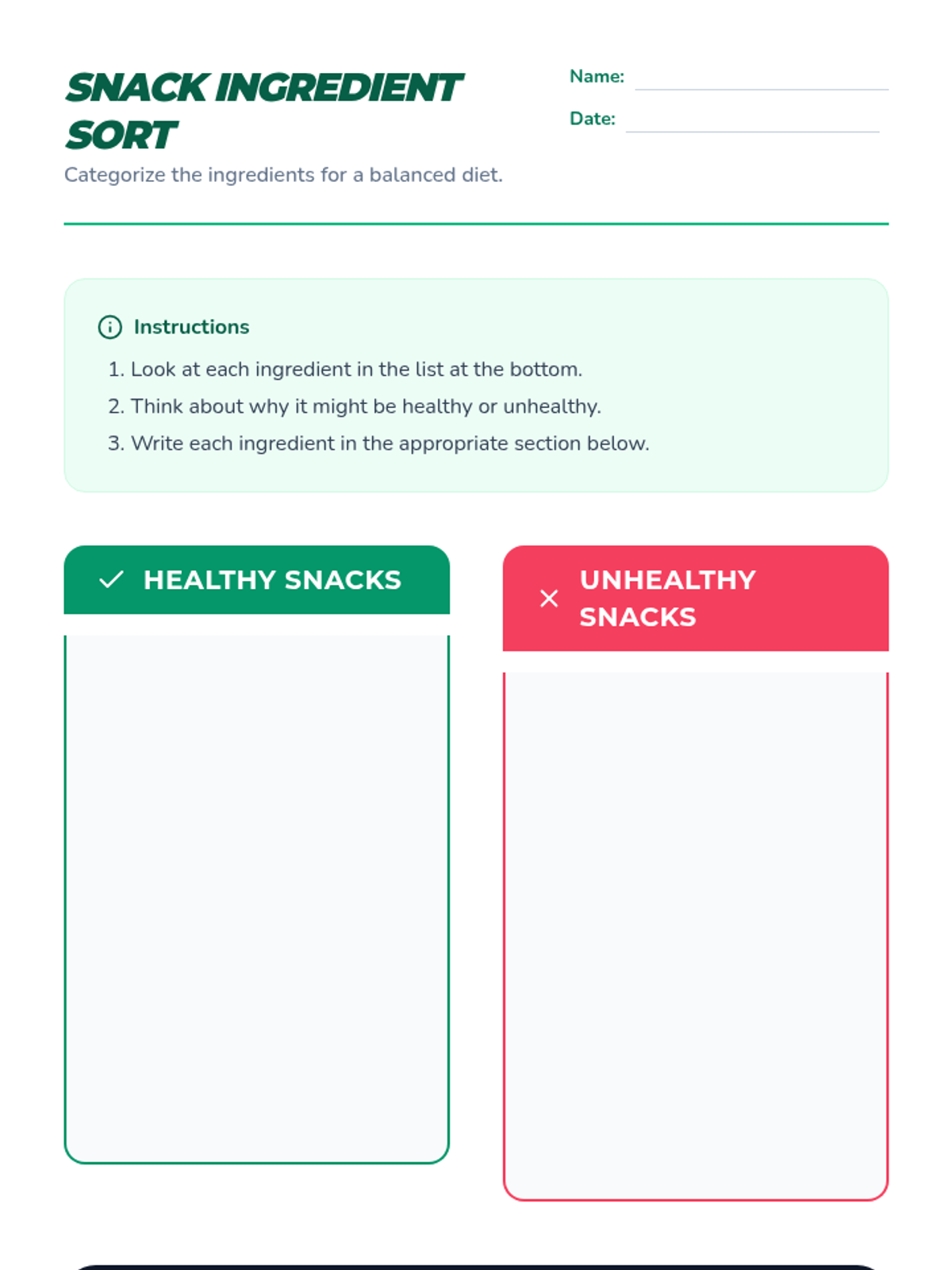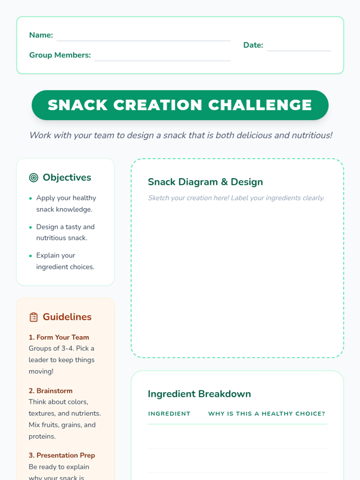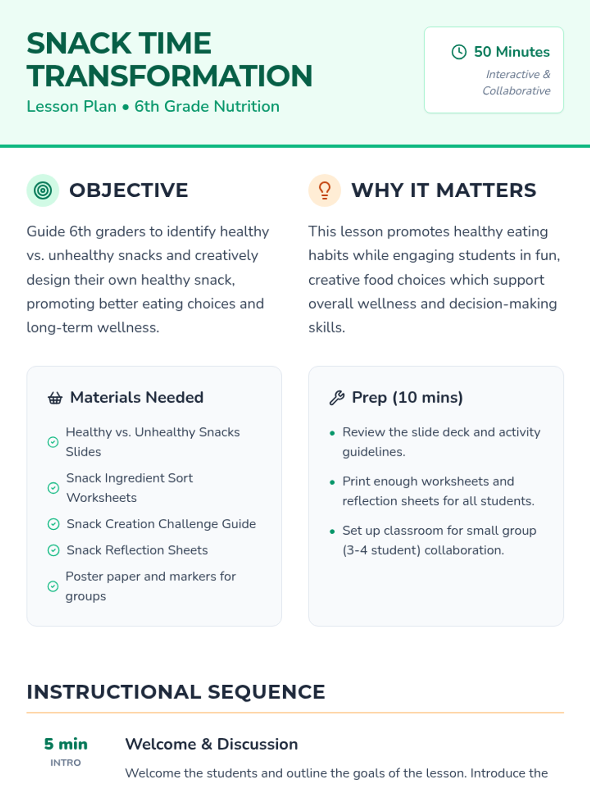 A fun, interactive lesson where 6th-grade students learn to distinguish between healthy and unhealthy snacks and then design their own nutritious snack creations.