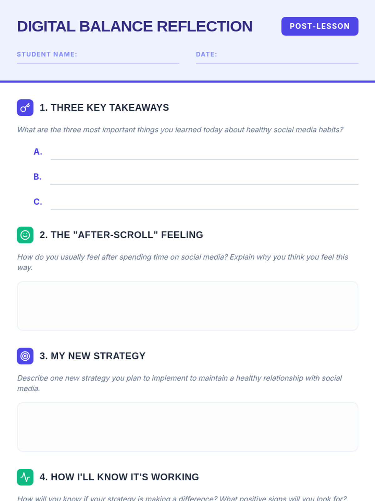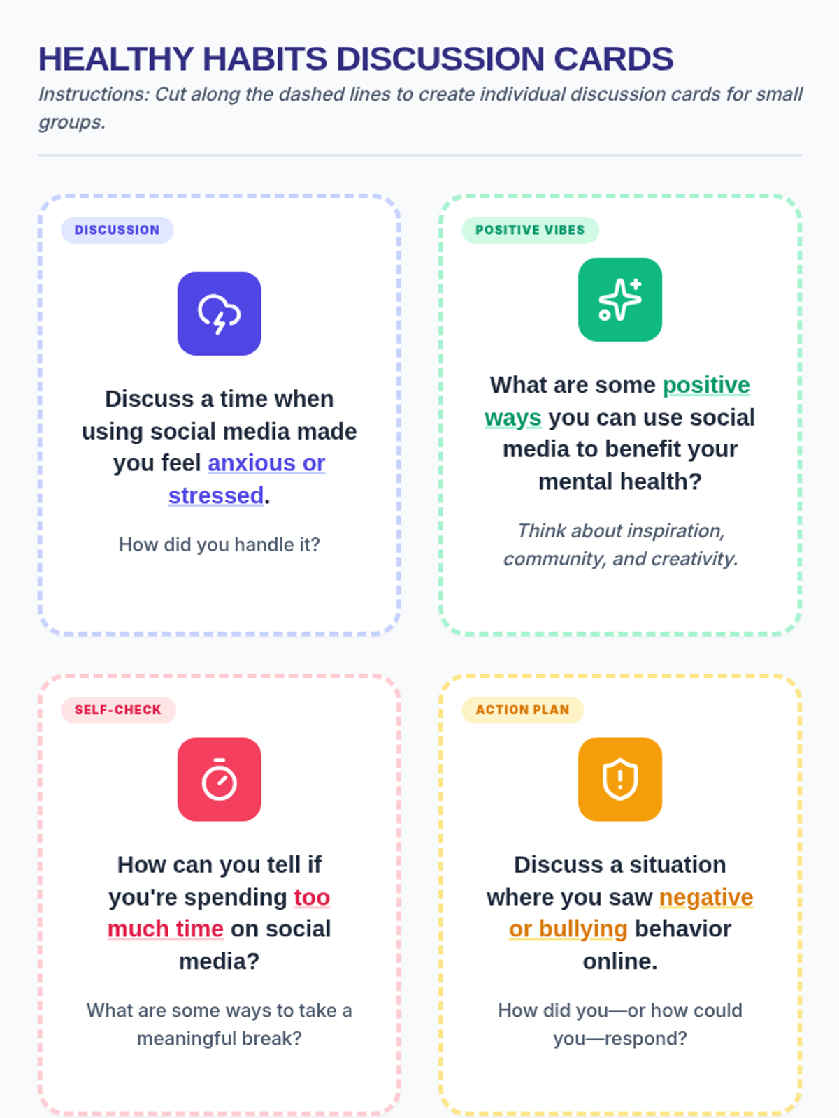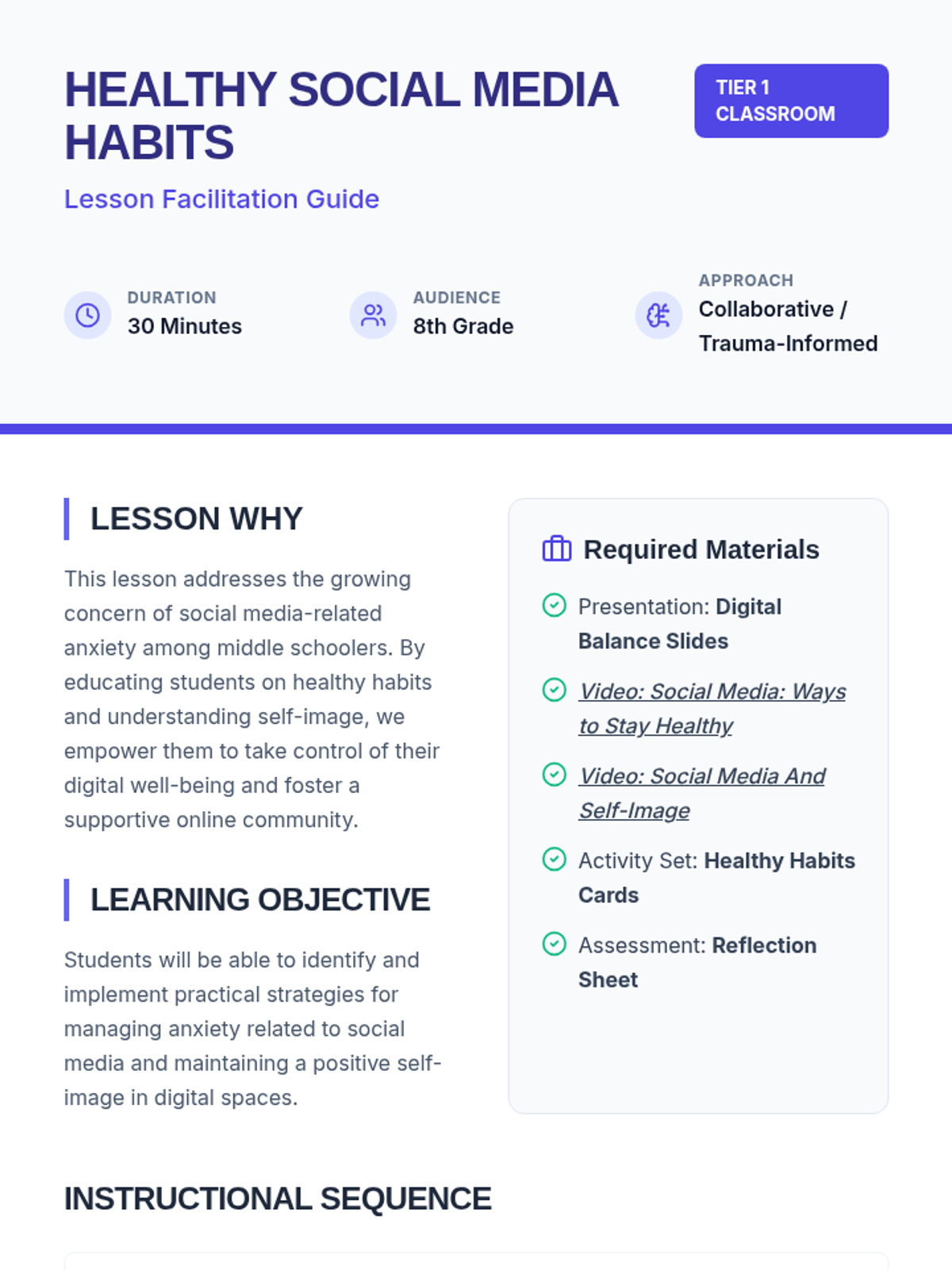 A 30-minute lesson designed for 8th graders to help them manage social media-related anxiety and build healthy digital habits through video analysis and collaborative strategy-making.
