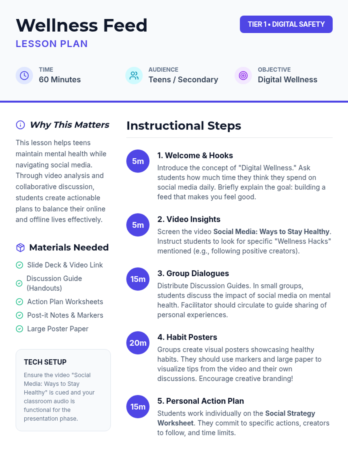 A comprehensive lesson designed to help teens navigate social media mindfully, featuring a video analysis, collaborative group work, and the creation of personal action plans for digital wellness.