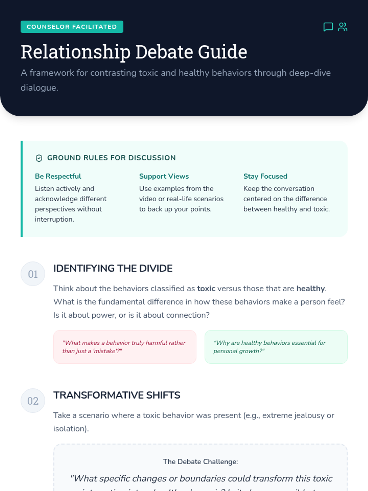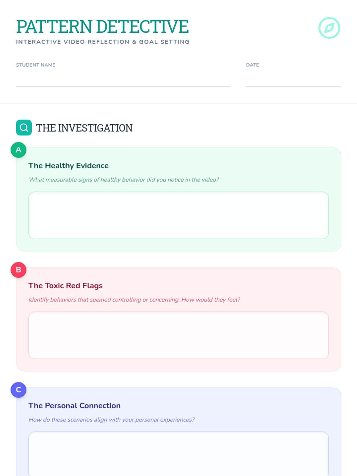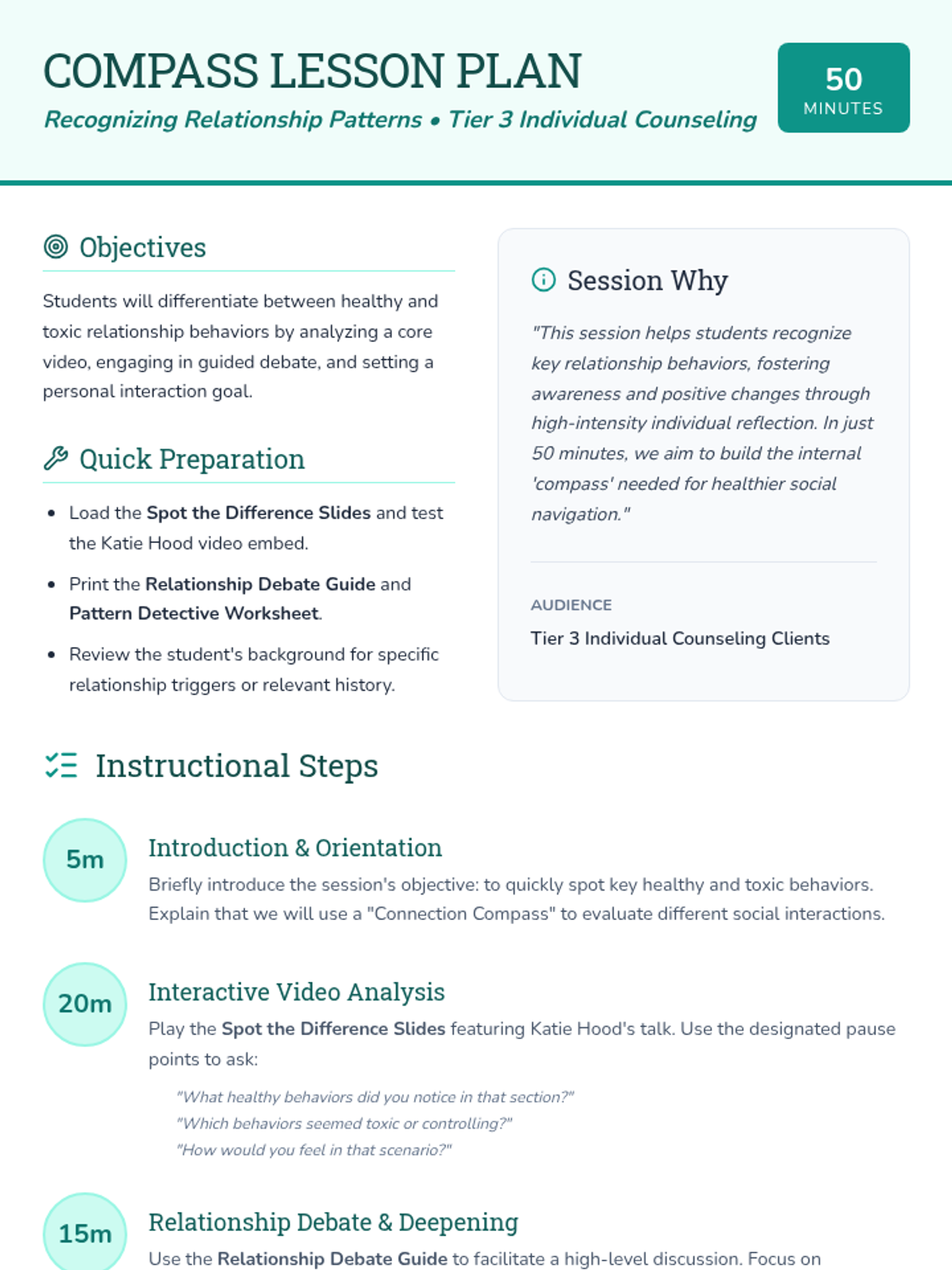 A Tier 3 individual counseling lesson focused on helping students differentiate between healthy and toxic relationship patterns through video analysis, discussion, and personal reflection.