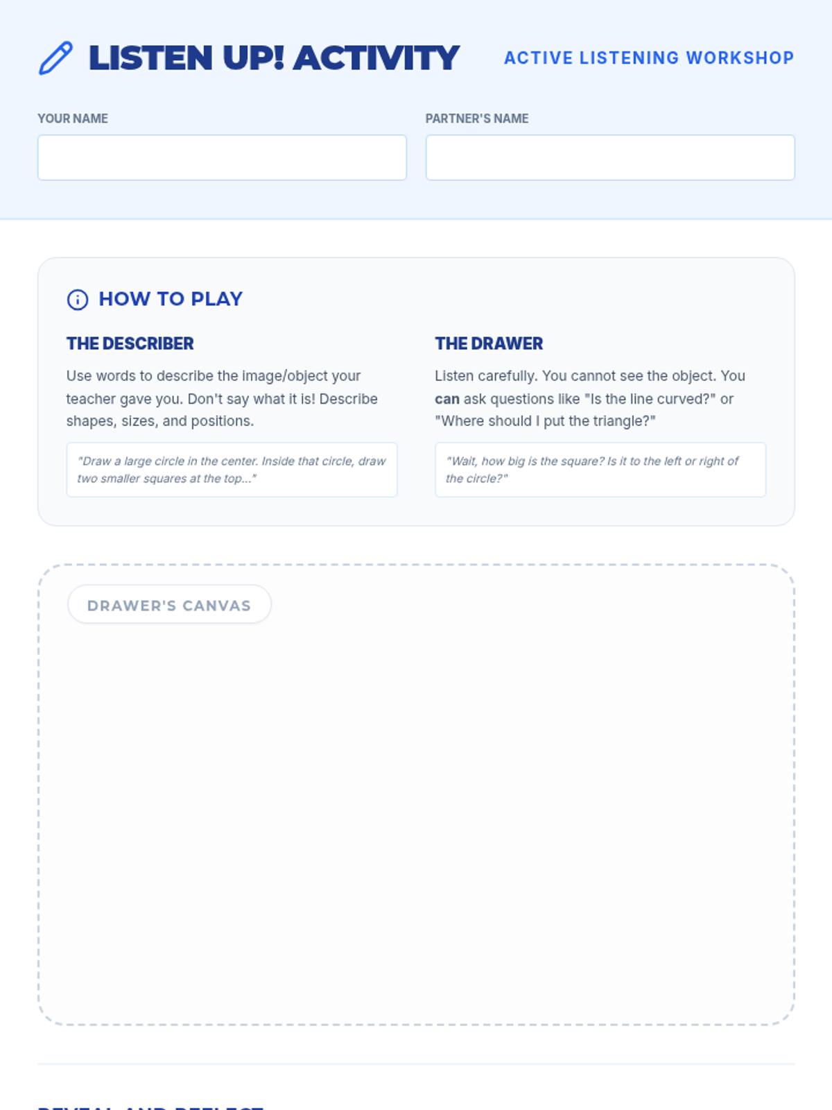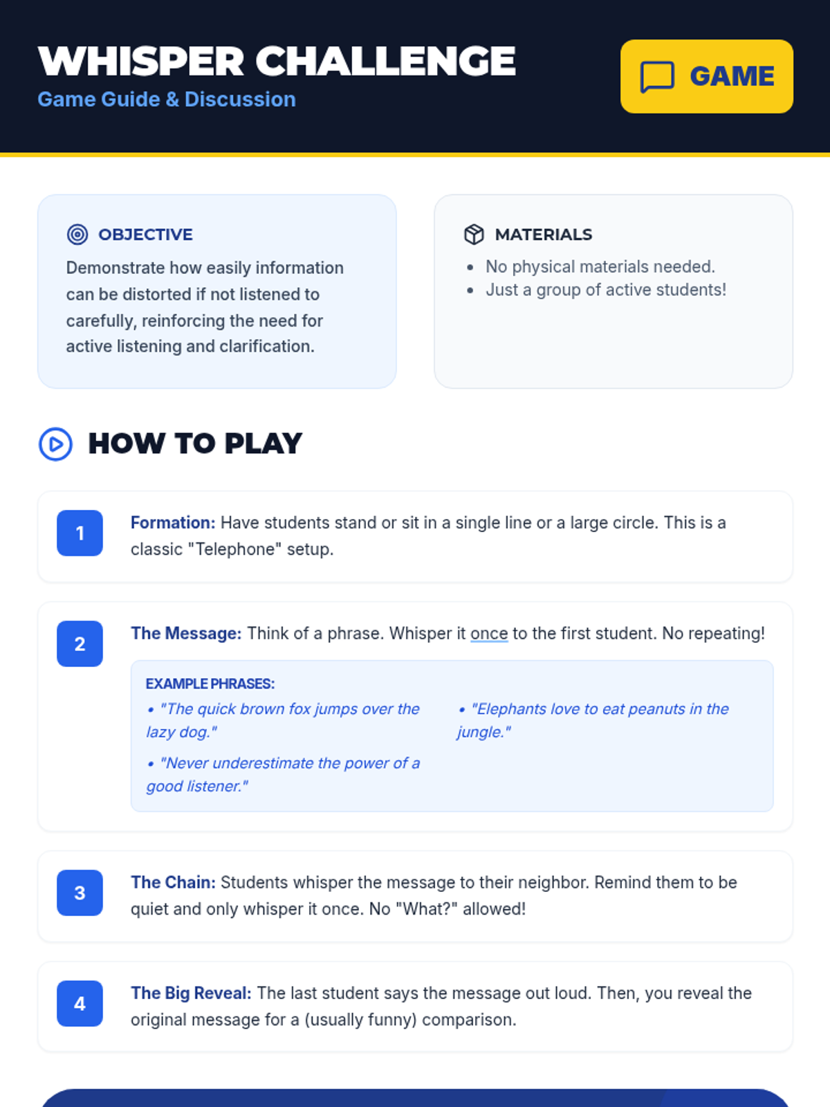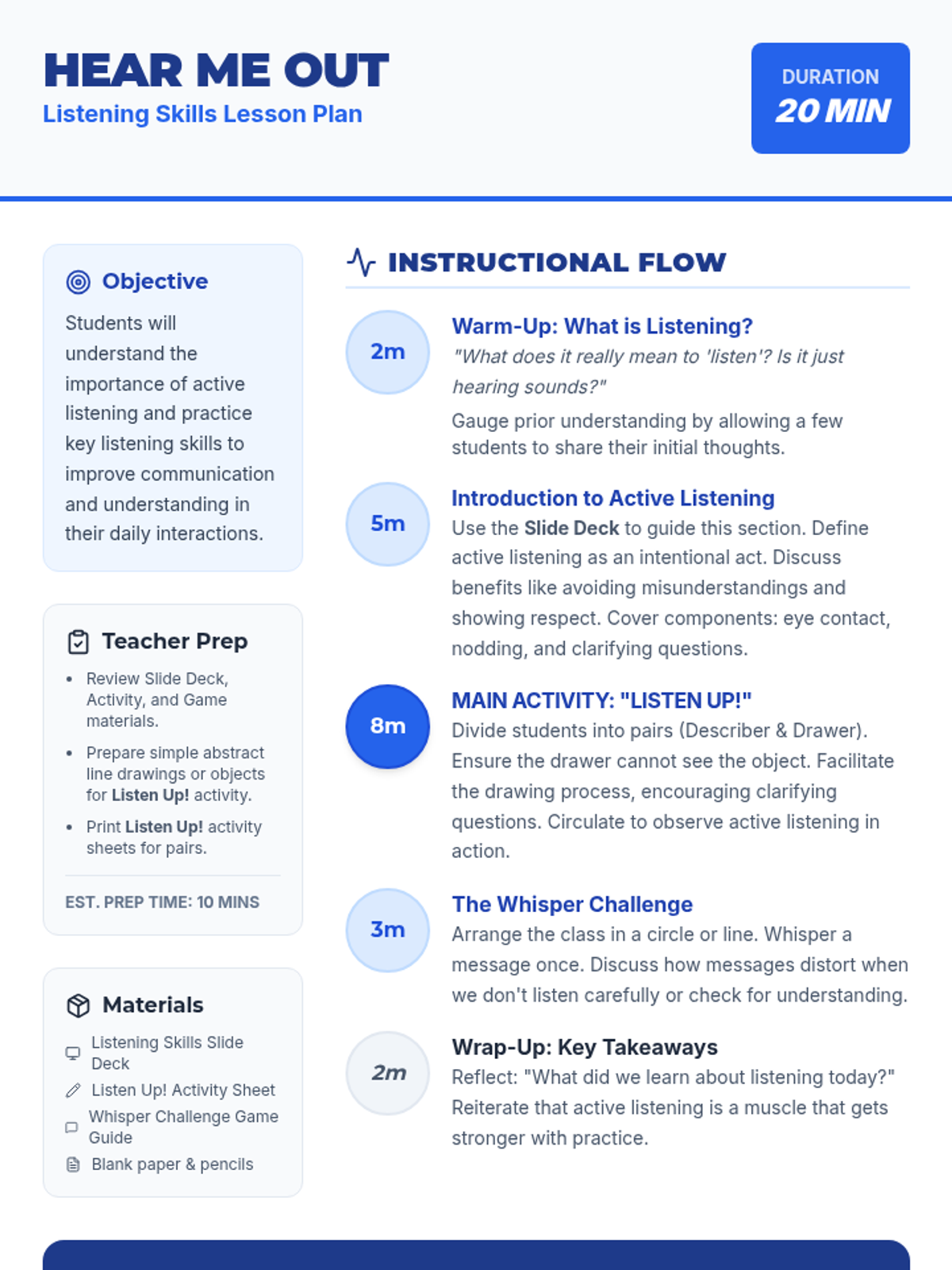 A 20-minute Tier 1 lesson designed for middle school students to develop active listening skills through direct instruction, a partner drawing activity, and the Whisper Challenge game.