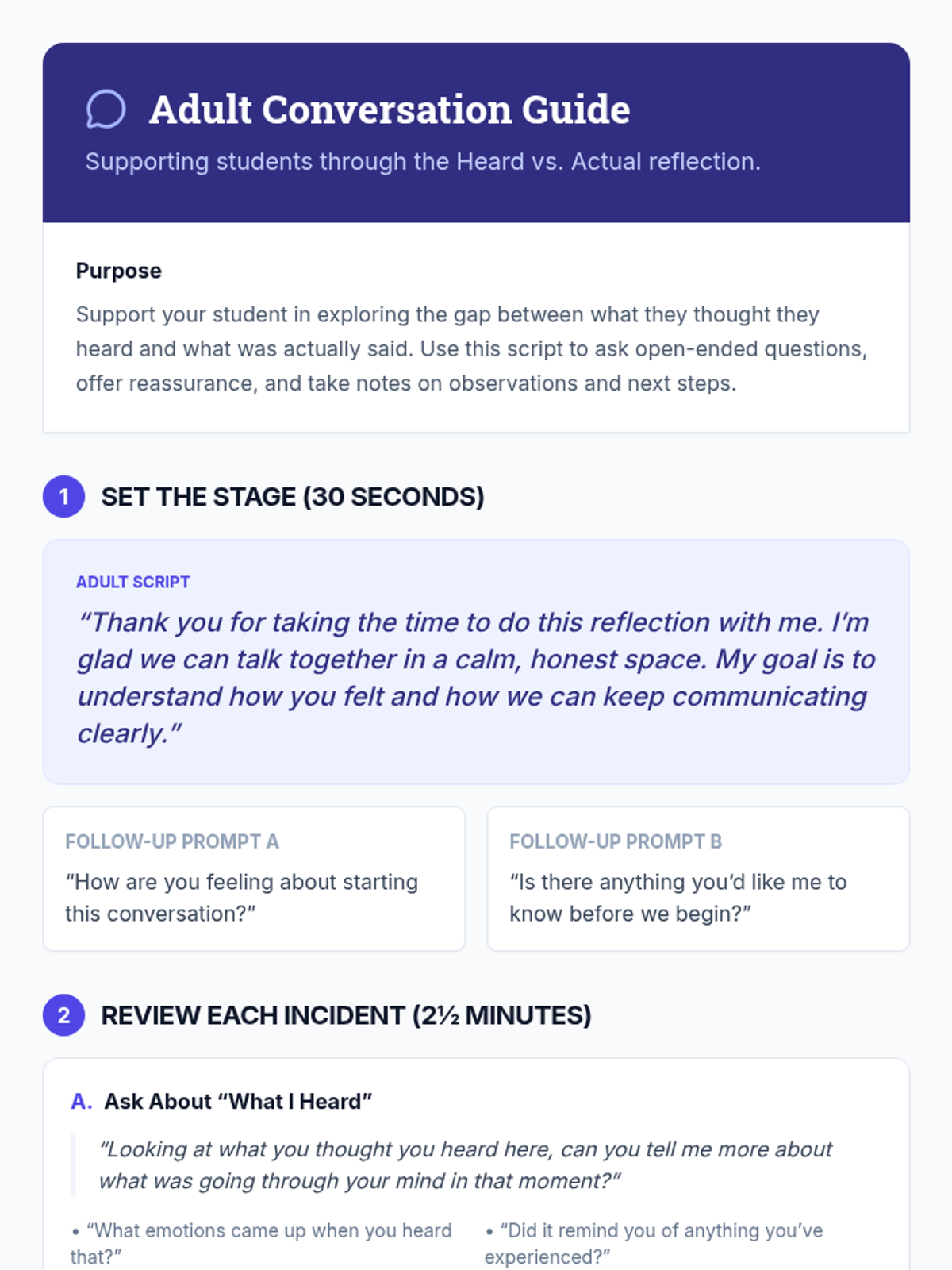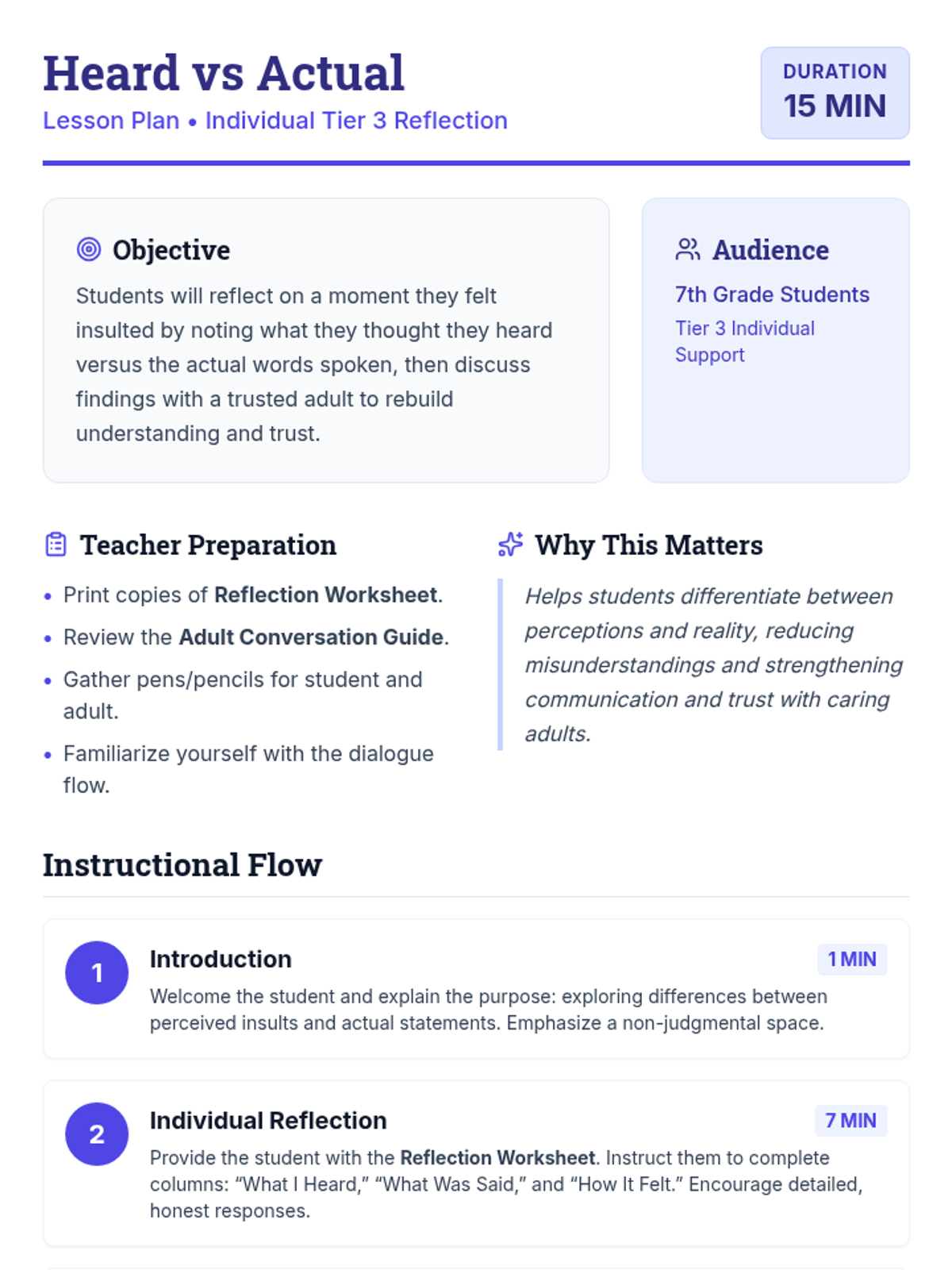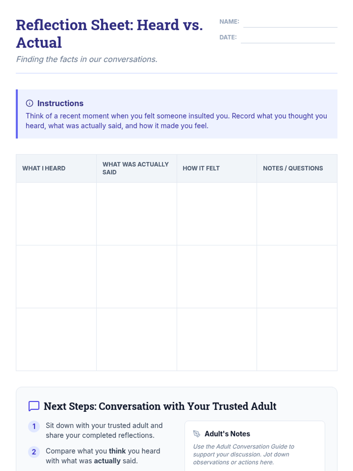 A 15-minute individual reflection exercise for 7th graders to differentiate between perceived insults and objective statements, aimed at rebuilding trust and improving communication with adults.