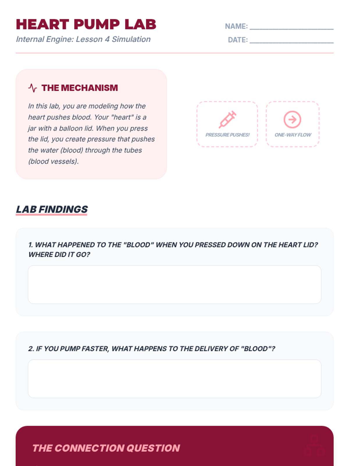 Students explore the circulatory system as the delivery network that connects oxygen and energy to the rest of the body using a heart pump model.