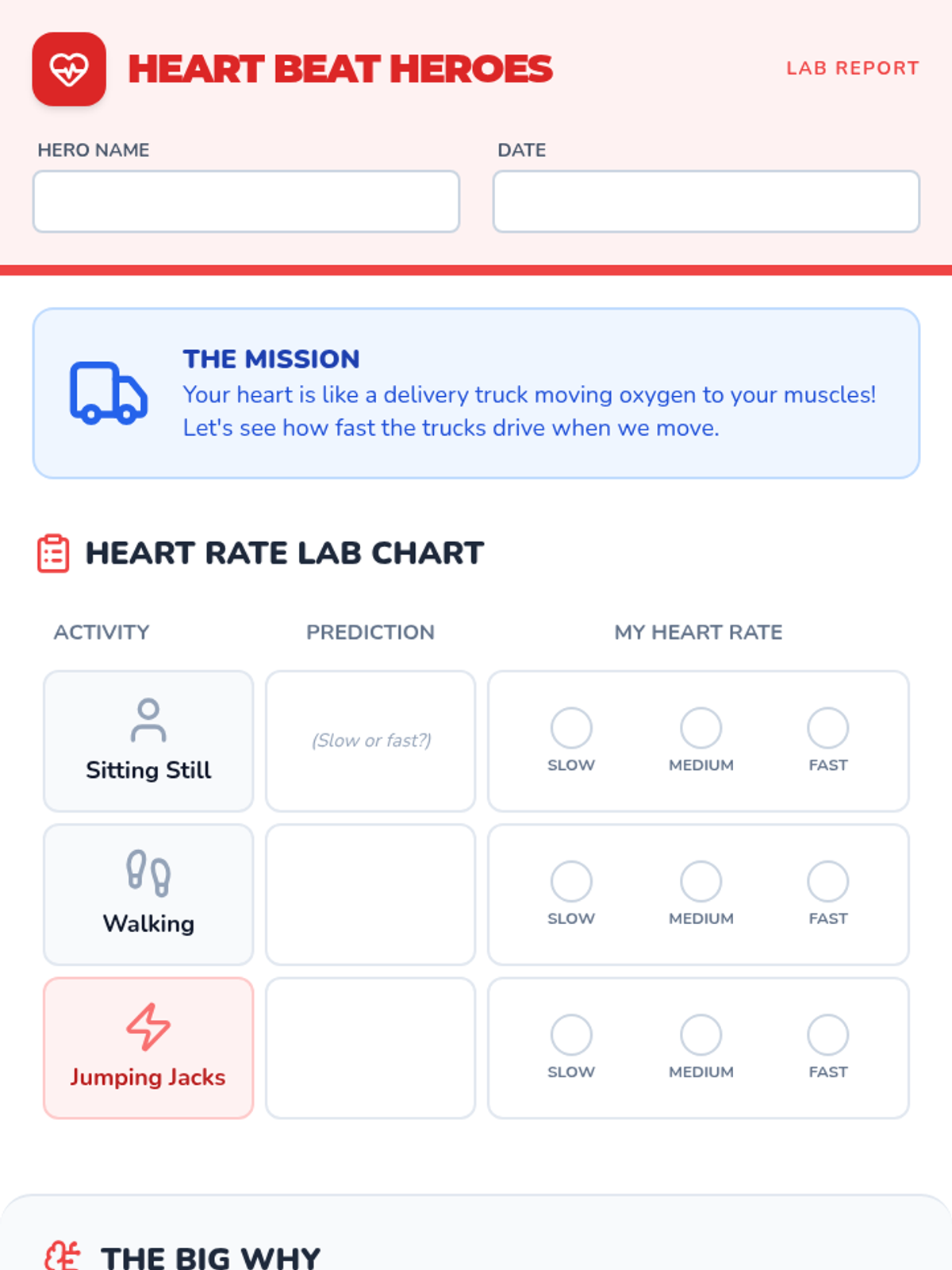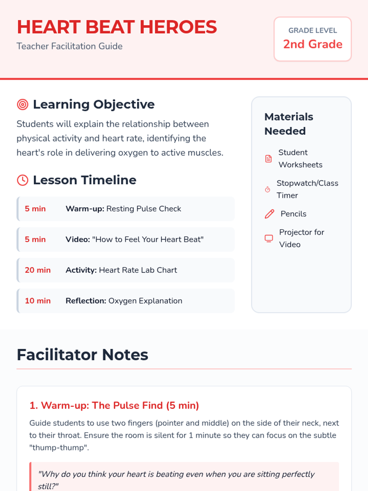 A lesson where 2nd-grade students discover how their heart acts as a delivery truck for oxygen and how physical activity changes their heart rate.