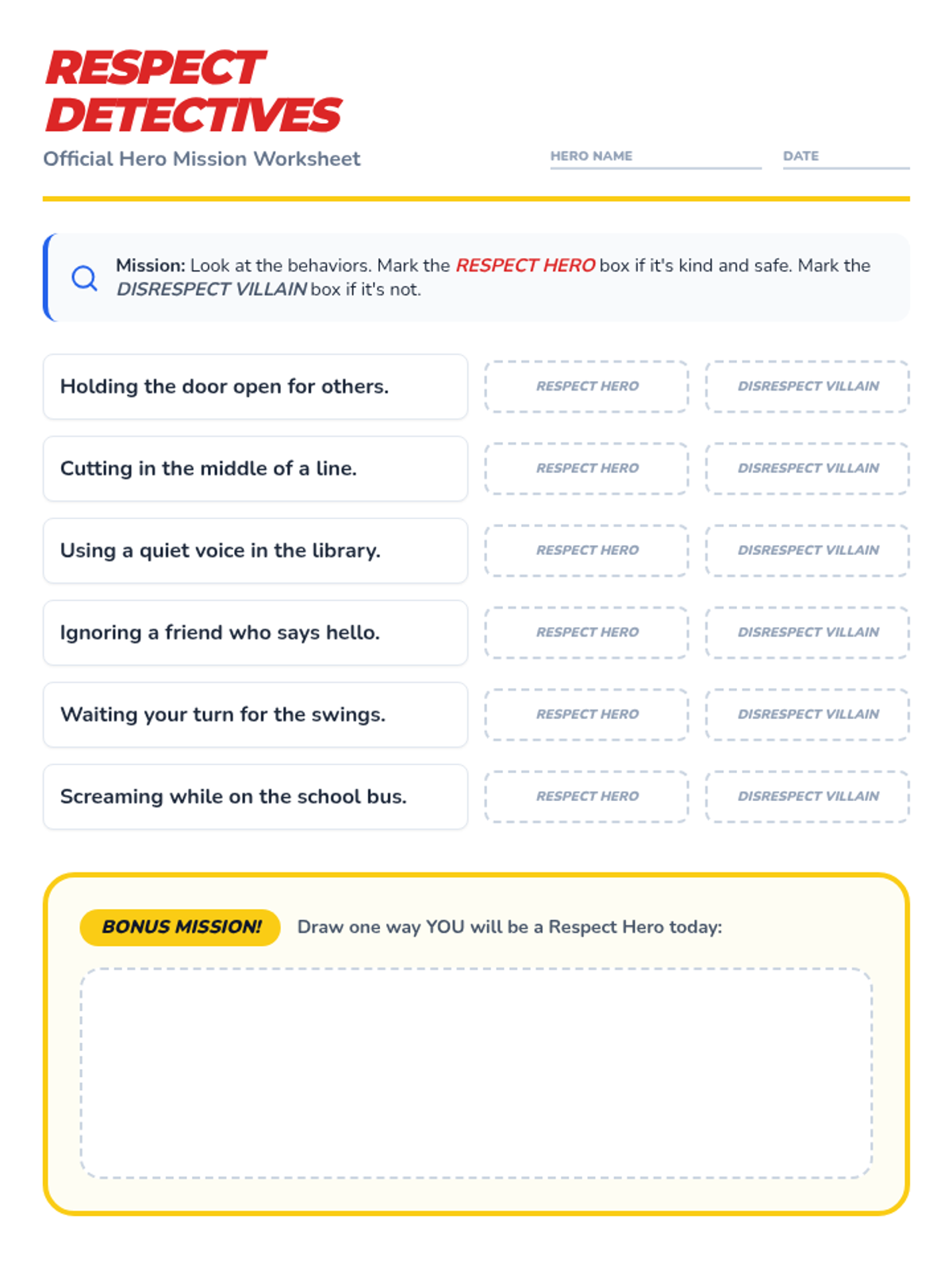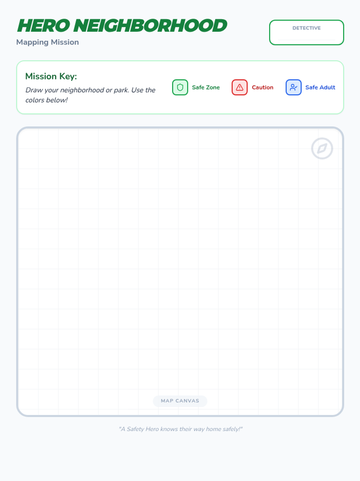 A high-energy lesson where students become 'Safety Heroes' to learn about respect and safety in their school and neighborhood through interactive games and creative mapping.
