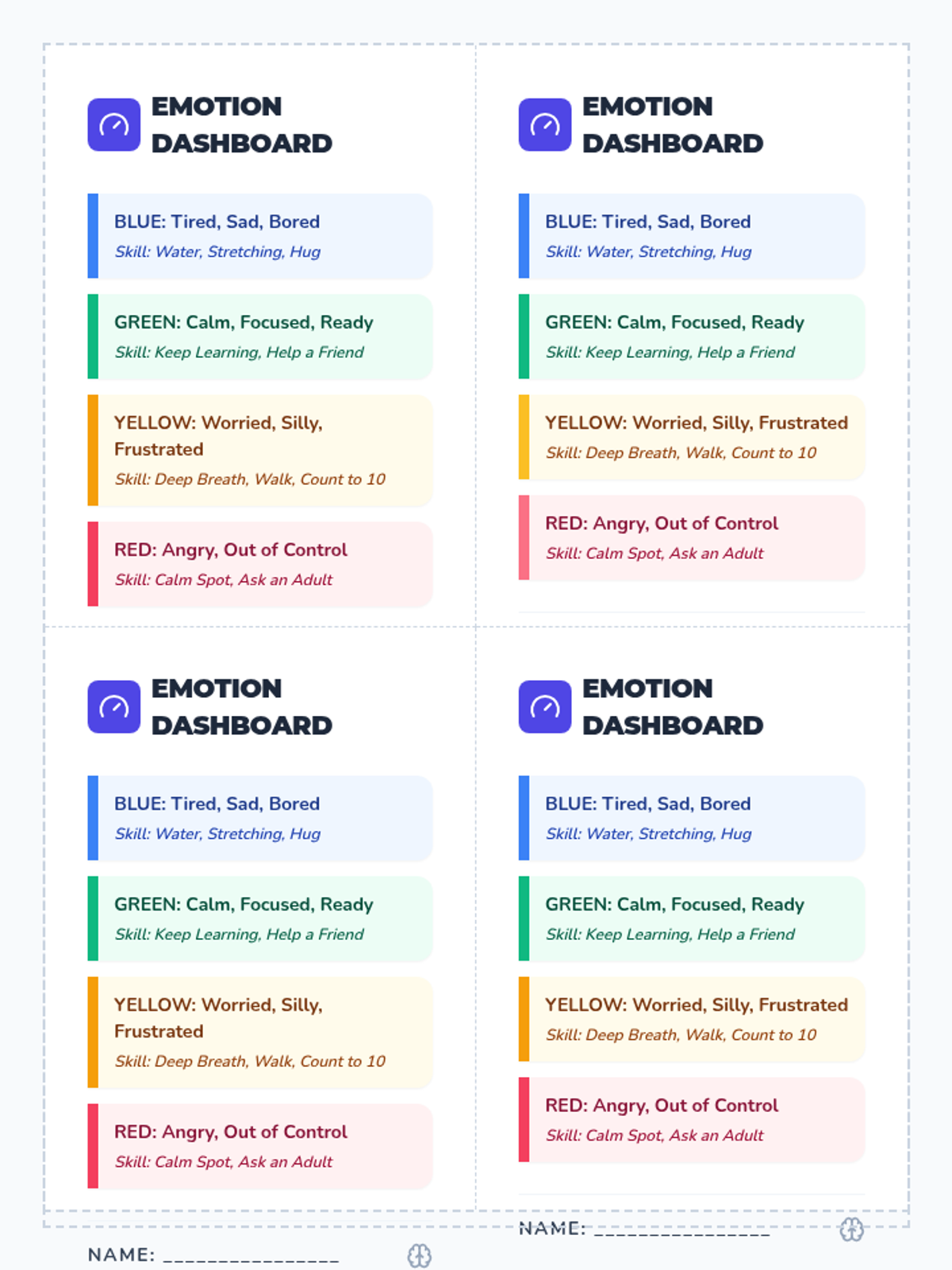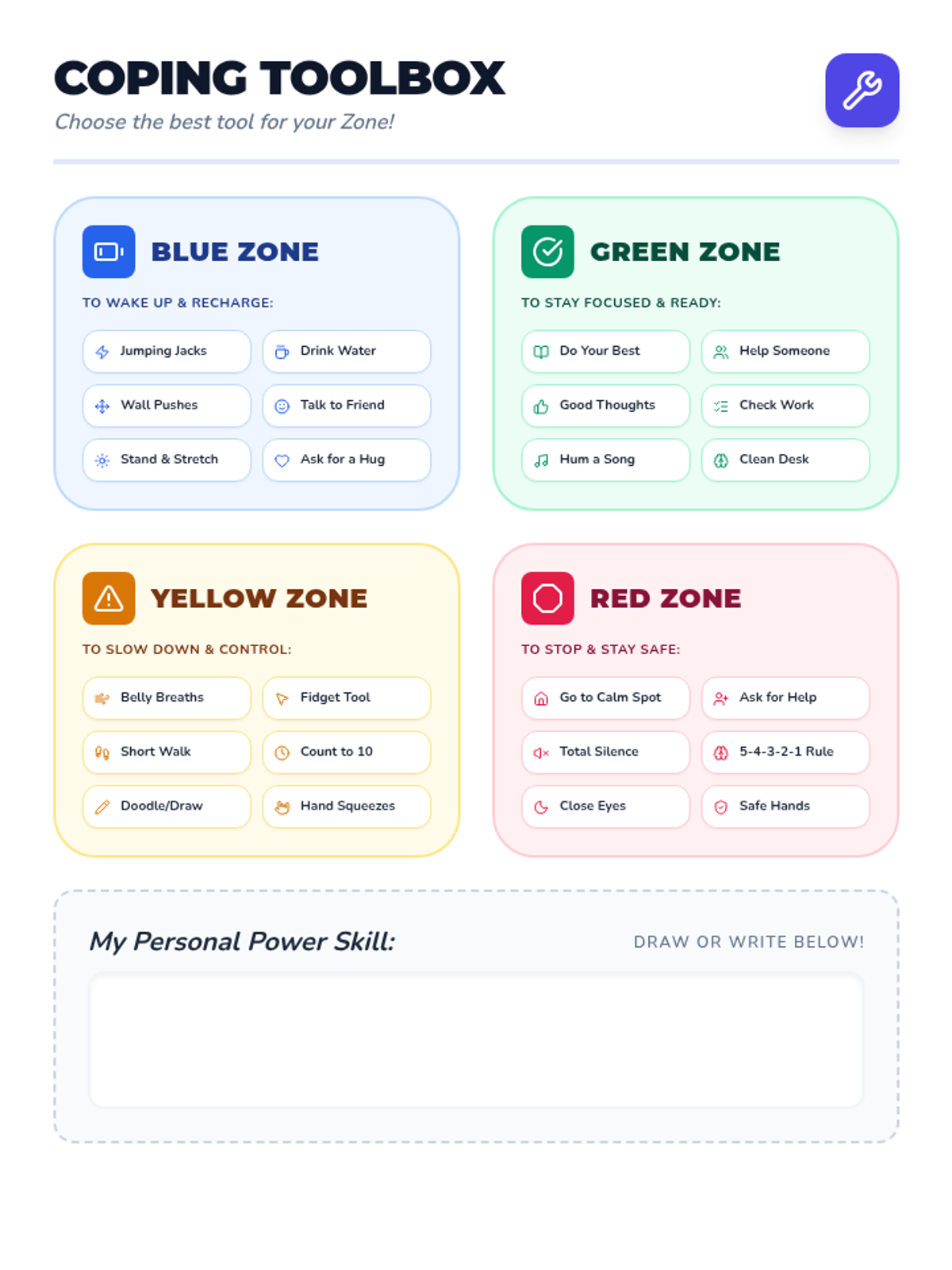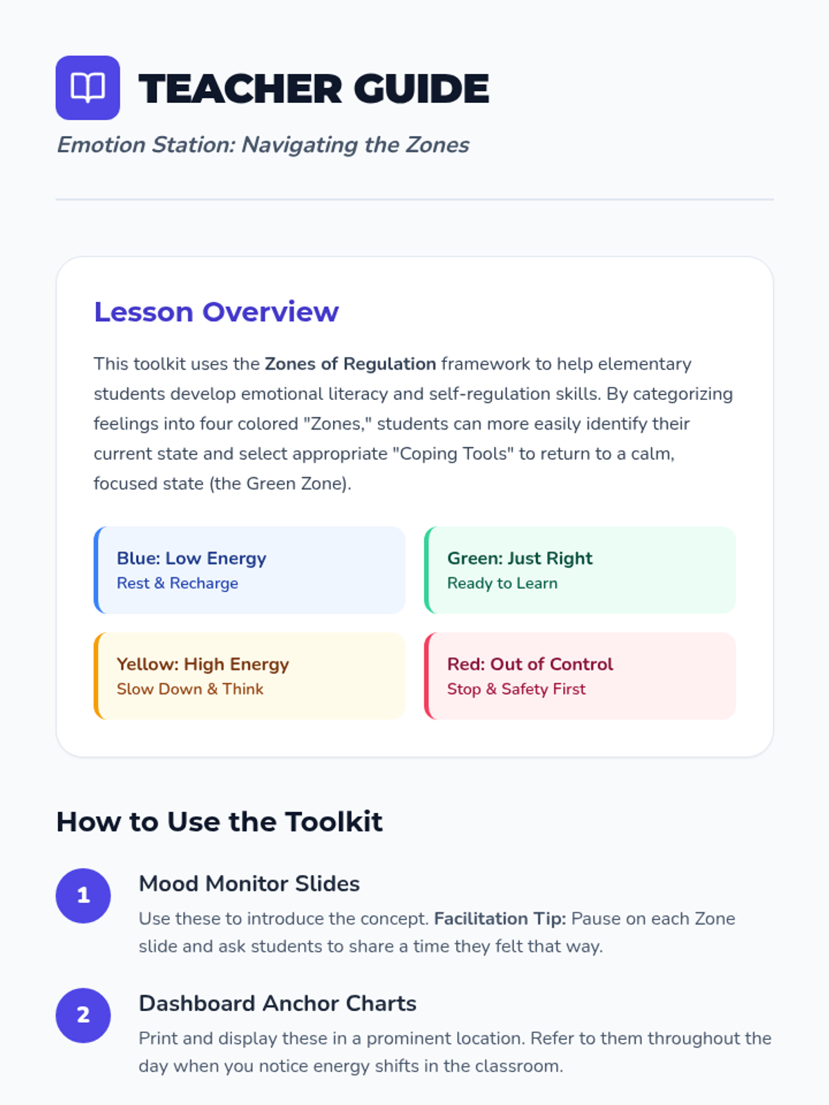 A comprehensive toolkit to help elementary students identify their emotional state using the Zones of Regulation framework and select appropriate coping strategies for each zone.