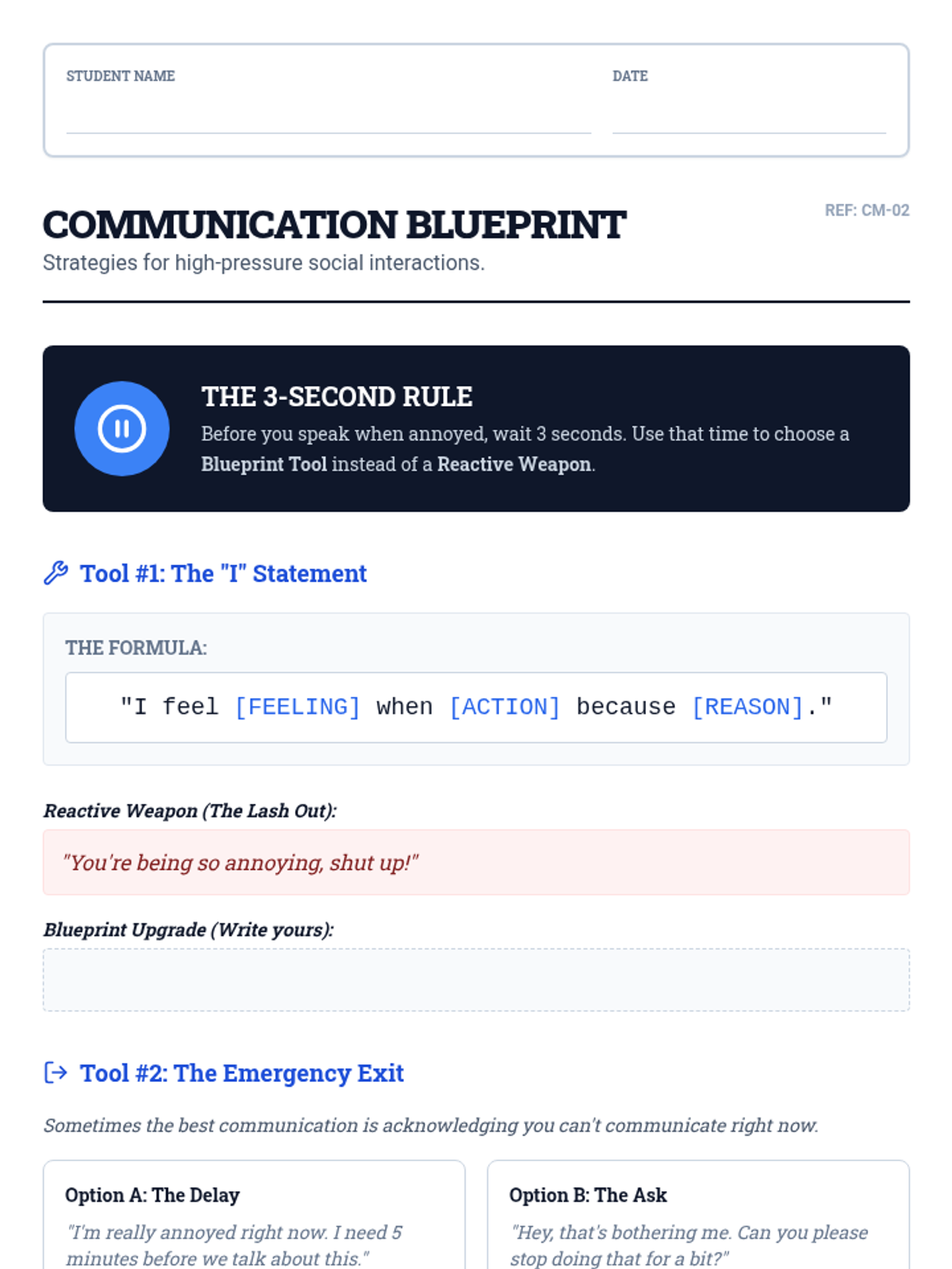 A structured reflection and skill-building session for students in in-school suspension, focusing on identifying annoyance triggers and developing constructive communication strategies to replace lashing out.