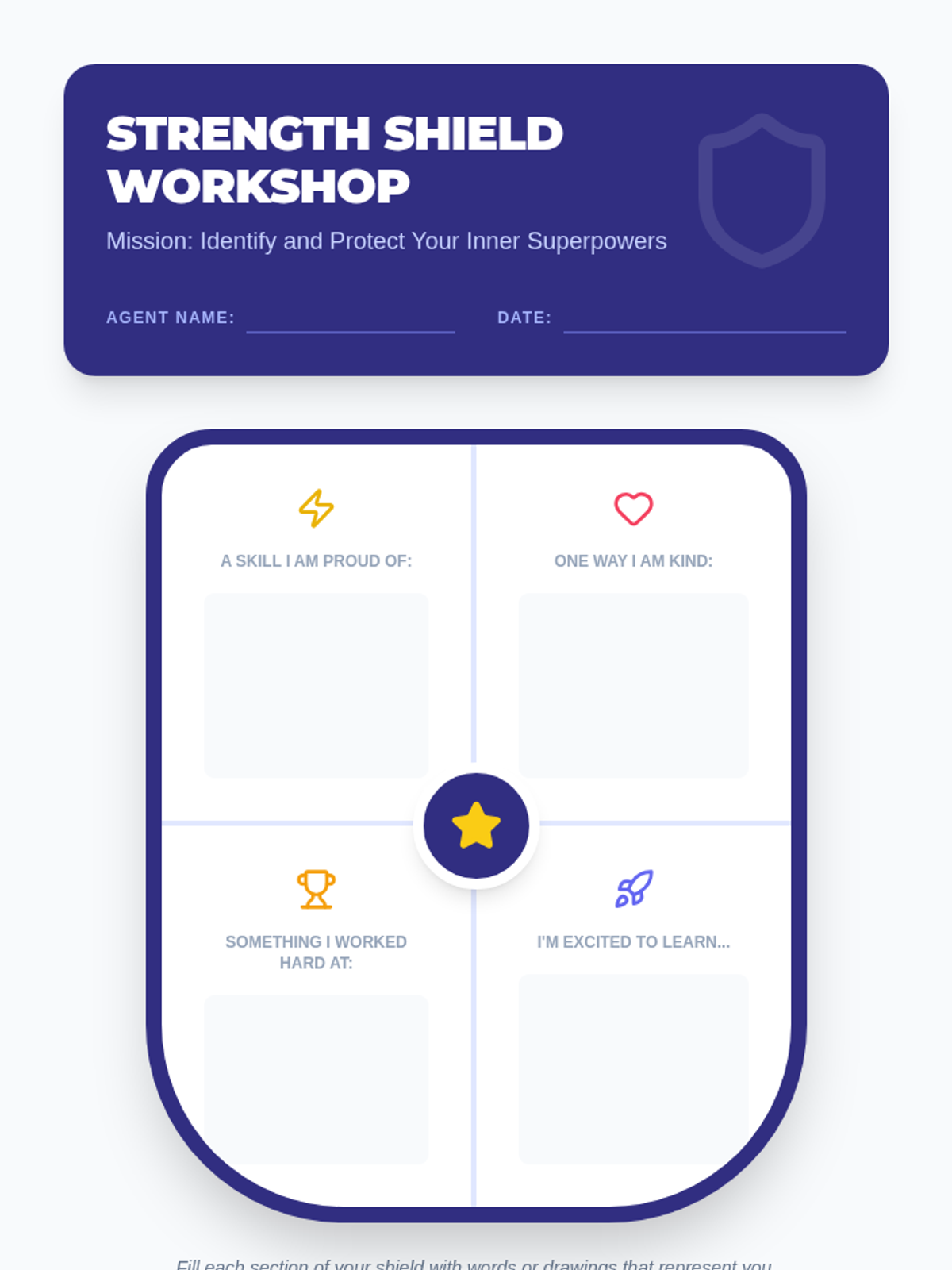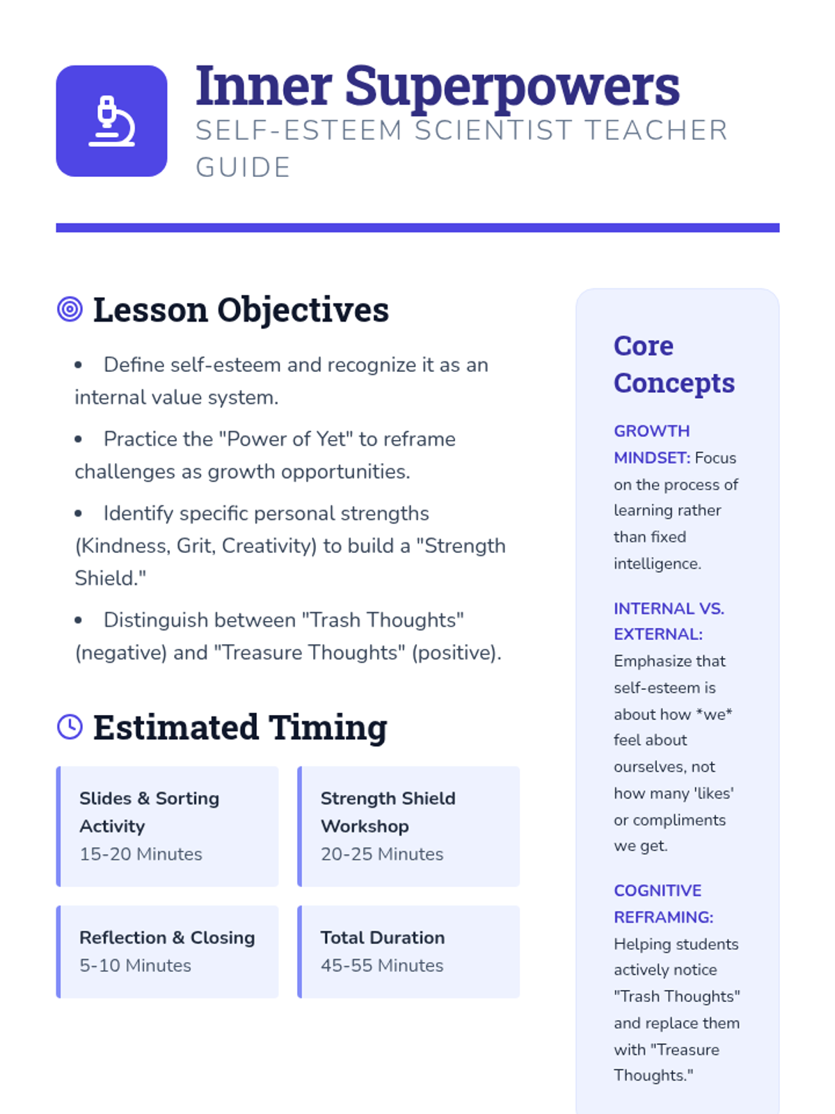 A lesson focused on helping students identify their personal strengths, practice positive self-talk, and understand that self-esteem comes from within. Students will create a 'Strength Shield' and learn to challenge negative inner thoughts.