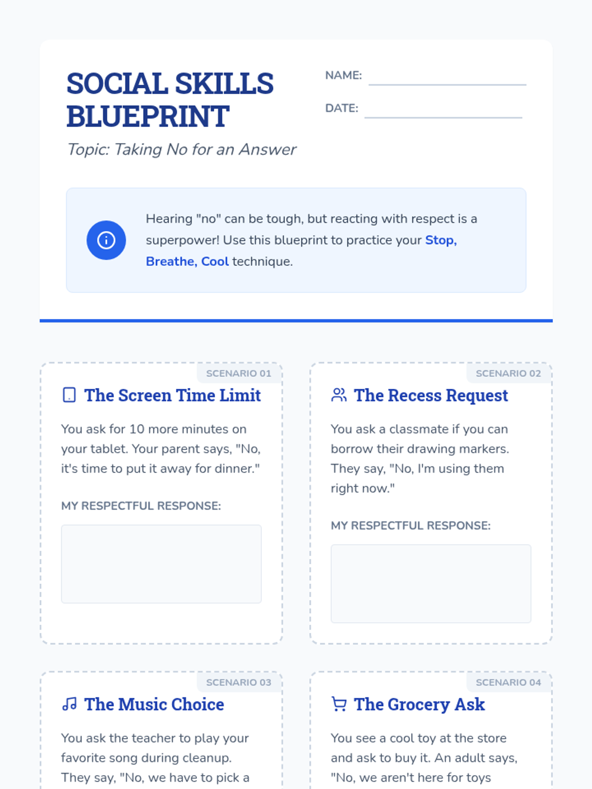 A social-emotional learning lesson focused on helping students understand and accept the word 'no' with grace and resilience. Students will learn the 'Stop, Breathe, Cool' technique and practice respectful communication through role-playing.