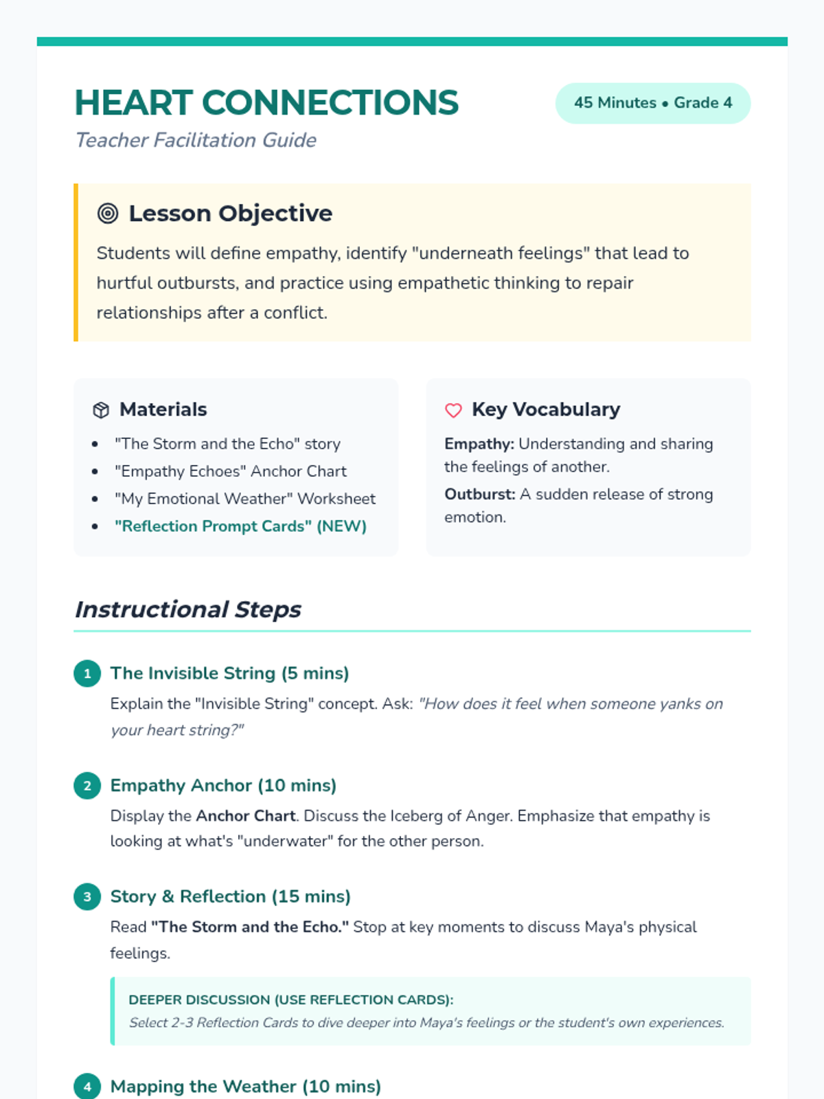 A comprehensive 45-minute lesson focused on empathy, emotional regulation, and understanding the impact of hurtful words within a family context. Designed for 4th grade, it explores the 'big feelings' behind anger and how to repair heart connections.