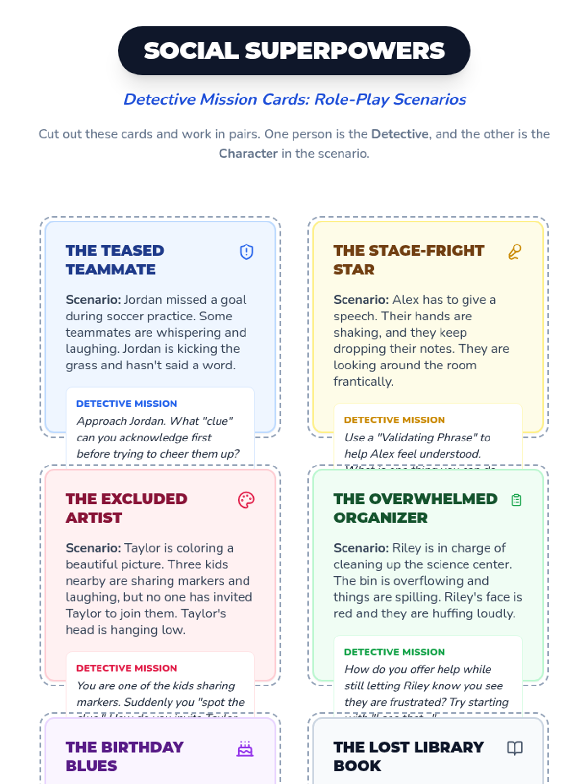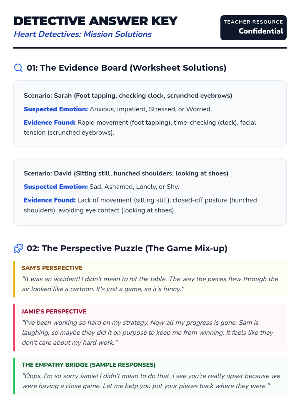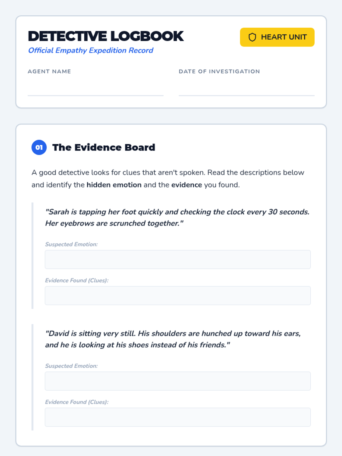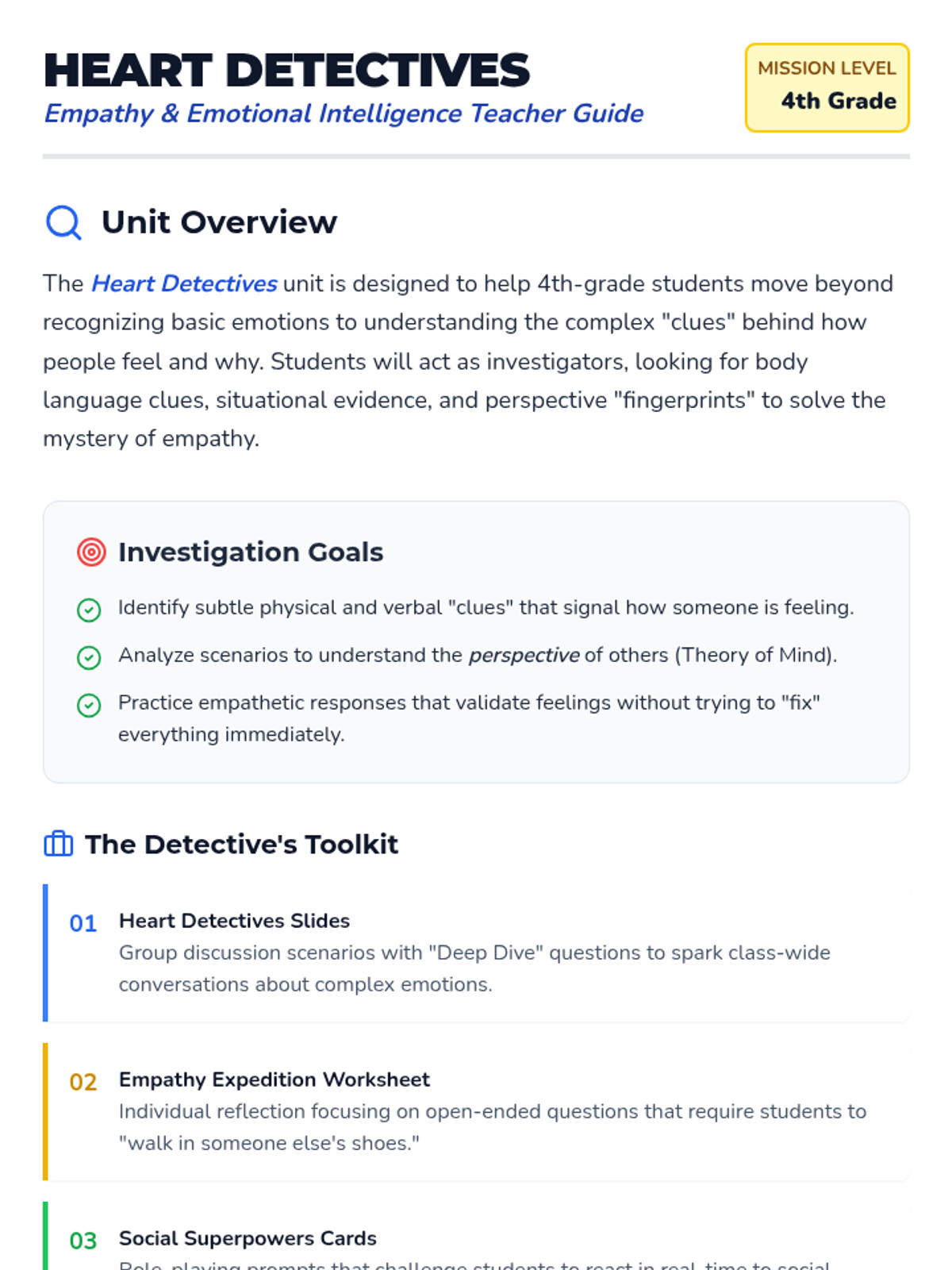 A lesson for 4th graders to develop empathy and emotional intelligence through detective-themed scenarios, discussions, and role-playing activities.