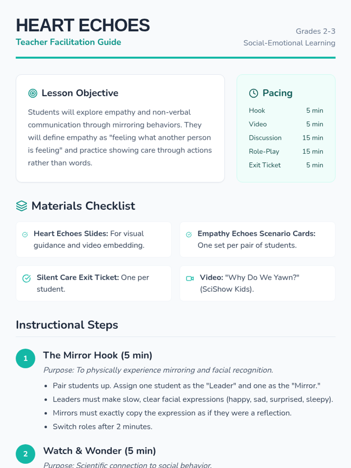 Students will explore the concept of empathy through mirroring behaviors, contagious yawning, and role-playing social scenarios to understand how we connect without words.