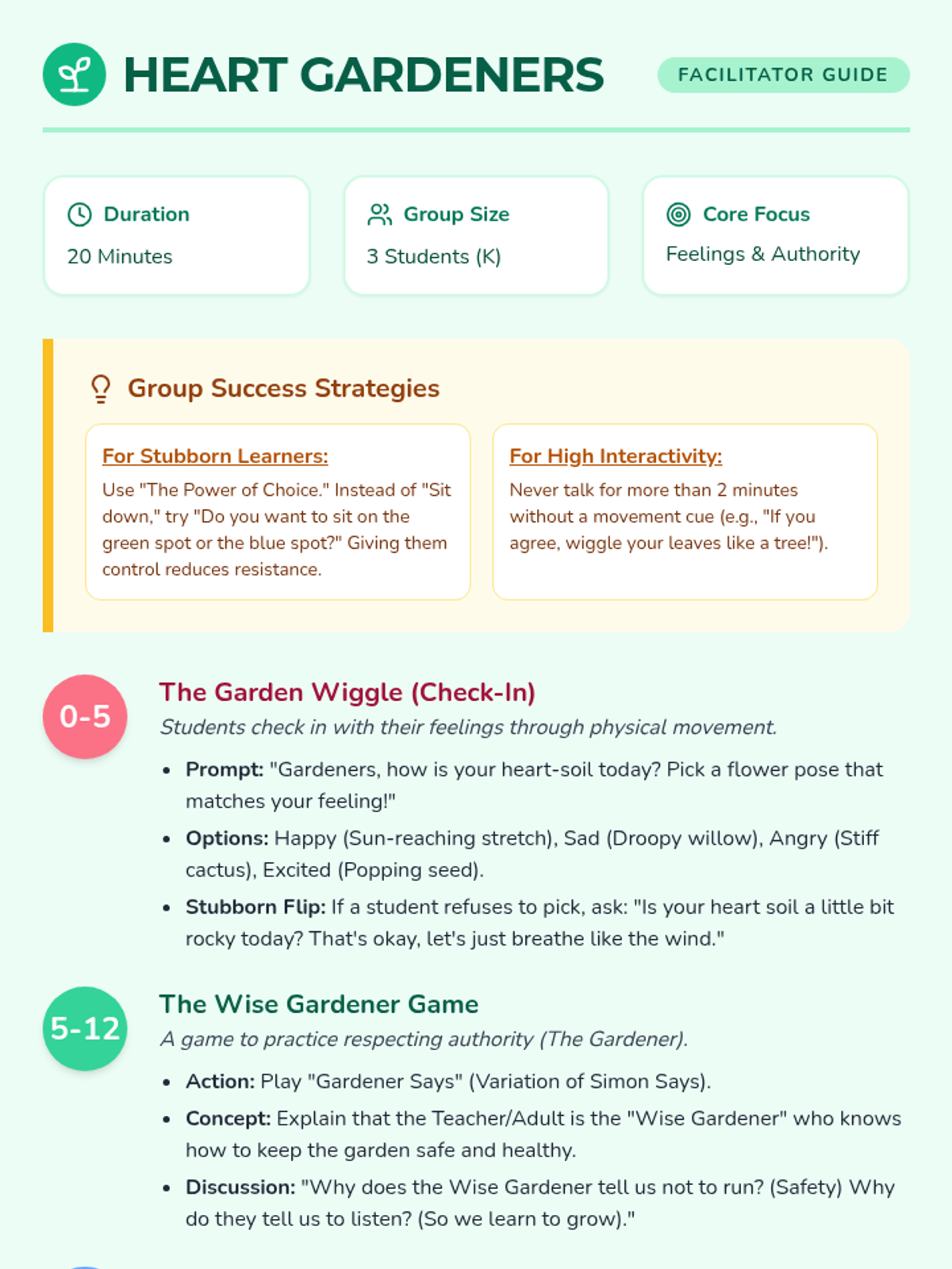 A 20-minute counseling lesson for kindergarteners focused on identifying feelings and understanding the role of authority figures using a 'Heart Gardeners' theme. The lesson includes high-engagement physical movement and a creative activity to manage stubbornness and prevent boredom.