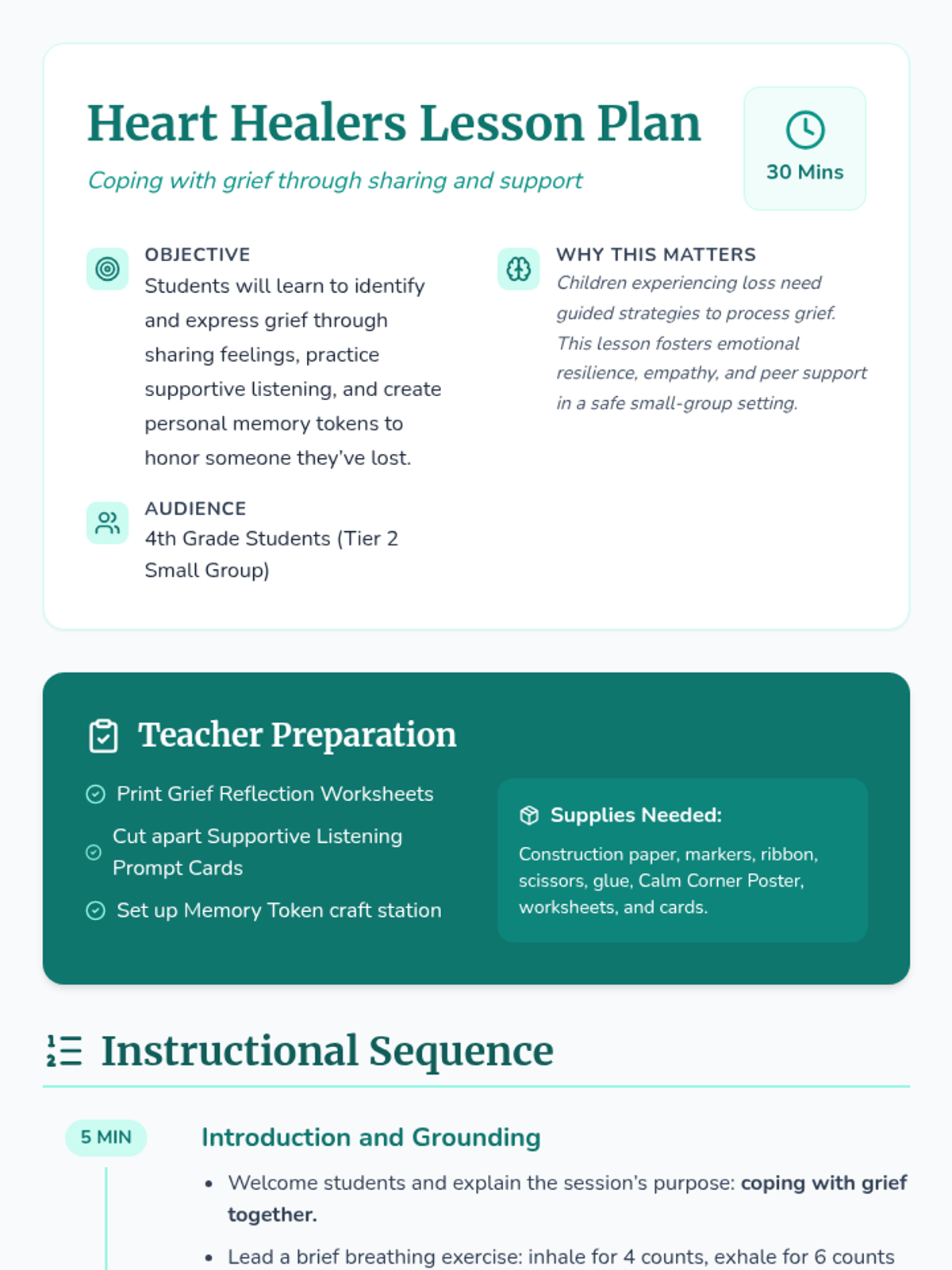 In this 30-minute, small-group lesson, 4th graders learn healthy ways to cope with grief by sharing feelings, practicing supportive listening, and creating personal memory tokens. This Tier 2 session helps students process loss, build empathy, and develop emotional resilience.