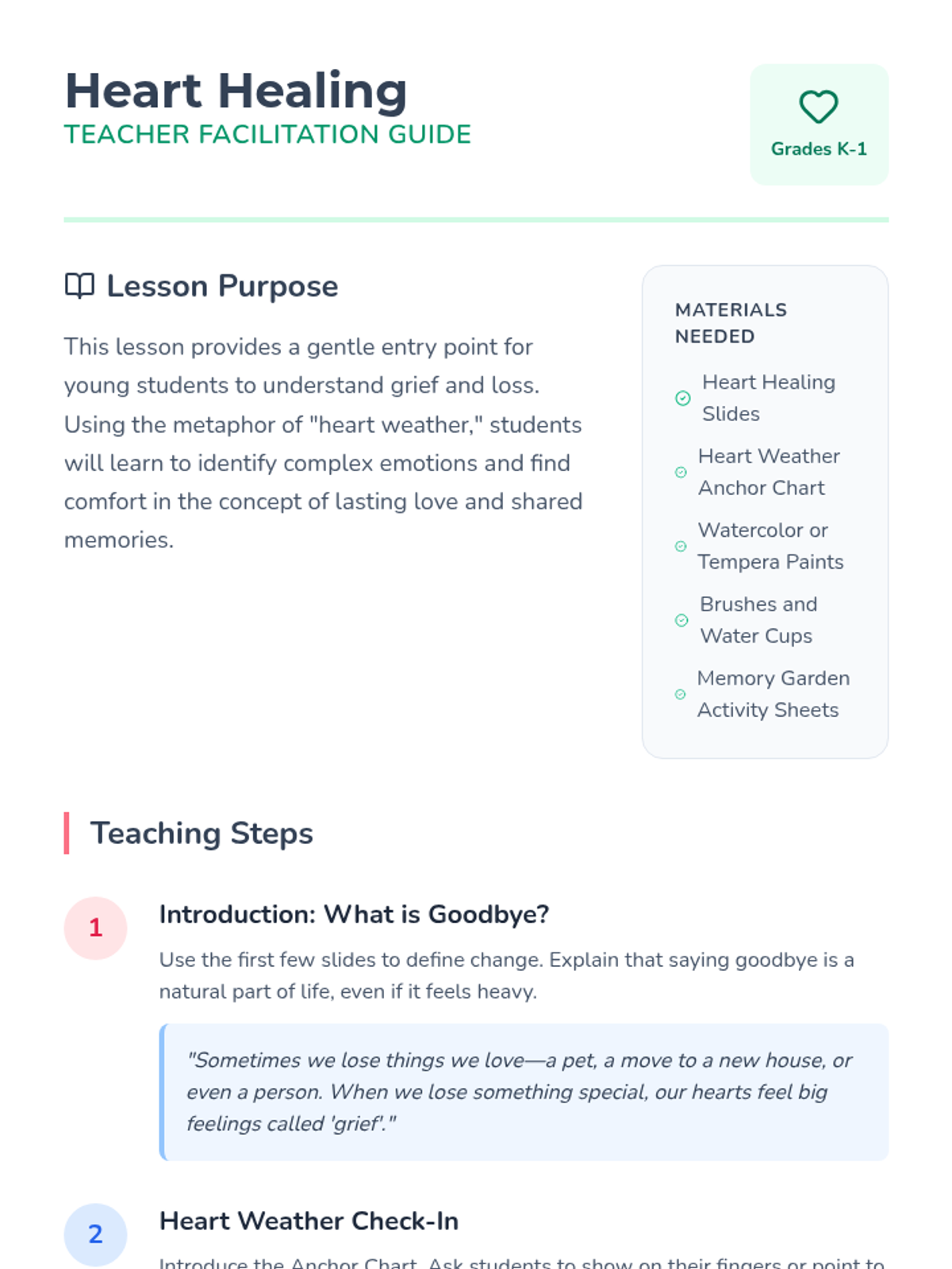A sensitive and supportive lesson designed for K-1 students to explore the concept of grief, identify their feelings, and find comfort through art and memory-sharing.