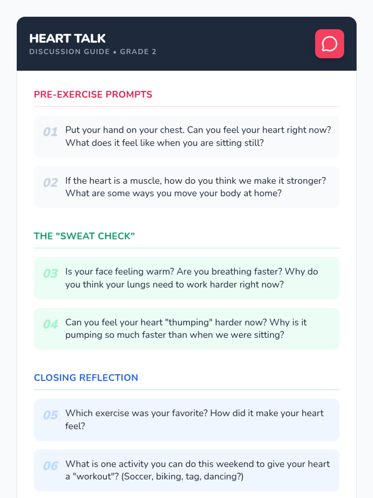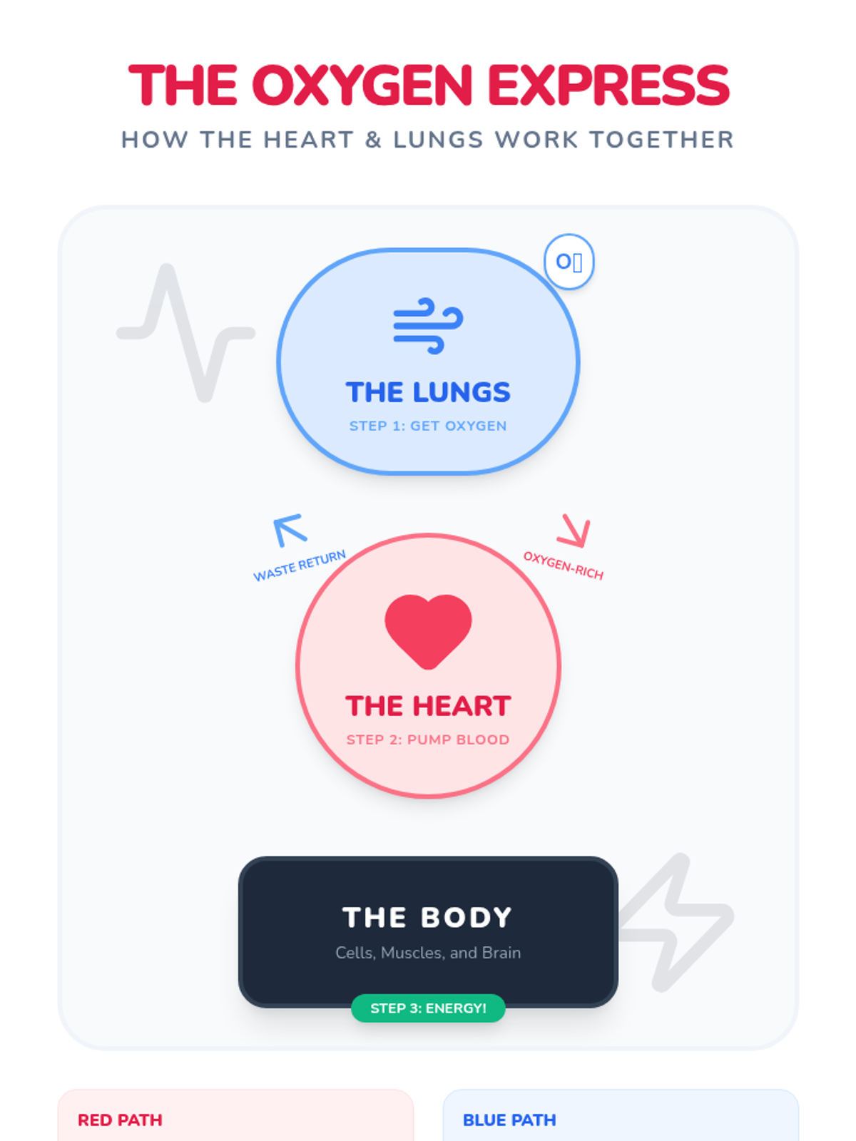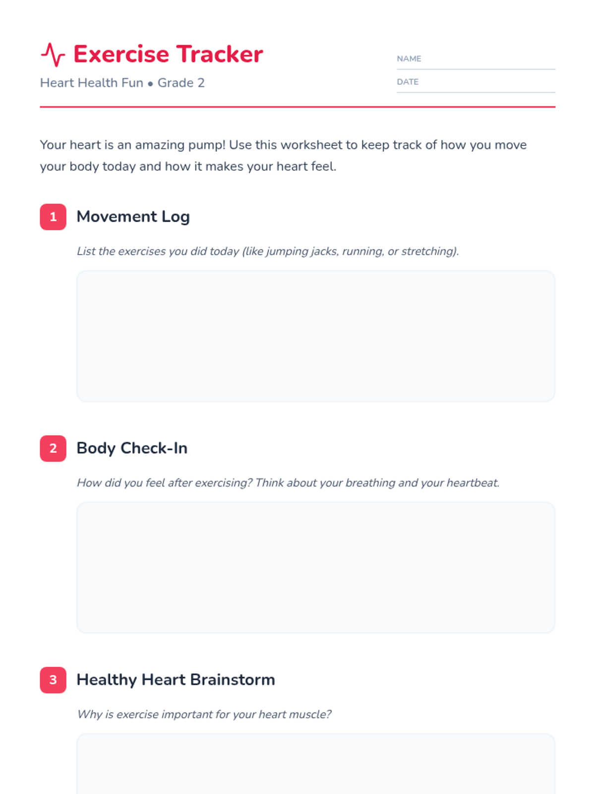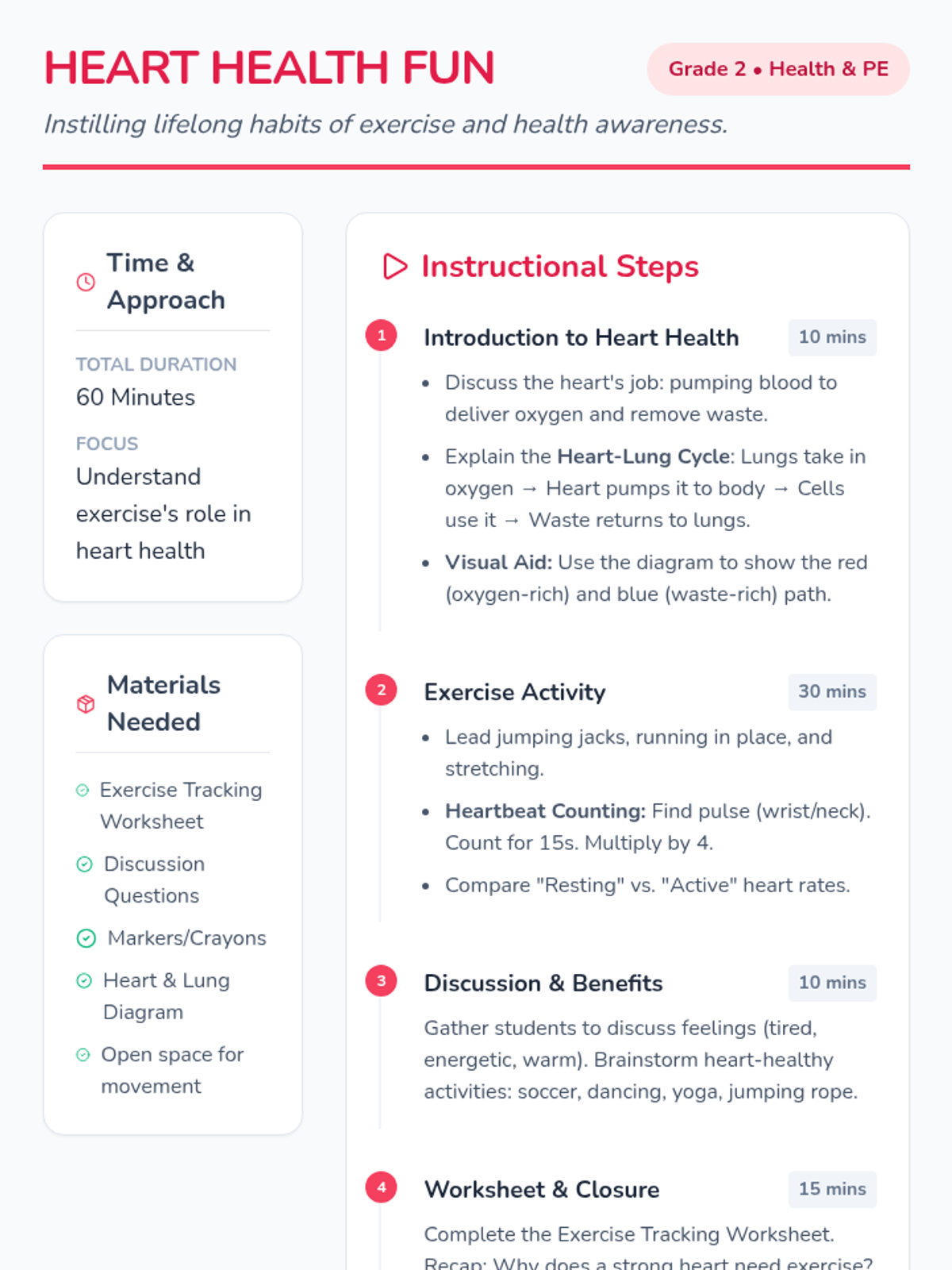 A vibrant Grade 2 lesson exploring how exercise keeps the heart strong, featuring interactive activities, a heart-lung diagram, and an exercise tracking challenge.