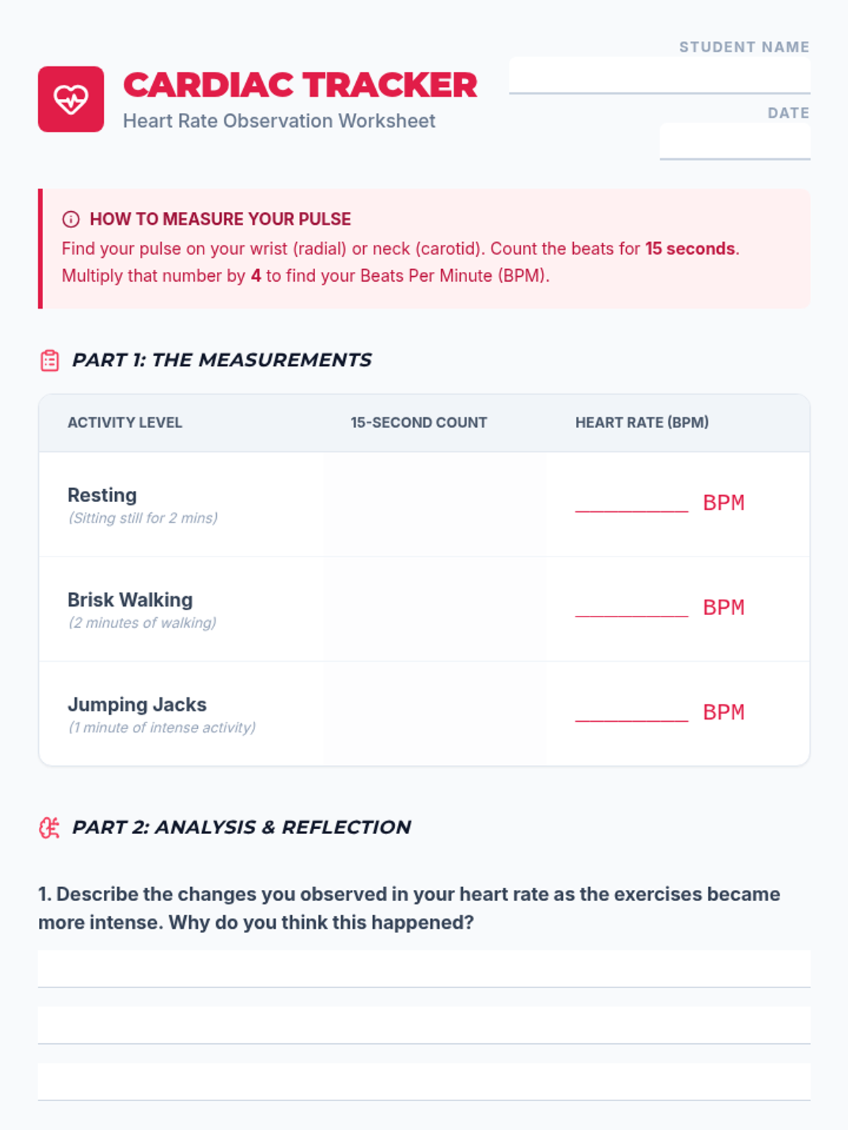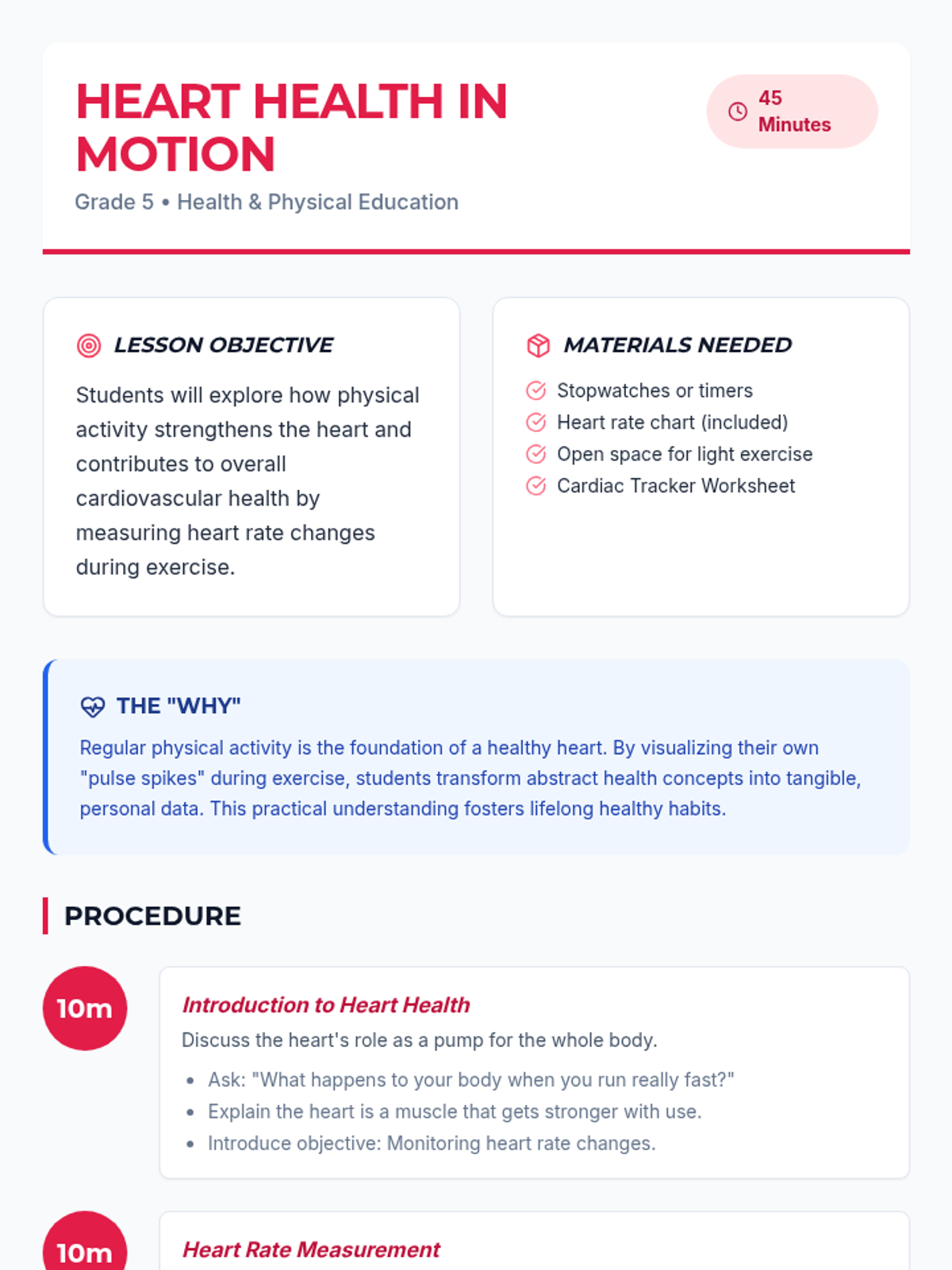 A lesson where students explore the relationship between physical activity and heart health through hands-on heart rate measurement and exercise.