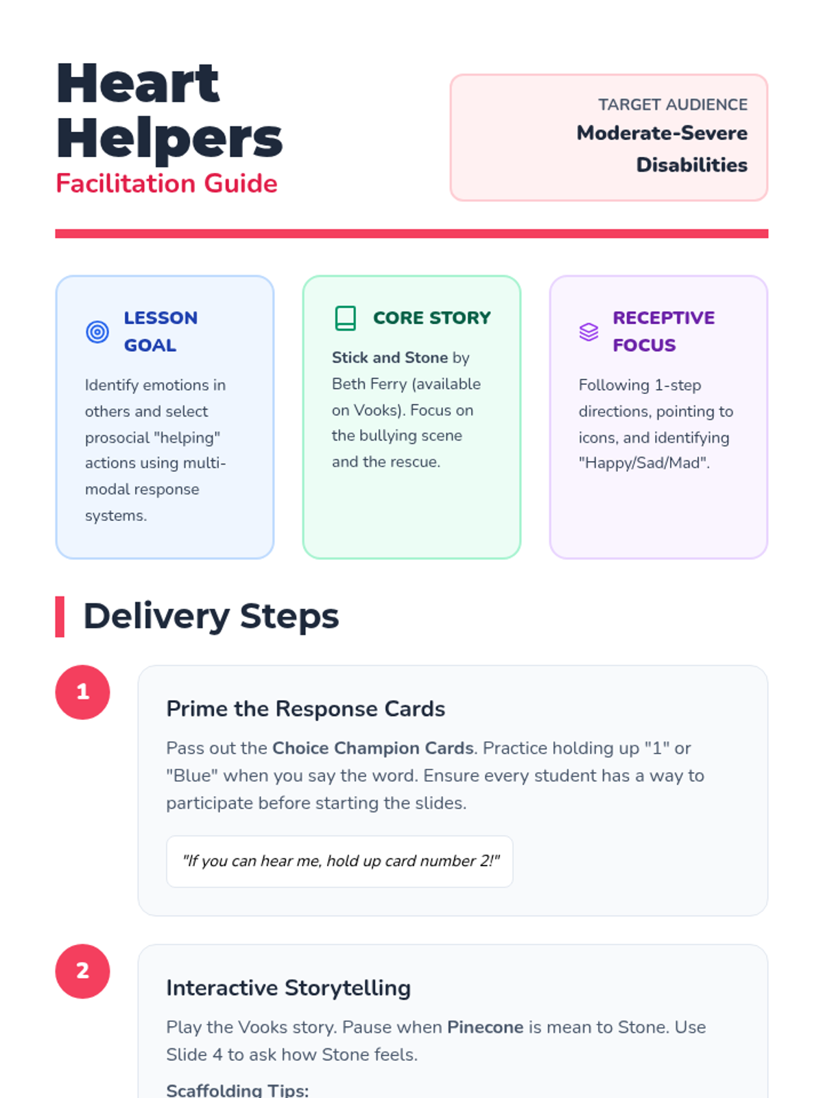 A specialized empathy lesson for students with moderate-to-severe learning disorders, focusing on identifying feelings and helping others through the story 'Stick and Stone'. Includes multi-modal response options for verbal and non-verbal learners.