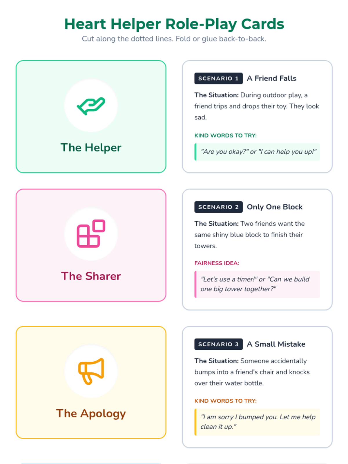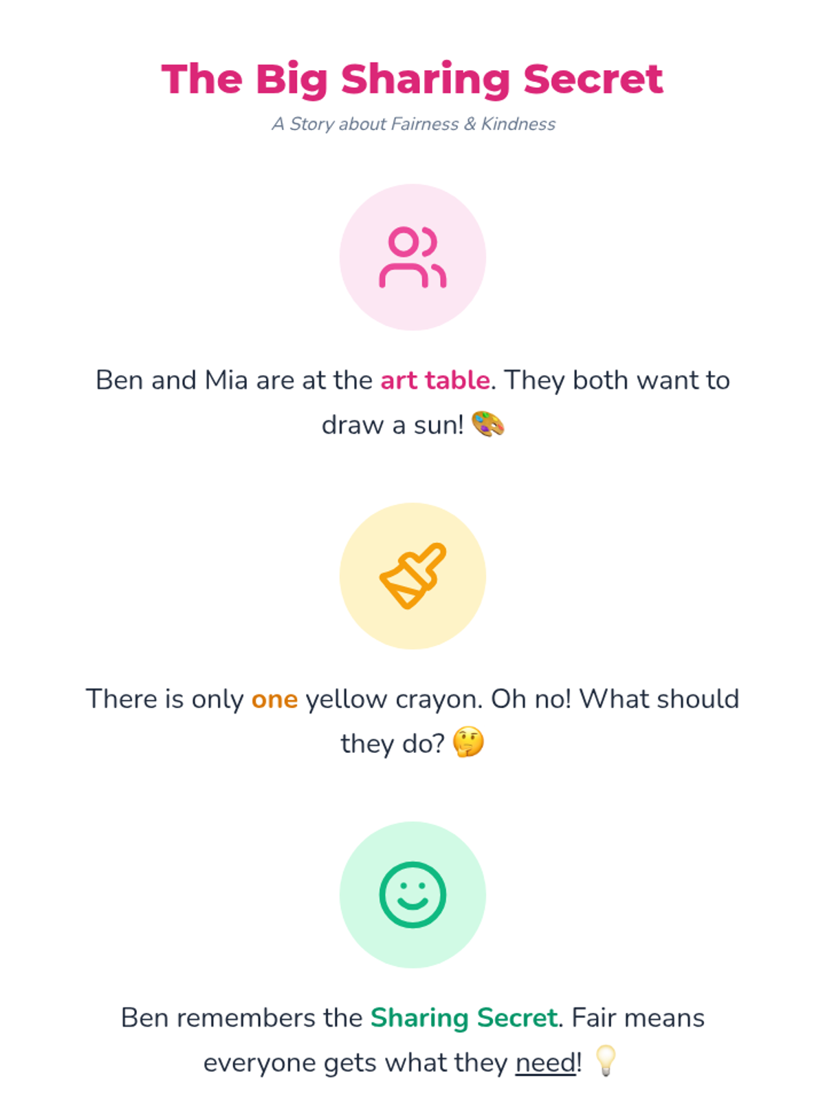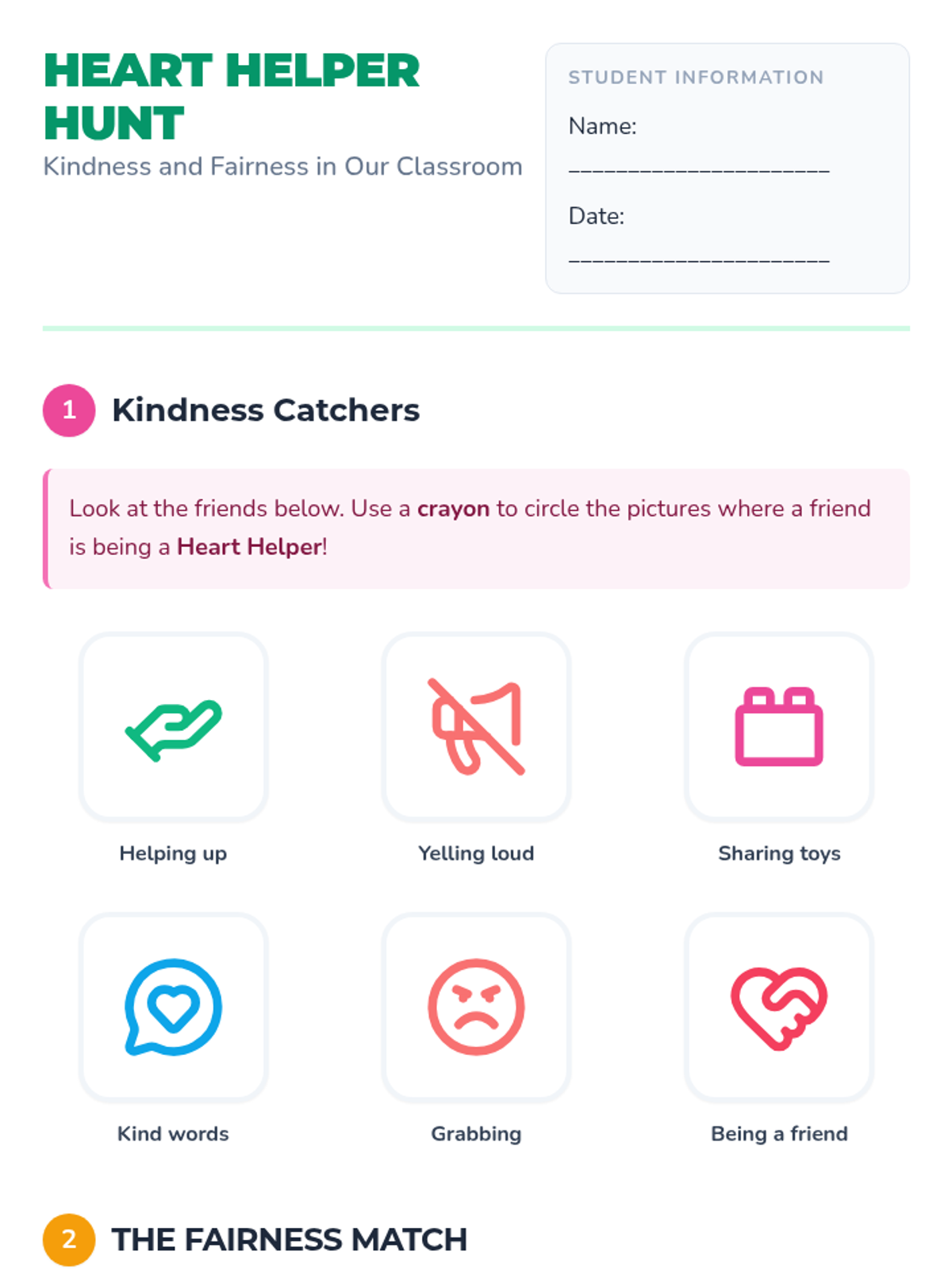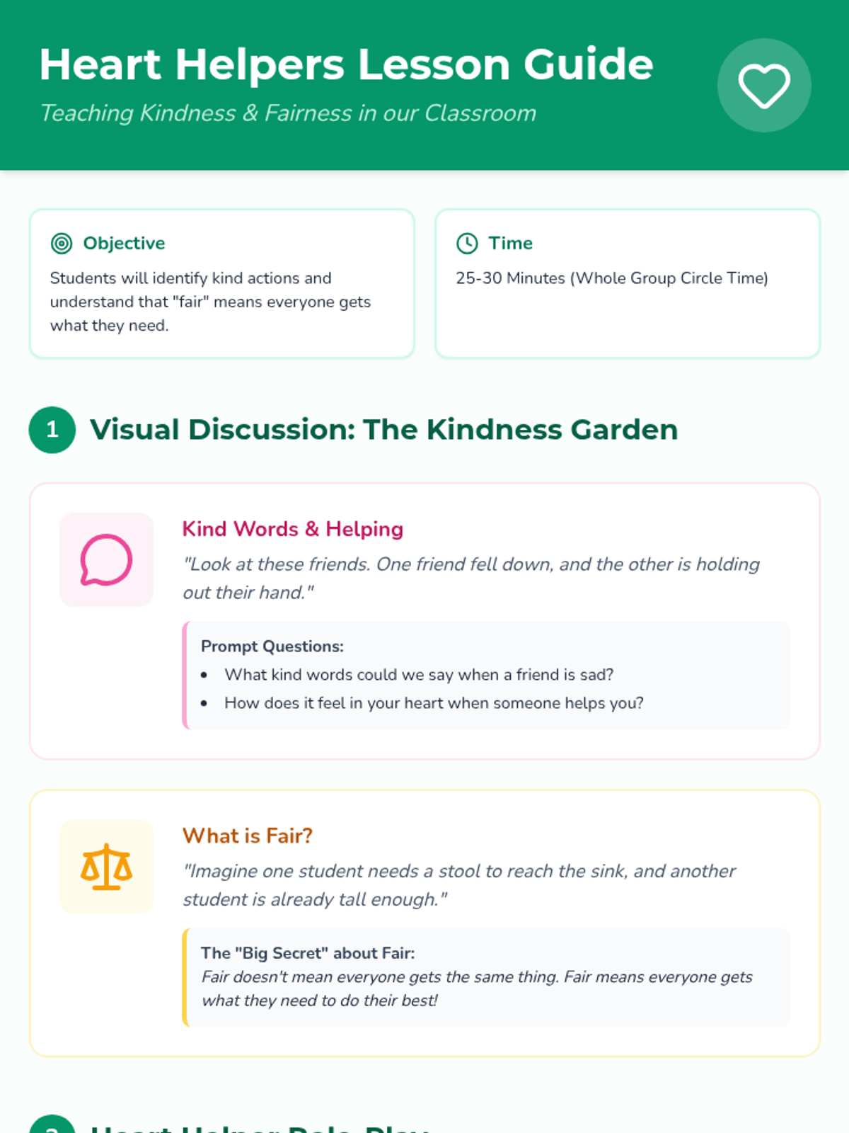 A comprehensive Pre-K lesson focused on teaching fairness (equity vs. equality) and kindness through visual discussion, role-play, and a social story. Students will learn to use kind words, resolve small conflicts, and understand that everyone gets what they need to succeed.