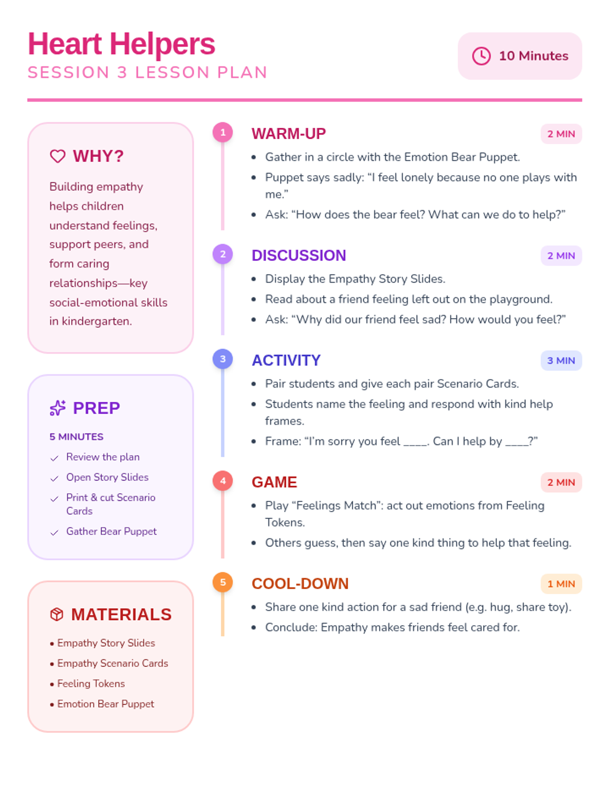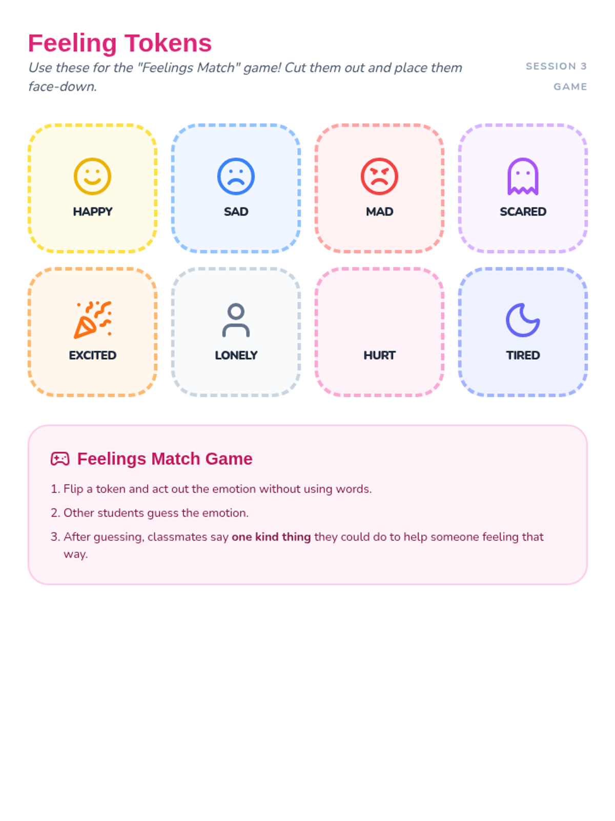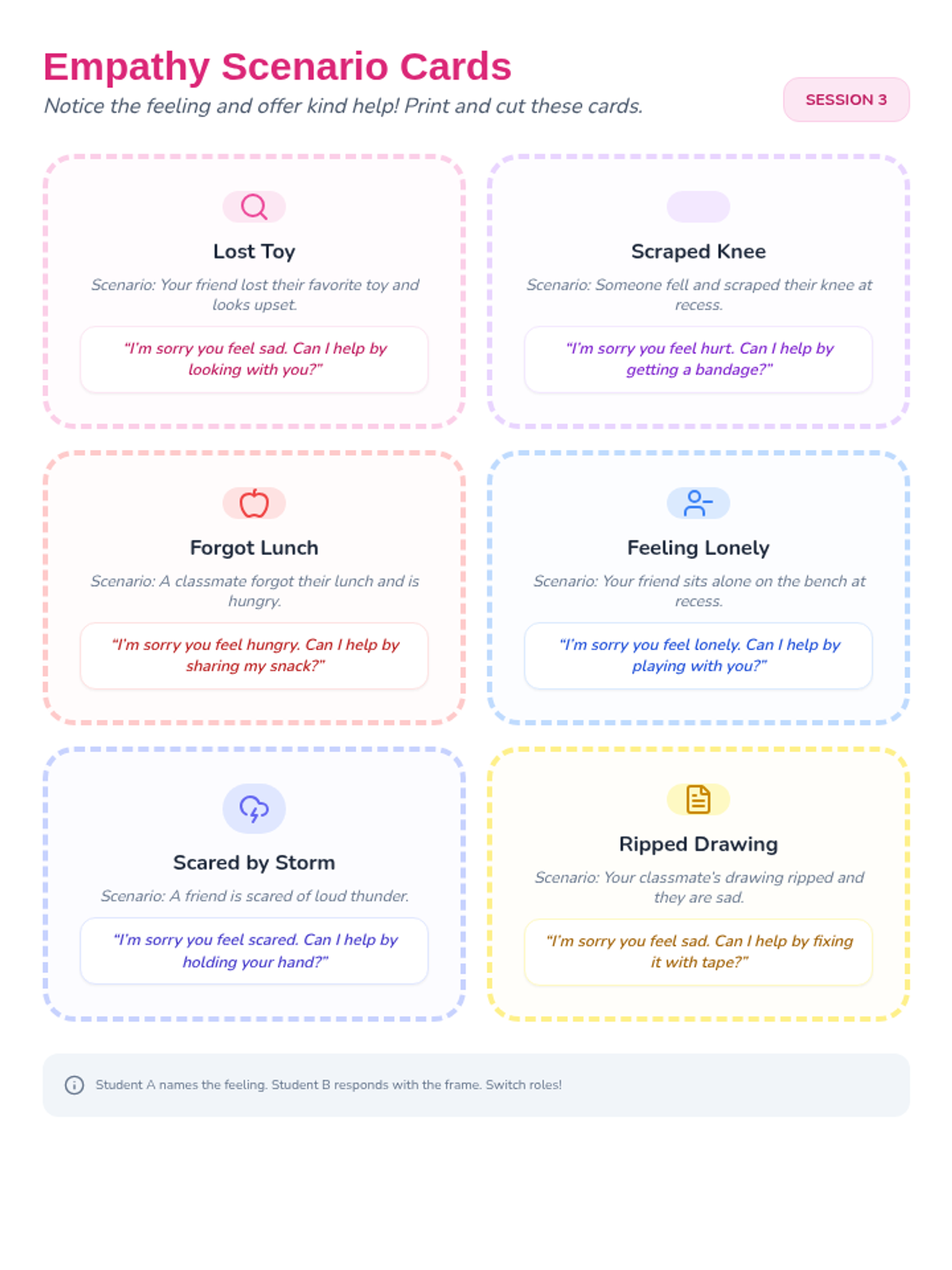 Students will recognize and name emotions in themselves and others, practice perspective-taking, and offer kind responses to peers.