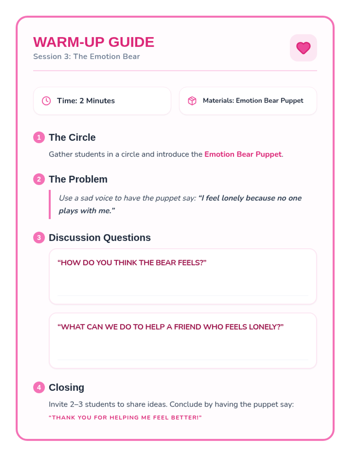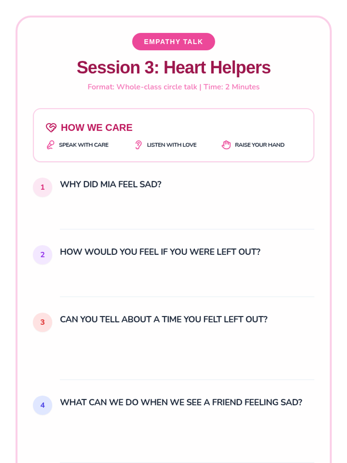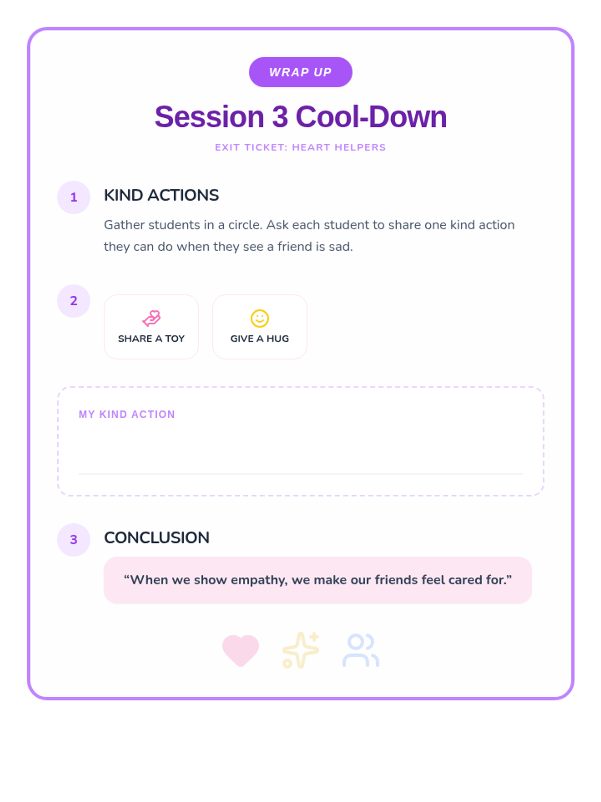 Students will recognize and name emotions in themselves and others, practice perspective-taking, and offer kind responses to peers.