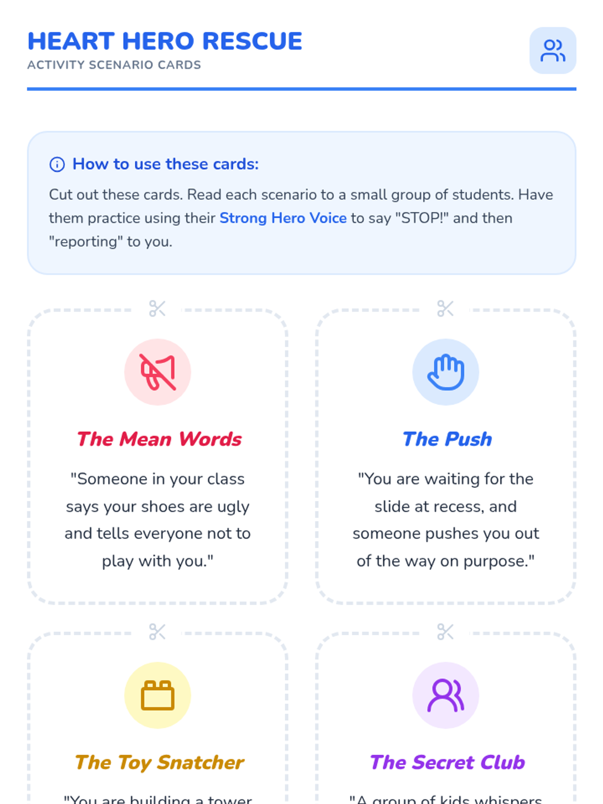 A social-emotional learning lesson for K-1 students focused on identifying bullying behaviors, practicing kindness, and learning how to stand up safely and report to adults.