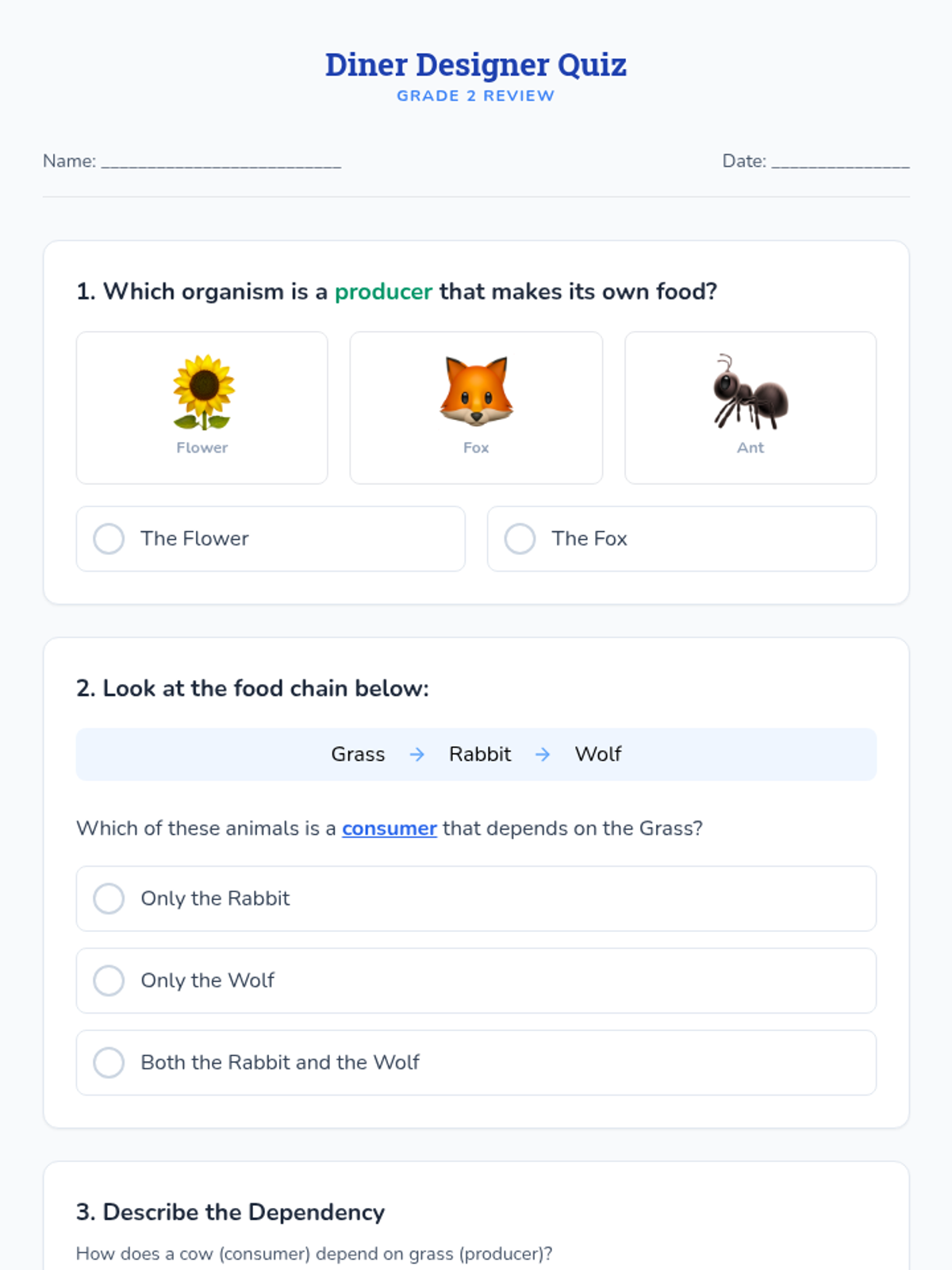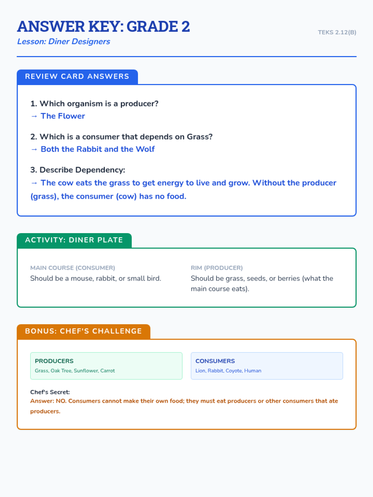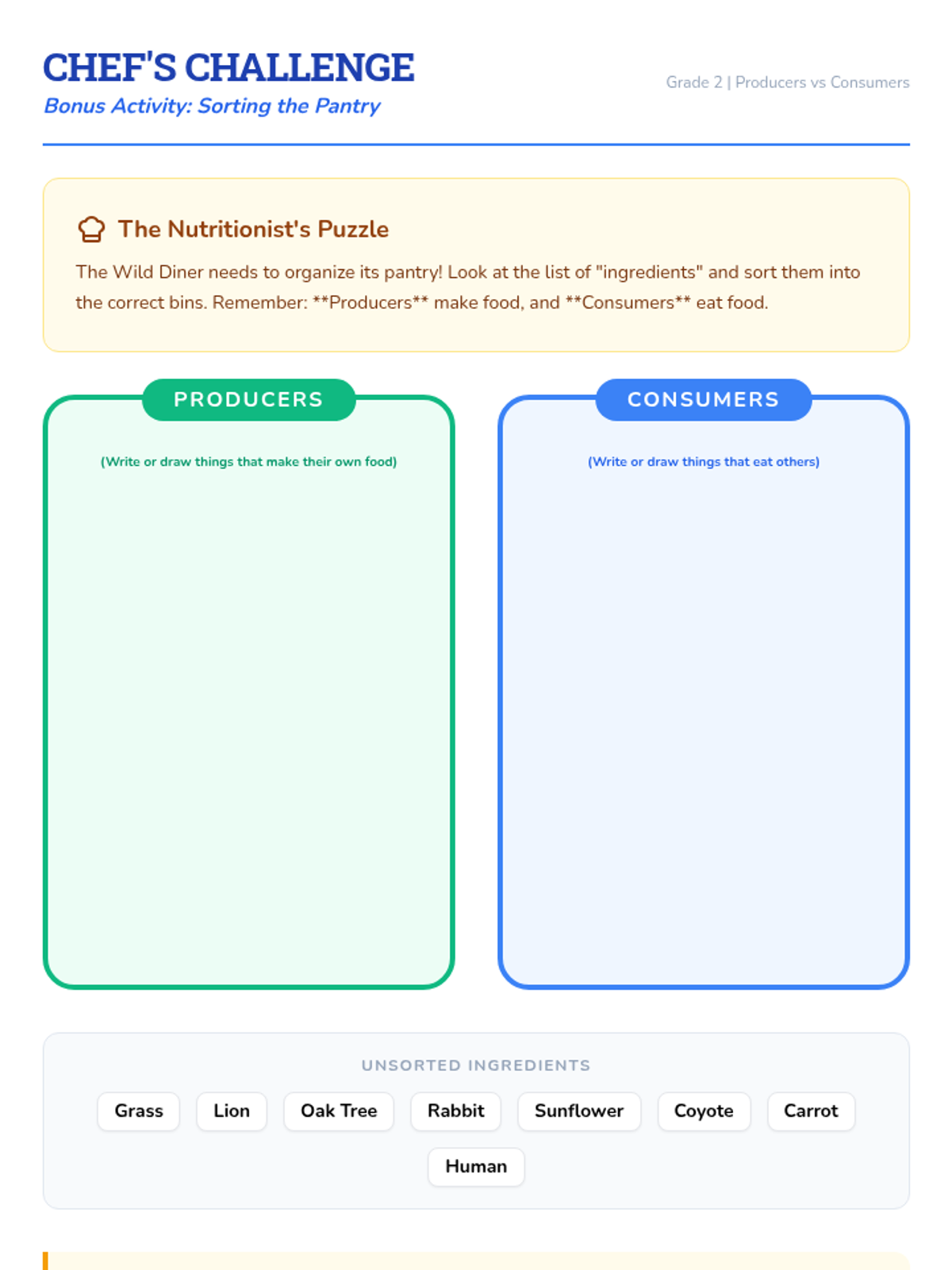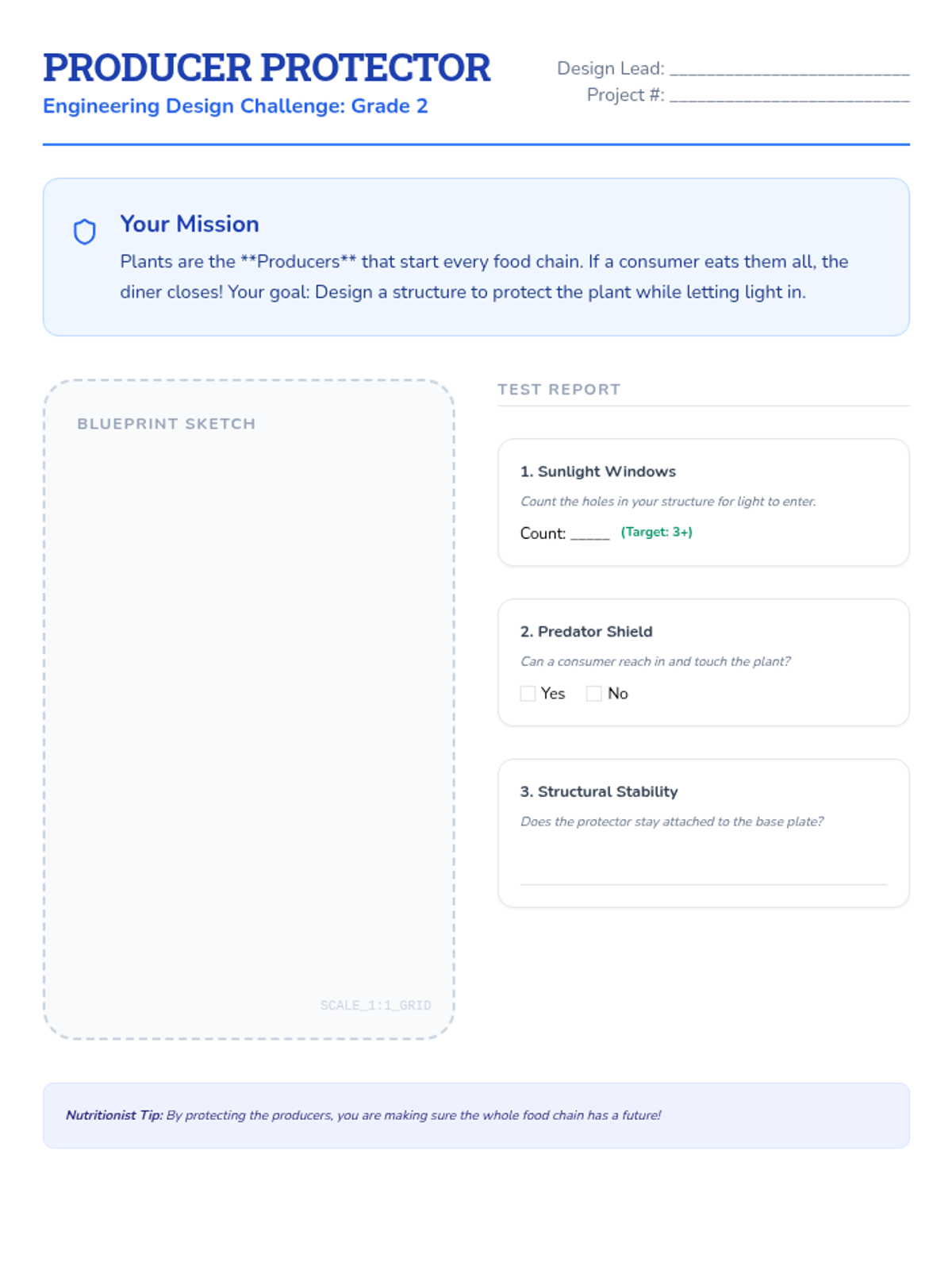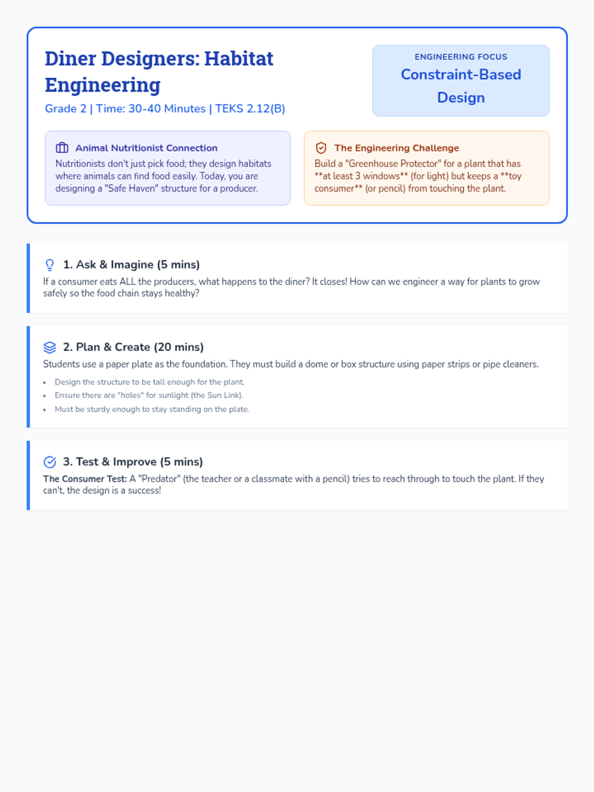 Students step into the role of Animal Nutritionists to design "Dining Menus" that identify producers and consumers, demonstrating the dependency of animals on other living things.
