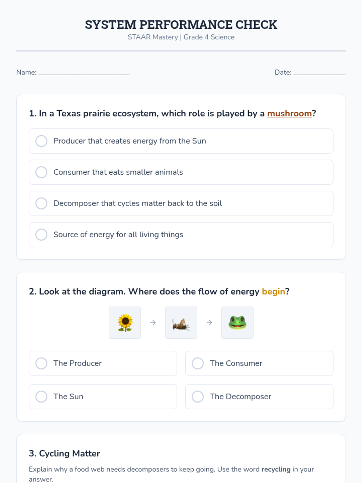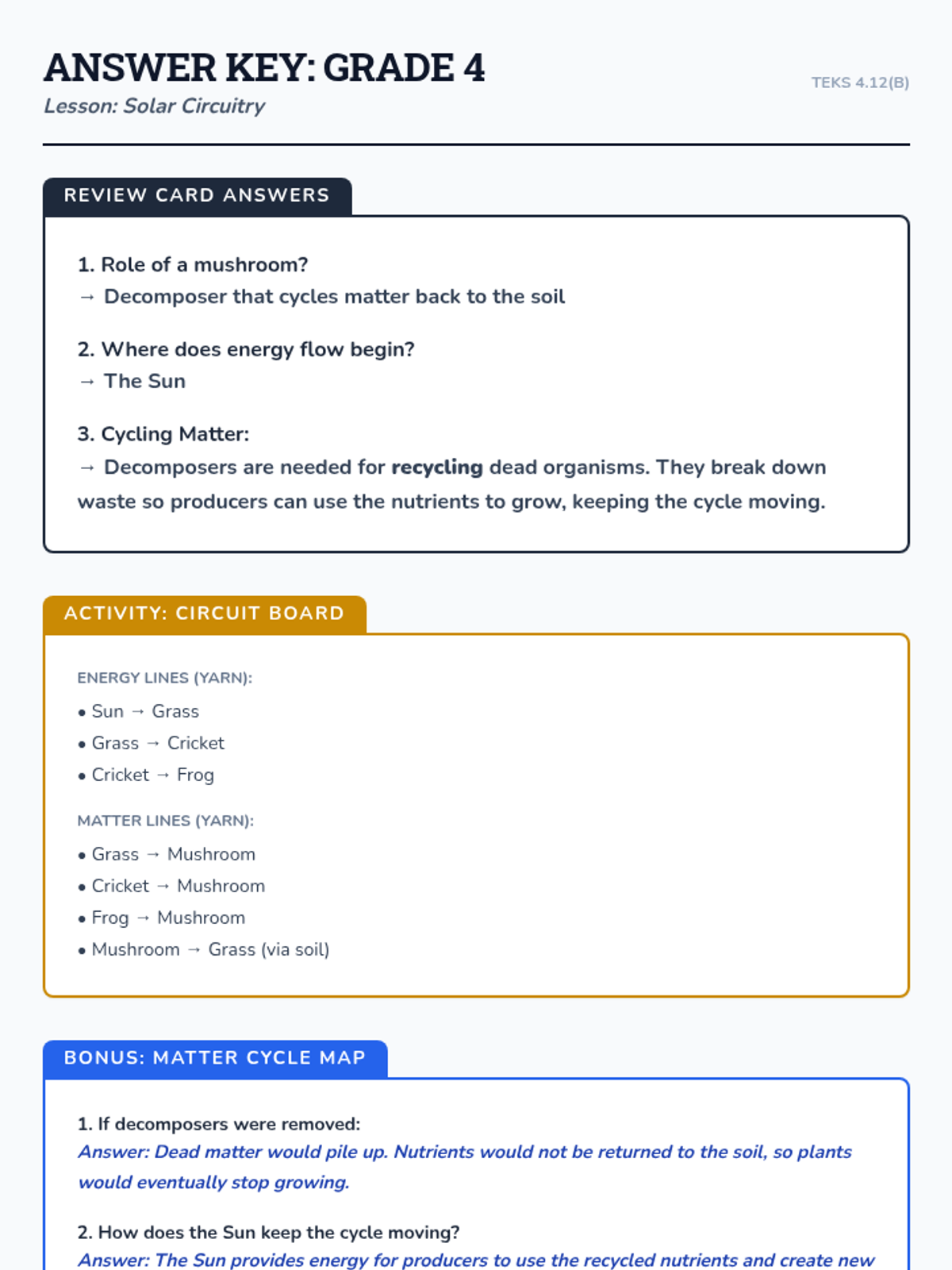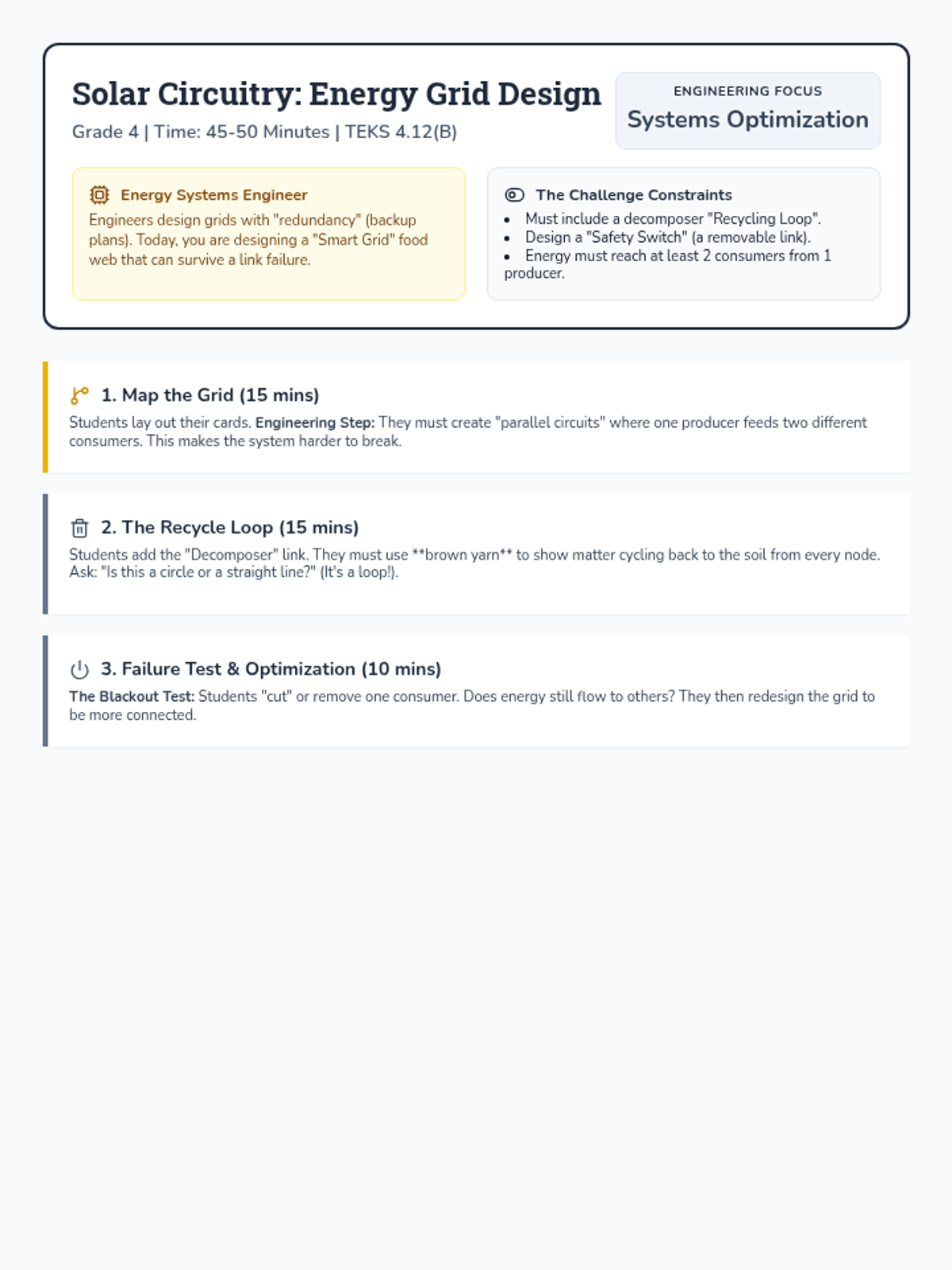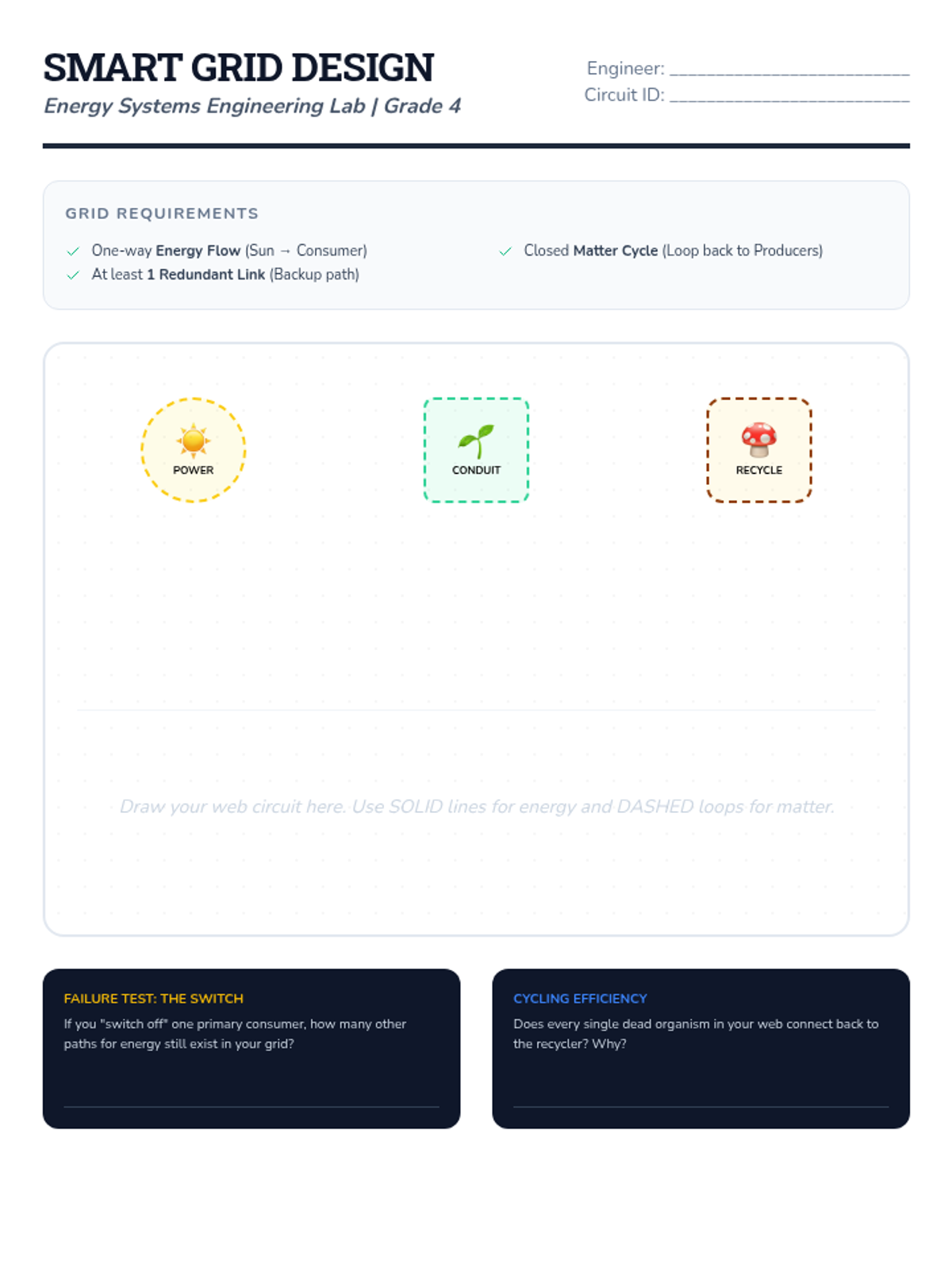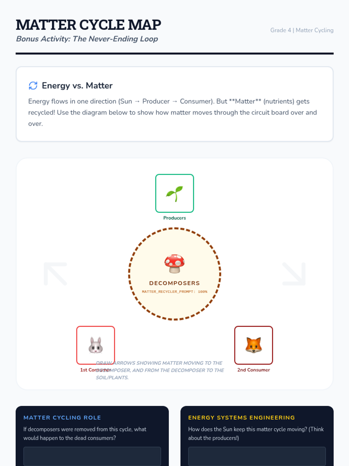 Students model the role of the Sun and decomposers as Energy Systems Engineers, mapping complex food webs with color-coded "Energy Lines" to show matter cycling.