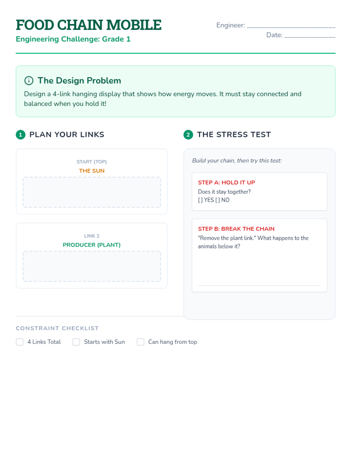 Students explore the delicate balance of ecosystem communities by engineering a "Population Mobile" that demonstrates how the removal of one species impacts the entire dependency web.