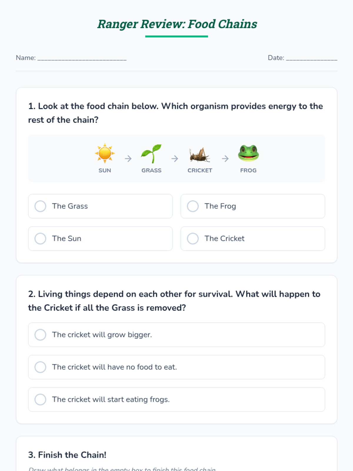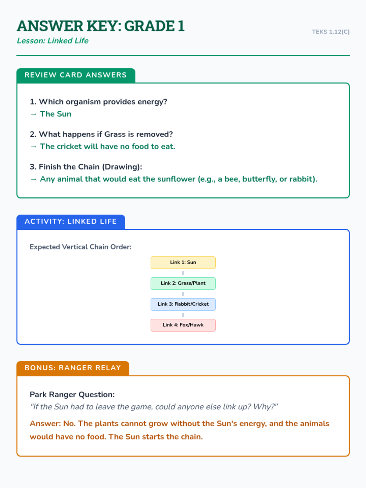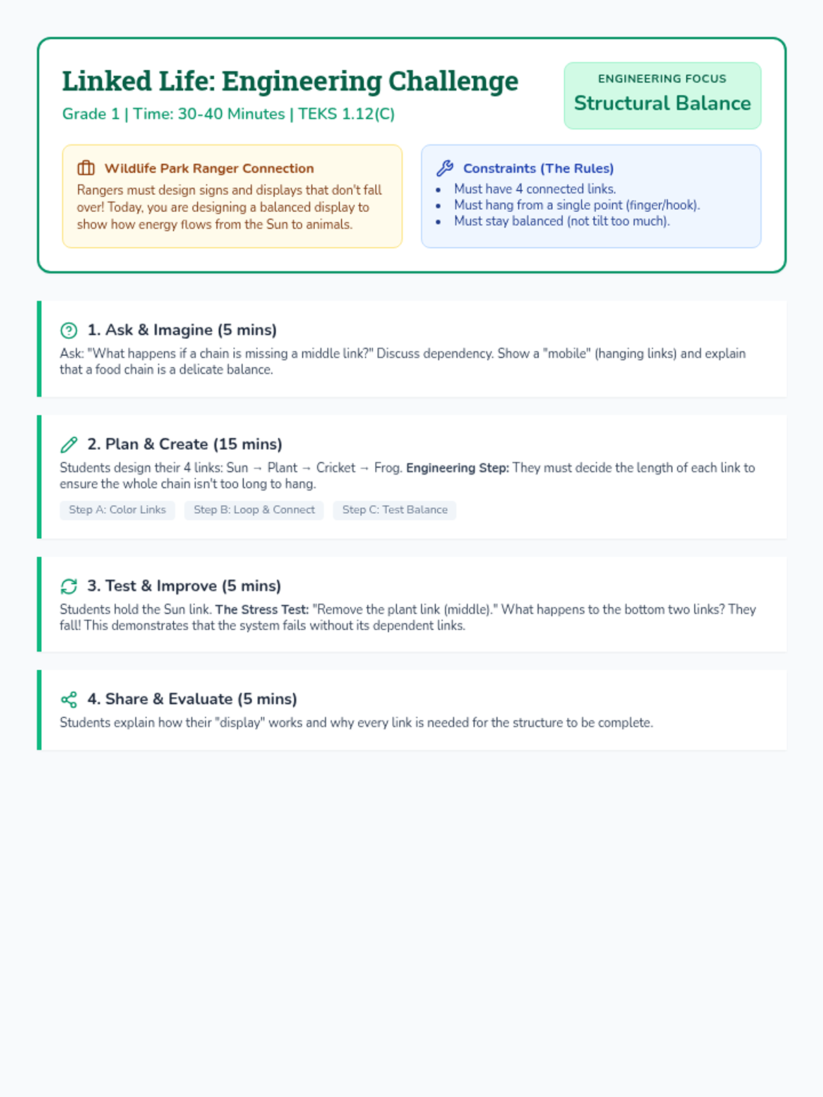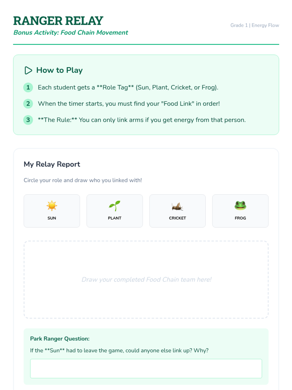 Students will act as Wildlife Park Rangers to build and illustrate vertical paper food chains, identifying how living organisms depend on each other for survival.