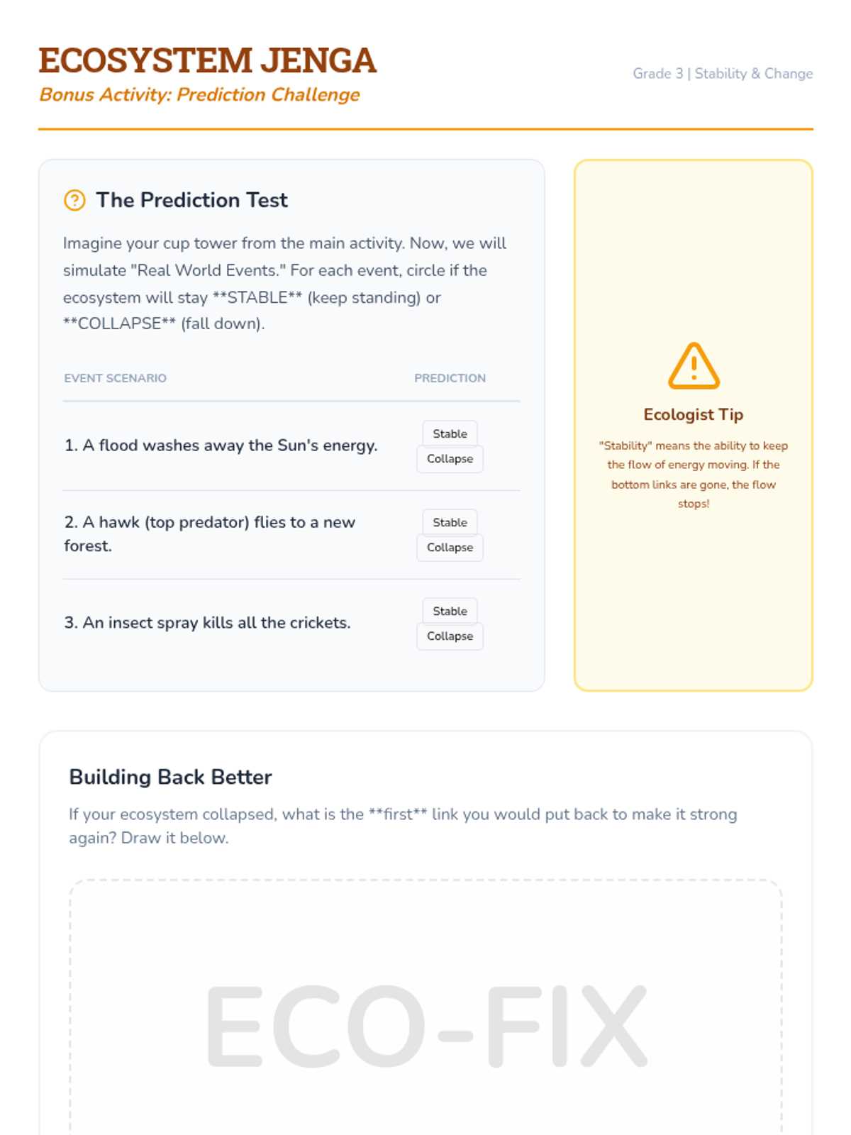 As Environmental Restoration Specialists, students analyze the impact of changes like invasive species or drought on a food web and design data-driven solutions to protect energy flow.