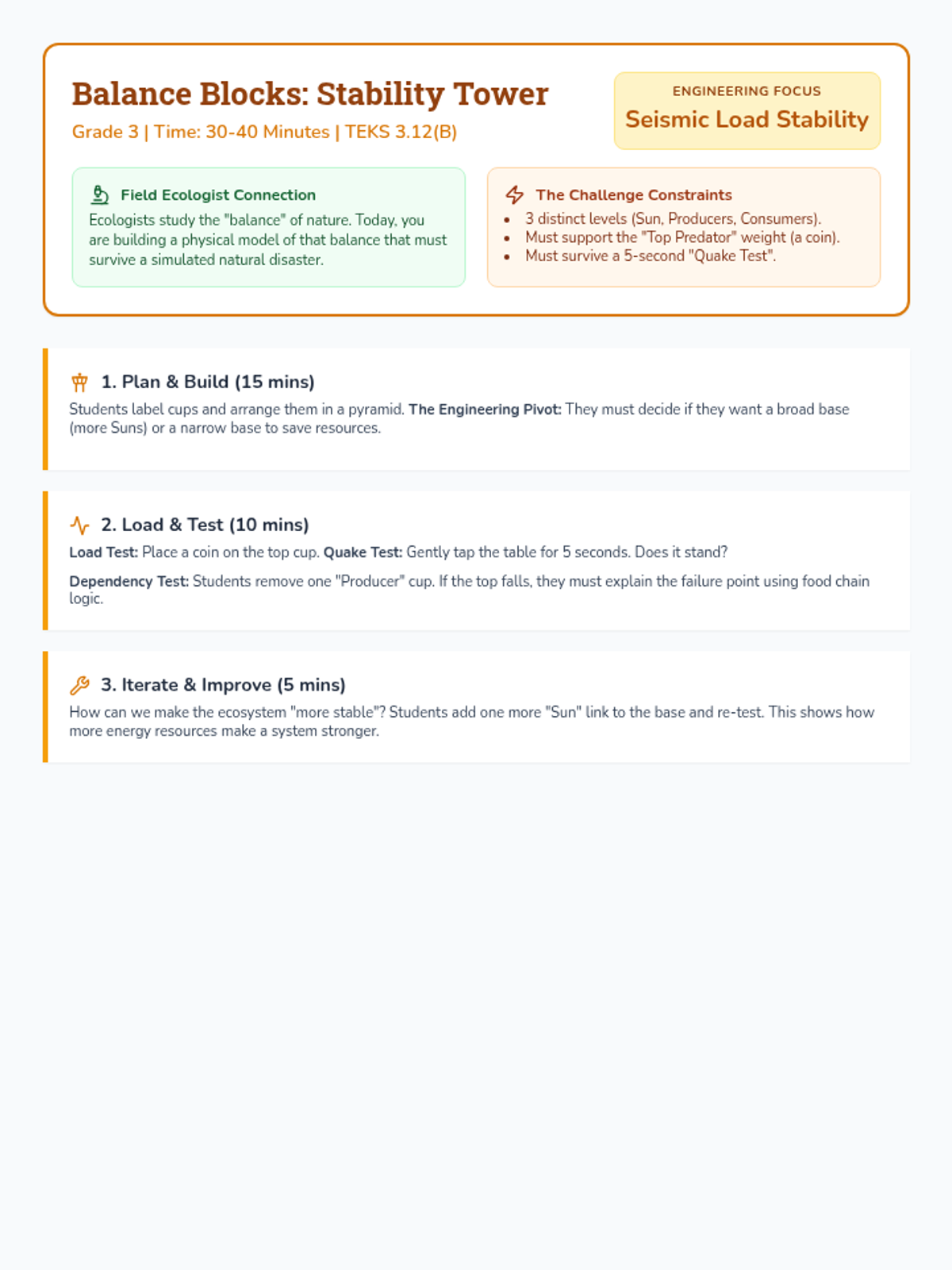 5th Grade students optimize their designs for efficiency, calculating load-to-weight ratios and managing material constraints. Focus on TEKS 5.11(A) and 5.13(A).