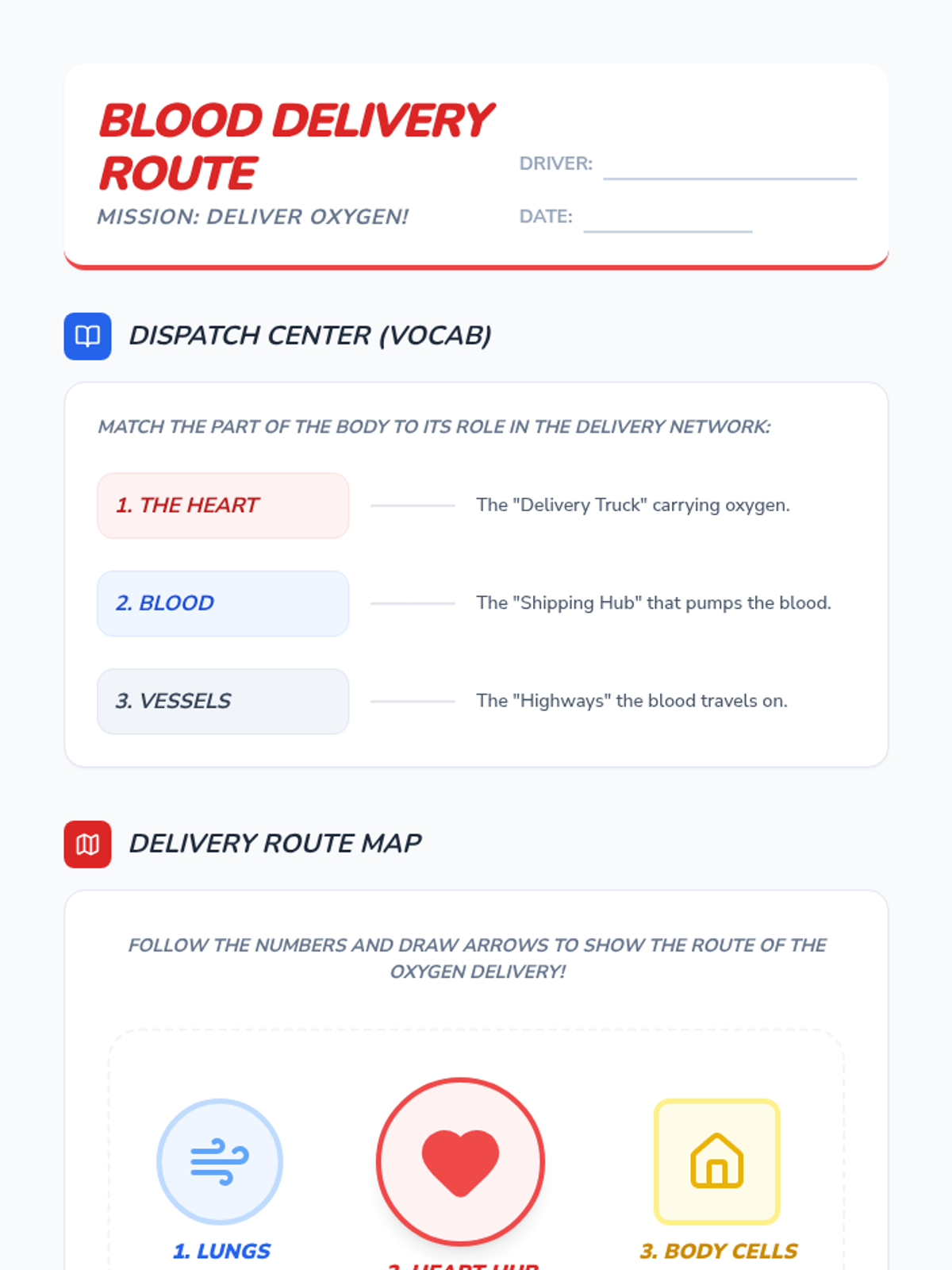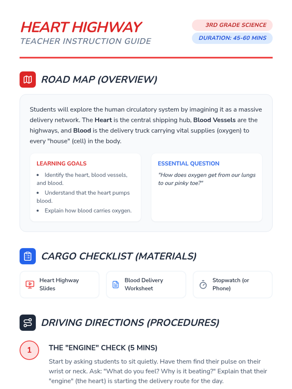 A 3rd-grade science lesson exploring the circulatory system as a delivery network, covering the heart, blood vessels, and blood's role in transporting oxygen.