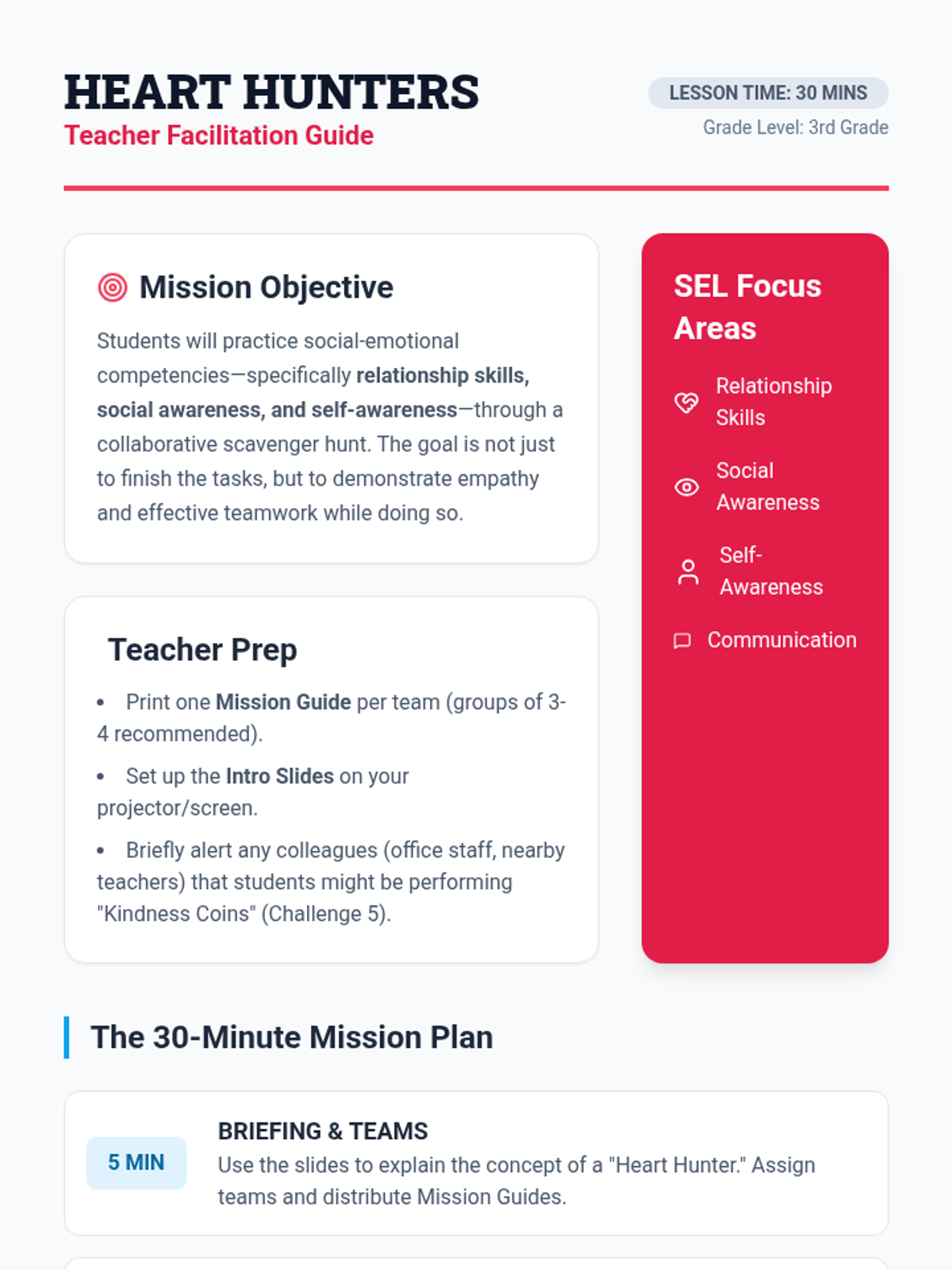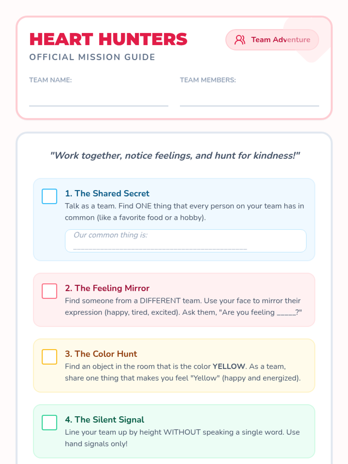A collaborative team-building scavenger hunt focused on social-emotional learning skills like empathy, communication, and self-awareness for 3rd grade students.