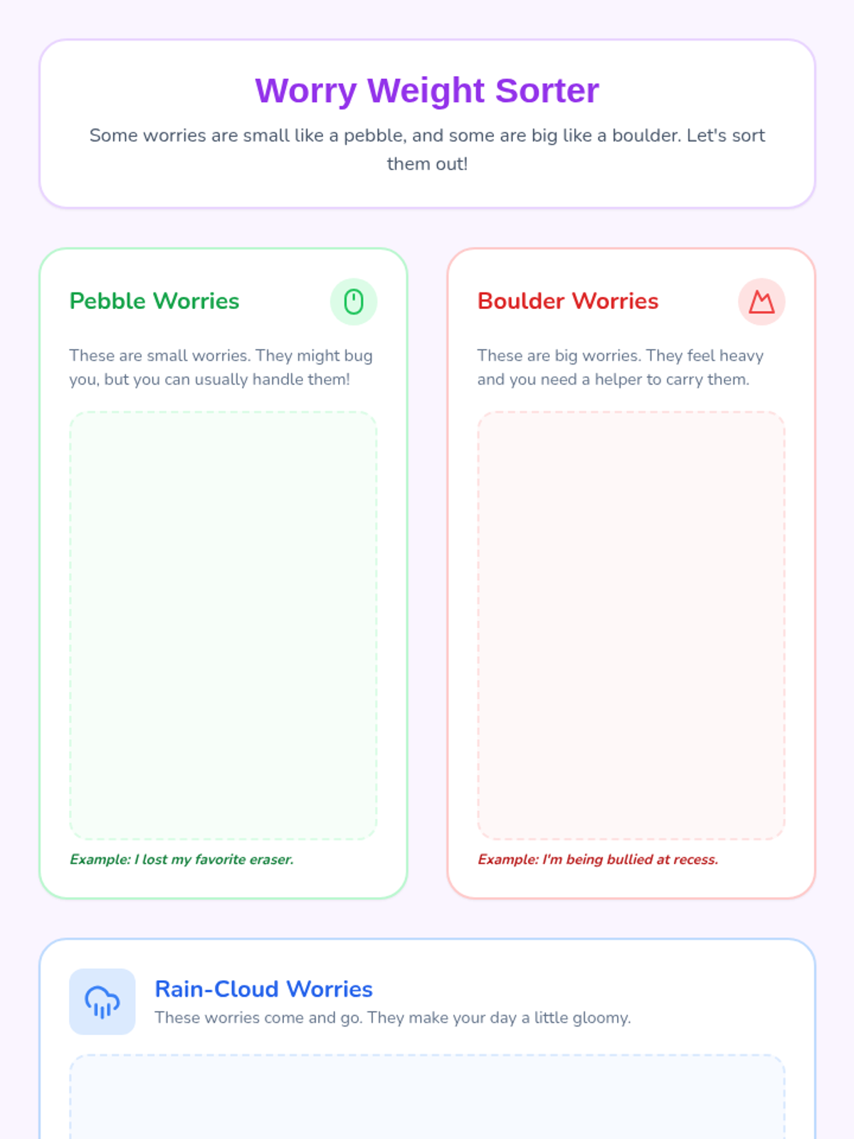 Active practice sorting various thoughts into 'stay inside' and 'can come out' categories through interactive games.