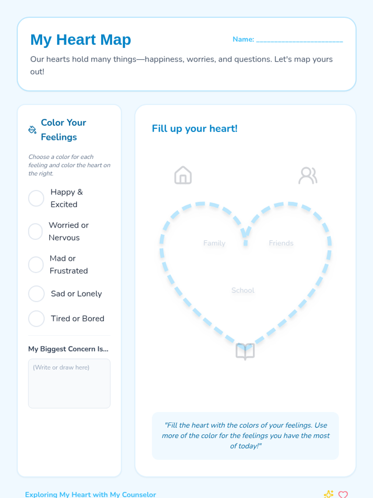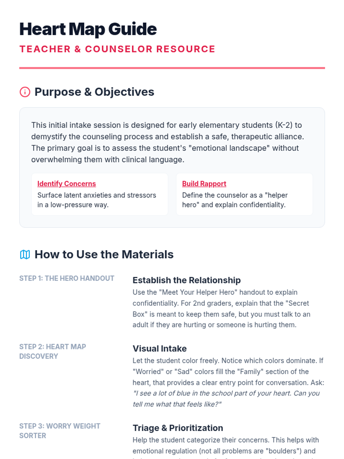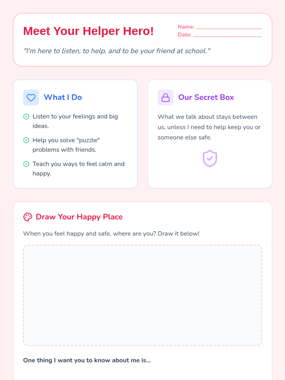 A gentle introduction to school counseling for second graders, focusing on building rapport, understanding the counselor's role, and identifying personal feelings and concerns through creative SEL activities.
