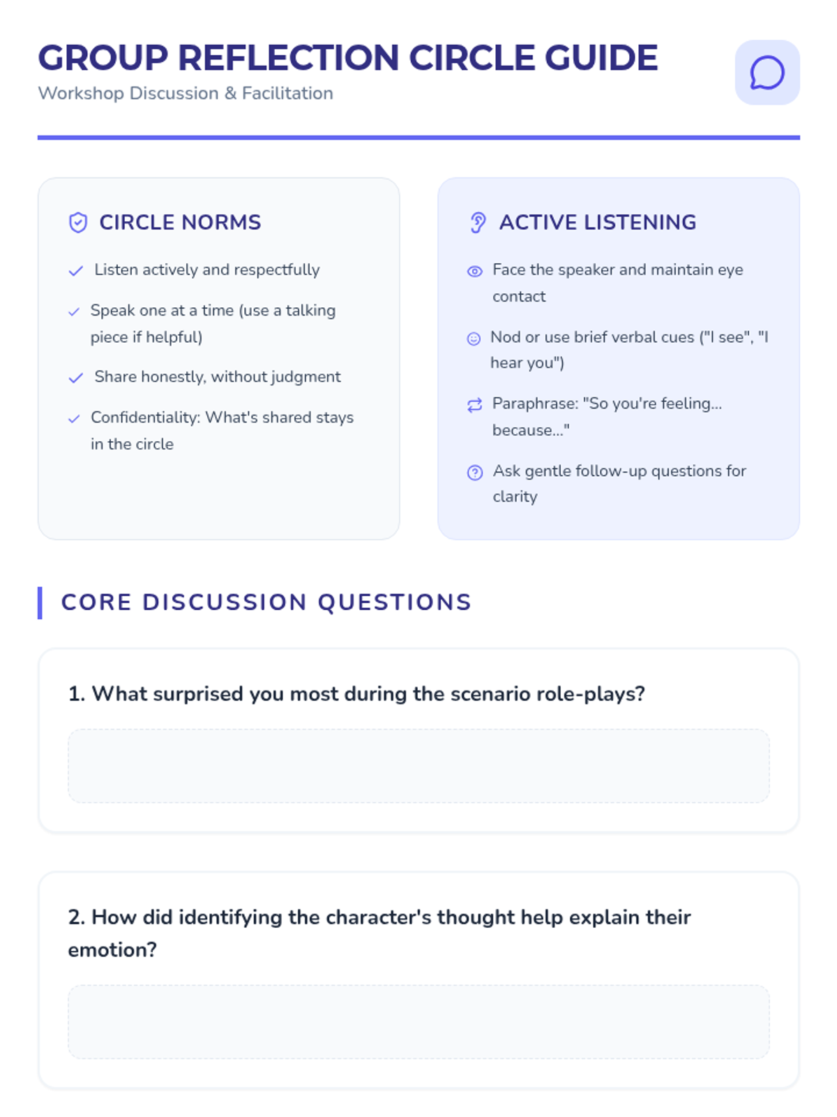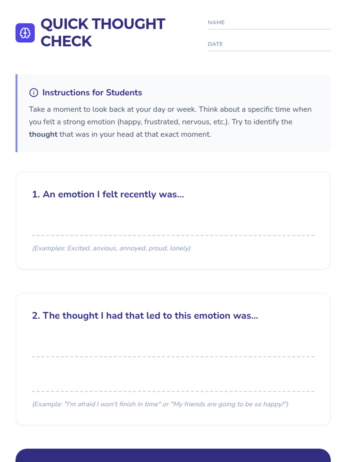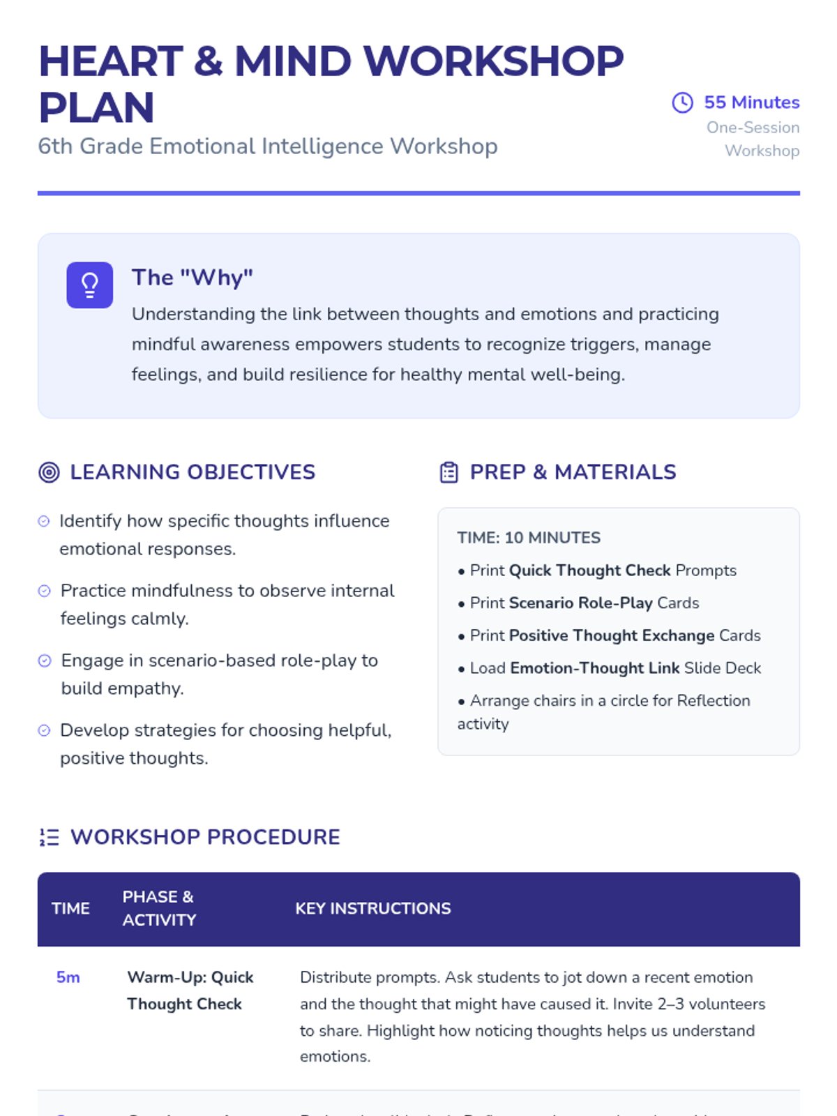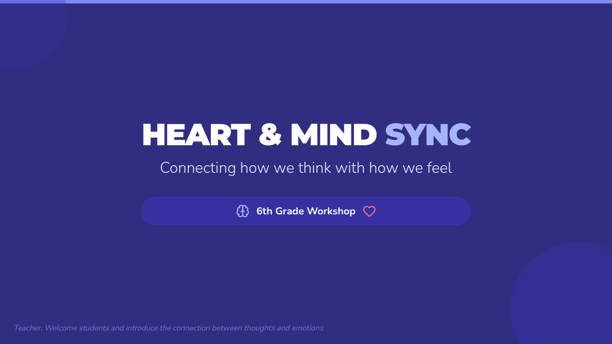 A 55-minute workshop for 6th graders to understand the connection between thoughts and emotions. Students engage in interactive scenarios, mindfulness exercises, and group reflections to build self-awareness and emotional regulation skills.