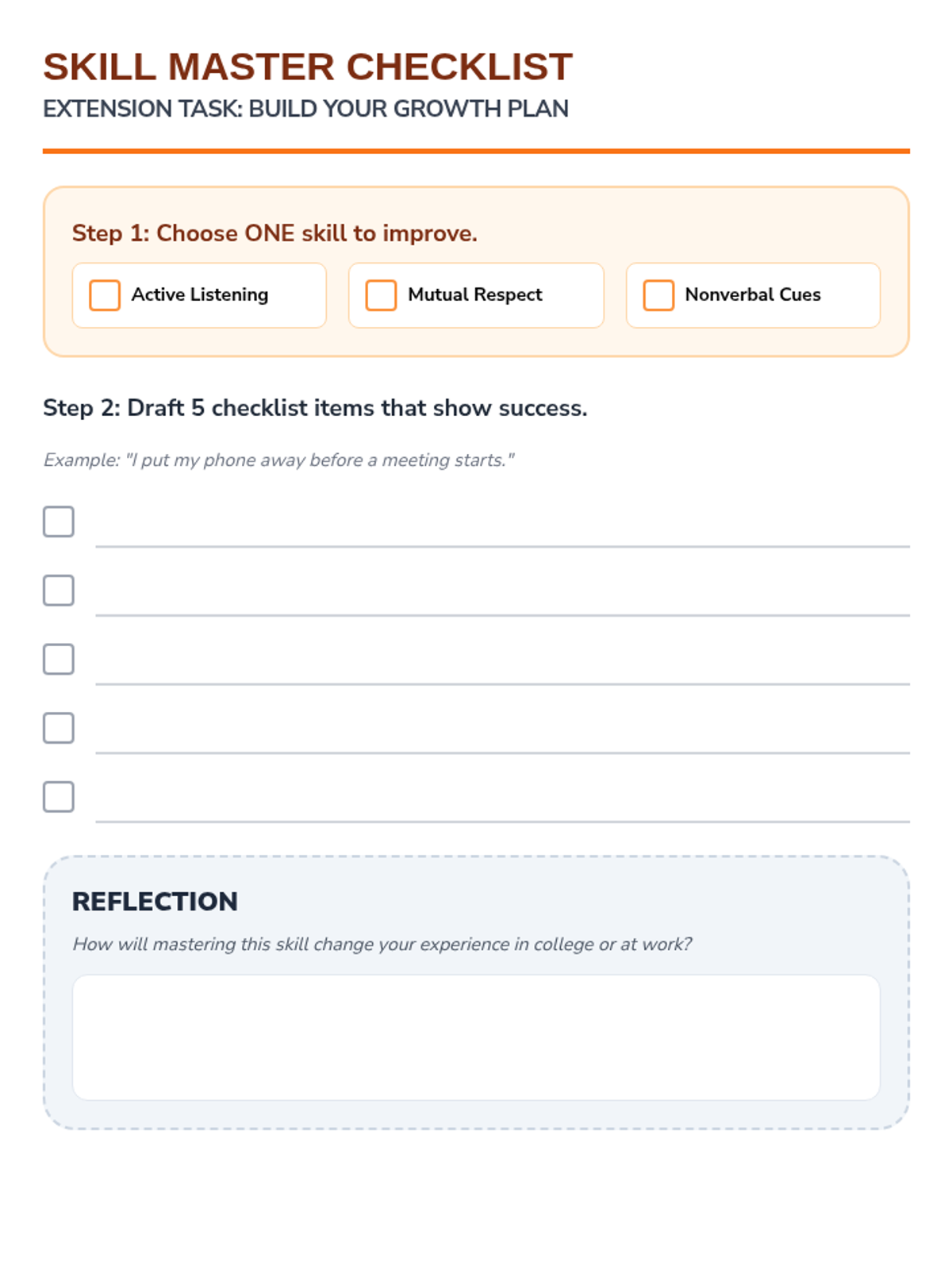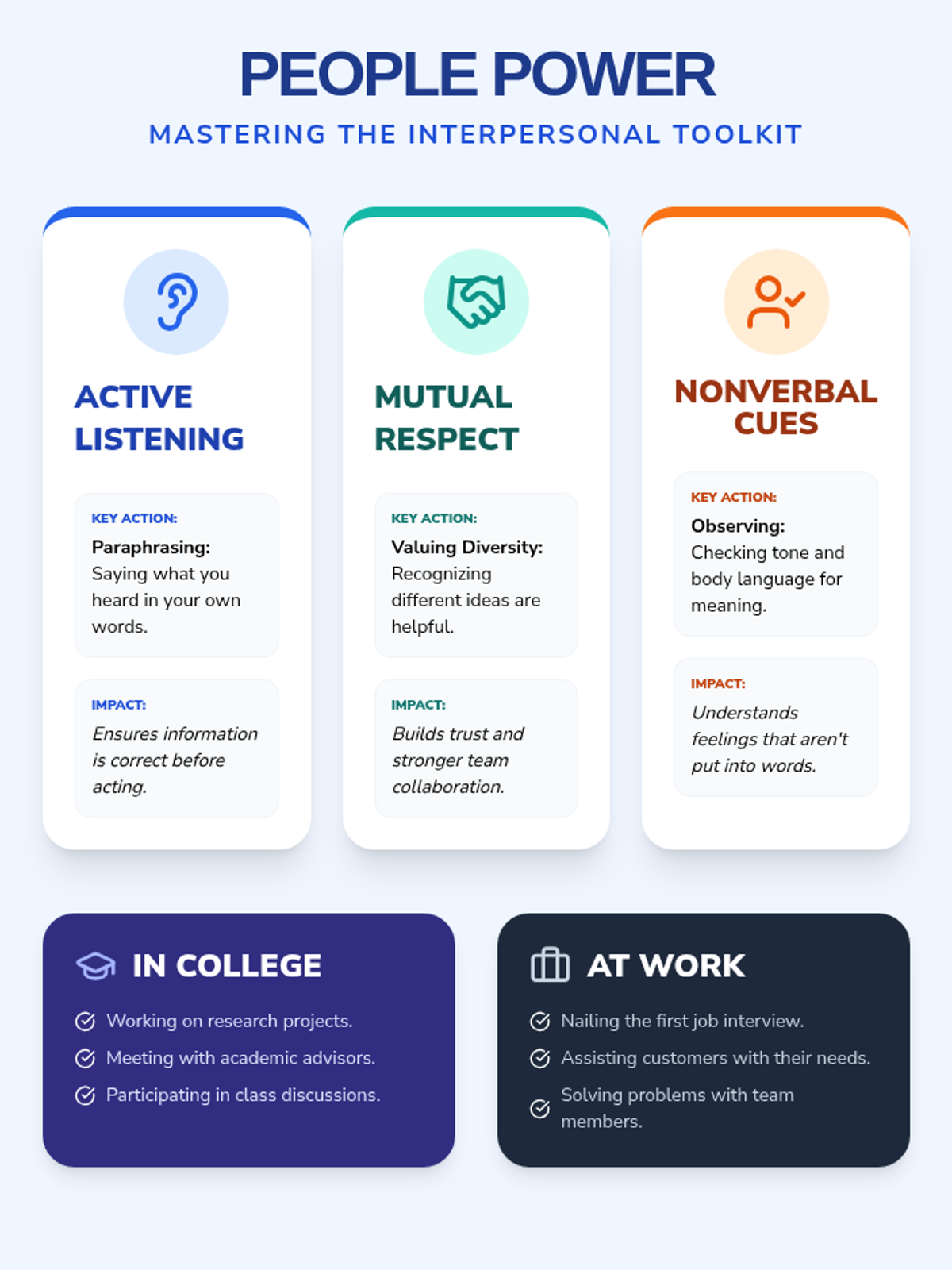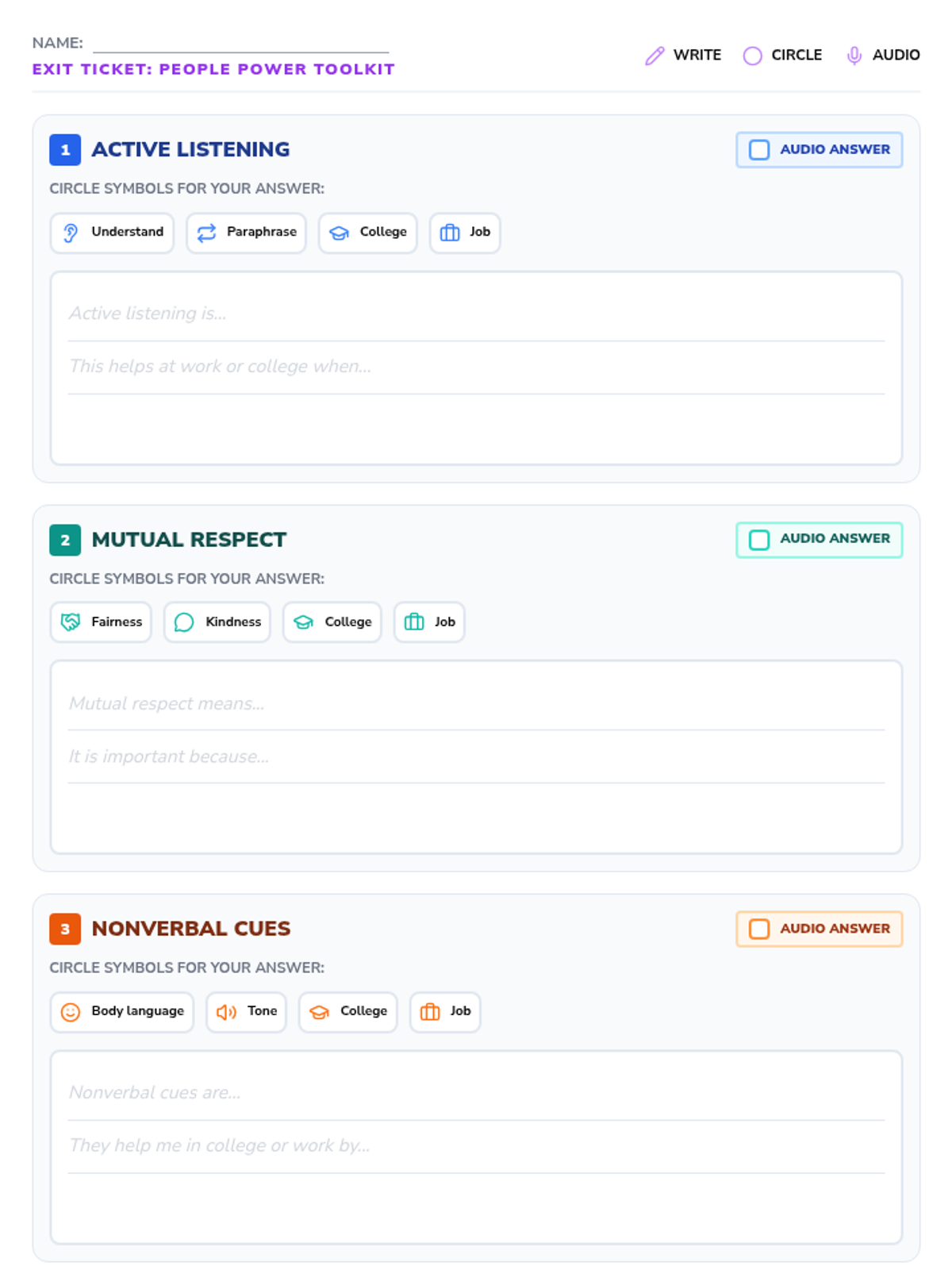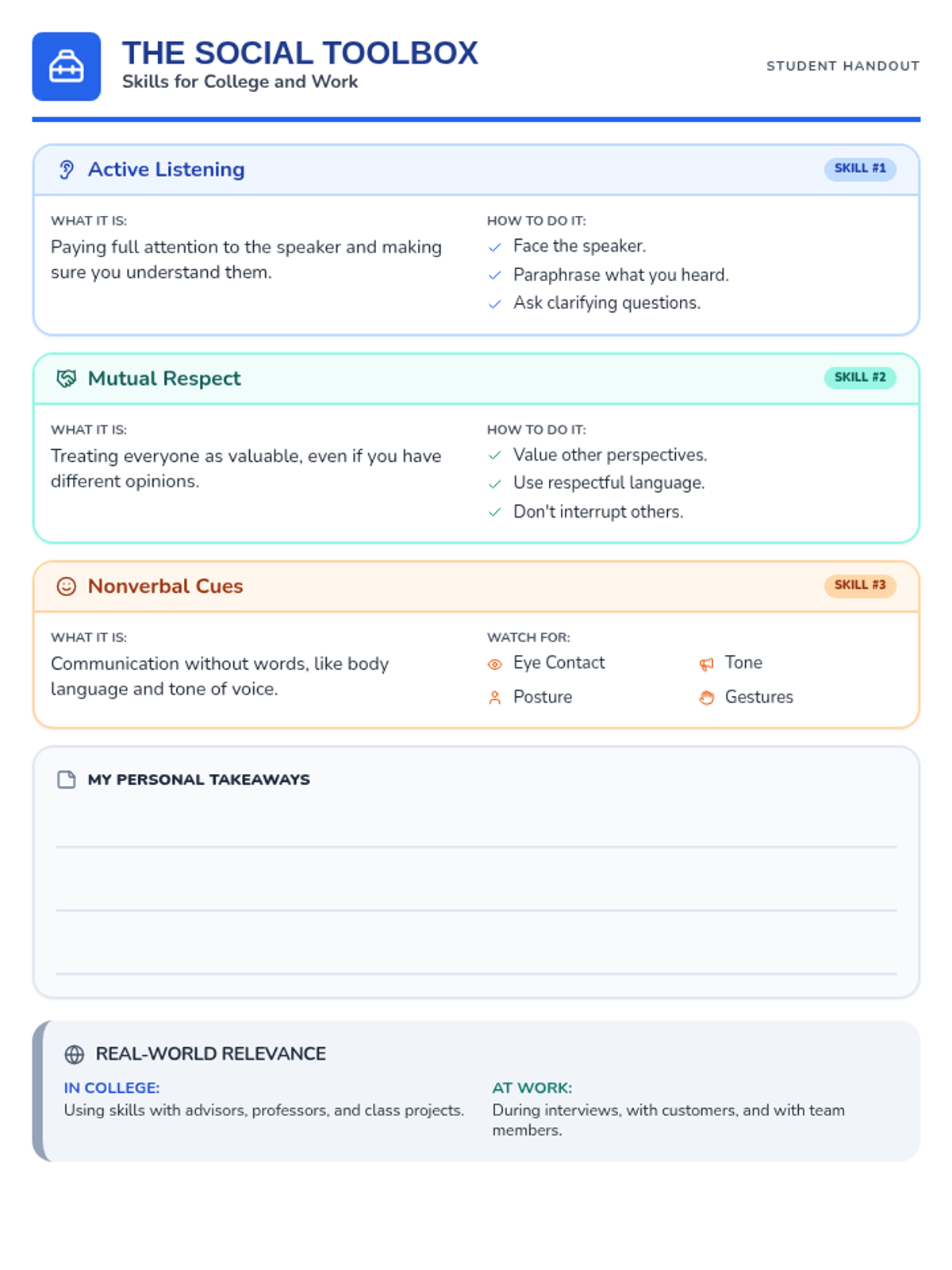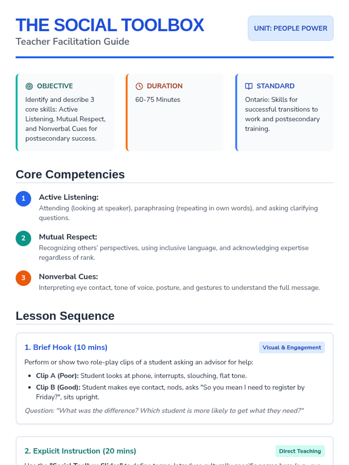 This lesson introduces three essential interpersonal skills—active listening, mutual respect, and interpreting nonverbal cues—demonstrating their real-world application in college and workplace settings. Students engage in interactive scenario analysis and complete a multi-modal exit ticket to demonstrate understanding.