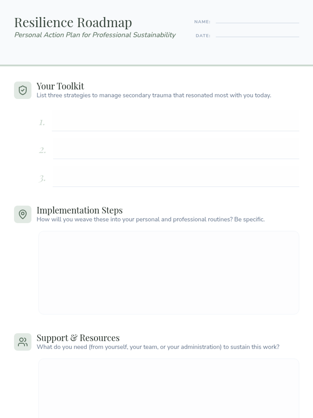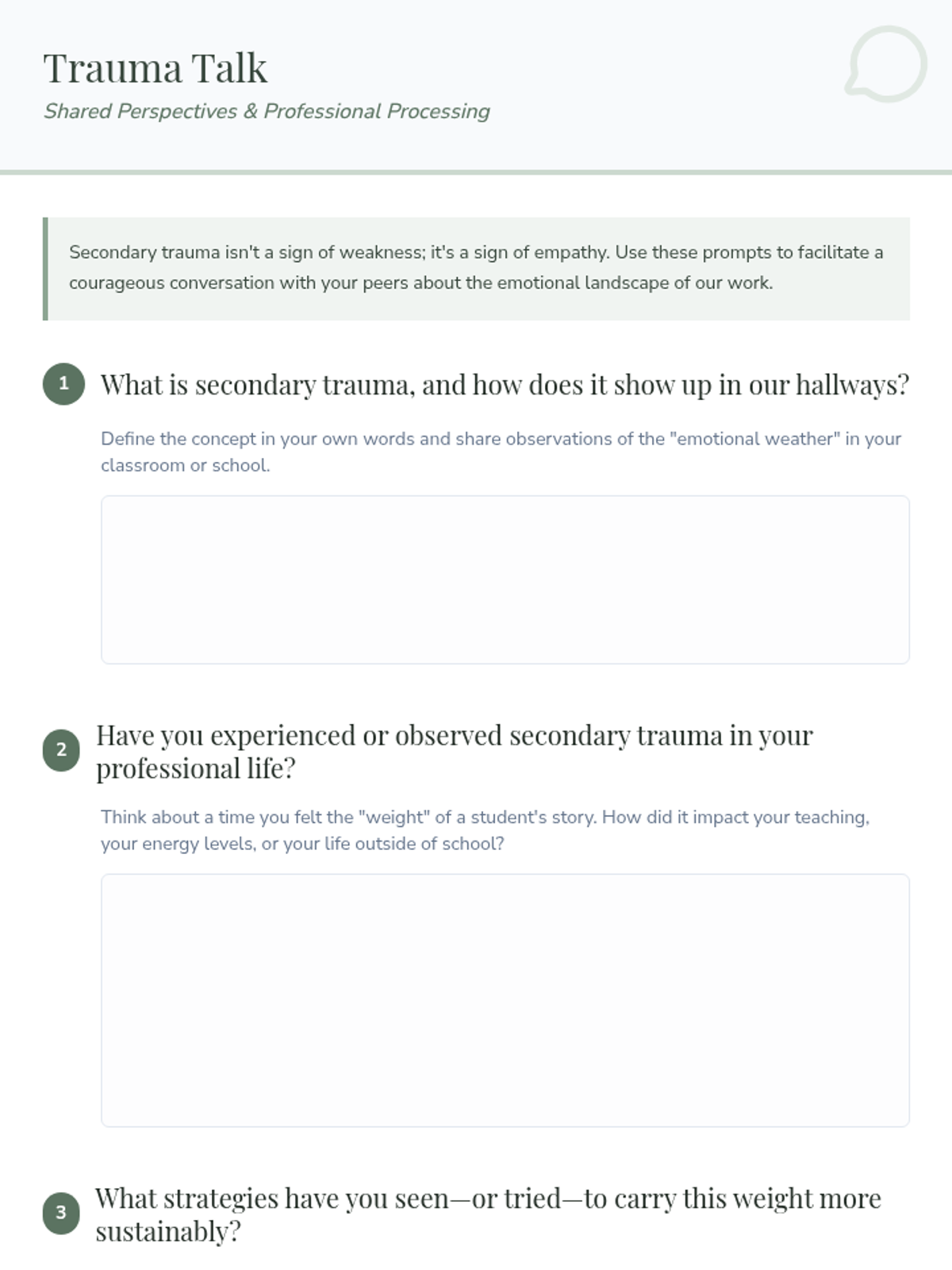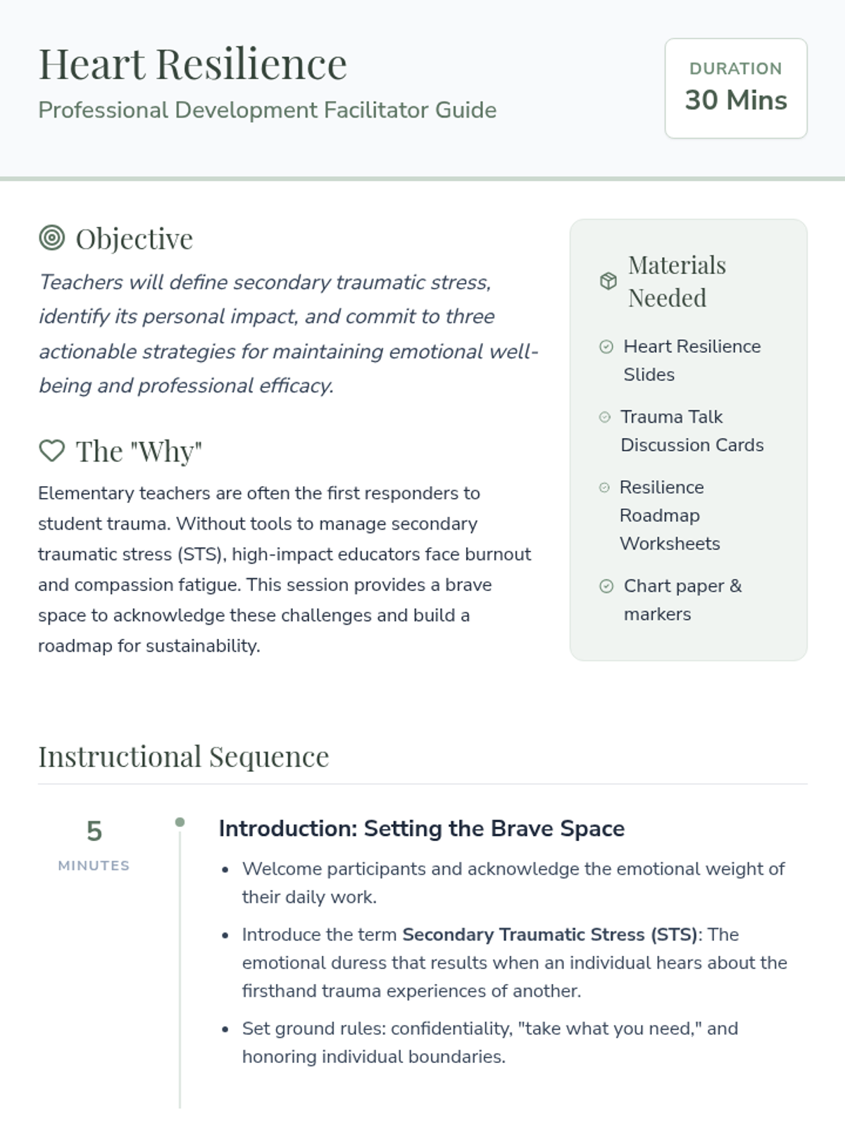 A professional development session for elementary teachers to identify, process, and manage secondary traumatic stress through practical self-care and professional boundaries.