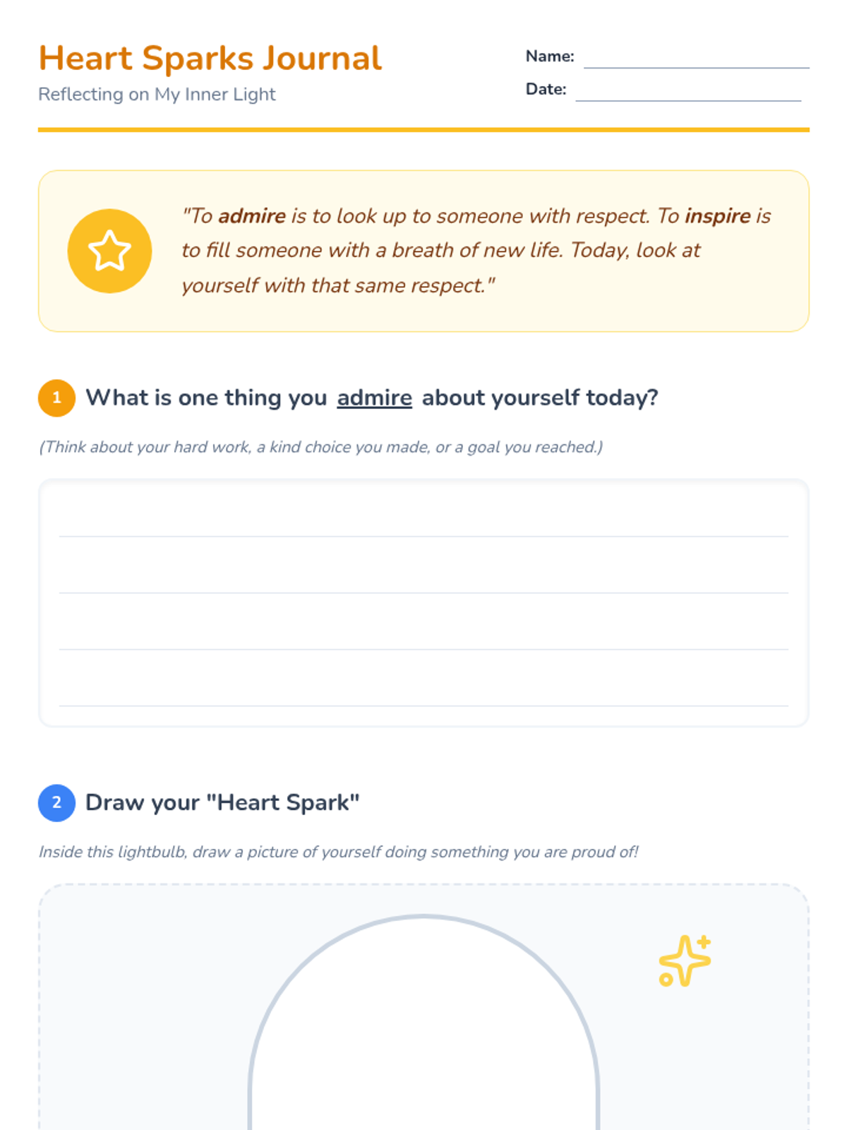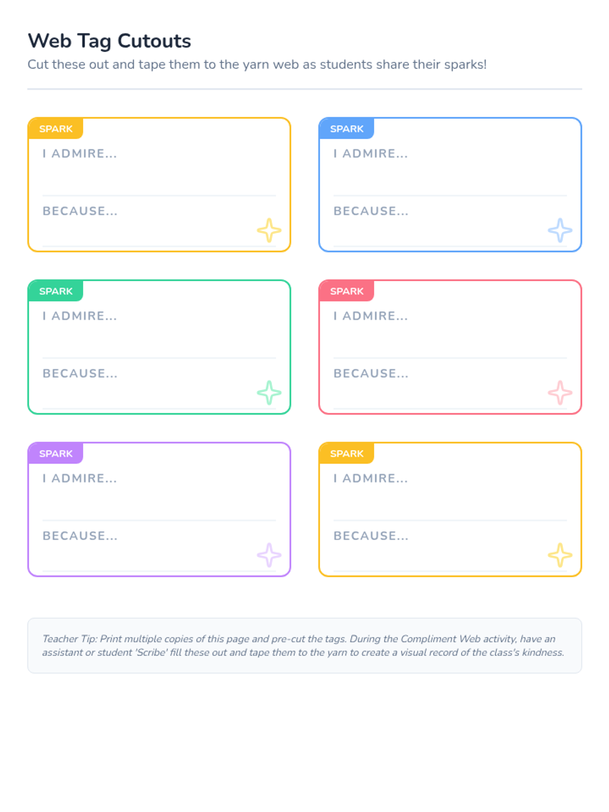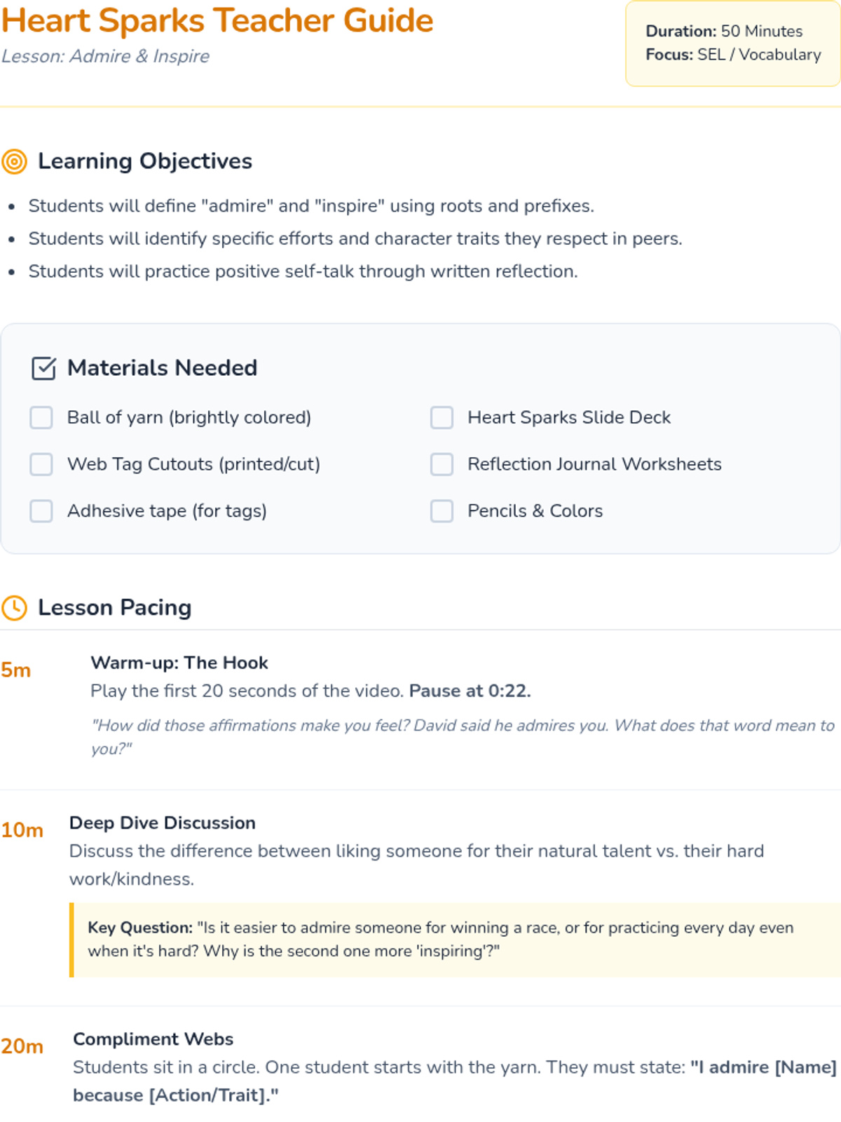 A social-emotional learning lesson focused on building peer respect and self-esteem through the concepts of admiration and inspiration. Students watch a short video, engage in a physical 'Compliment Web' activity, and reflect on their own strengths.
